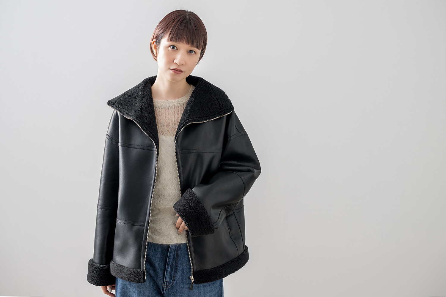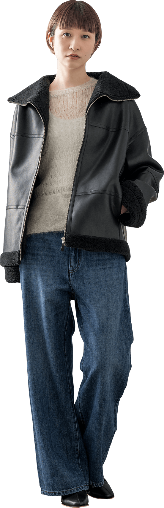 フェイクレザーのショート丈コートで、クールな印象を引き立てる1枚。ニットとデニムと合わせて、モード感とカジュアルさを絶妙にミックス。アップデートされた冬のスタイルに仕上げて。
