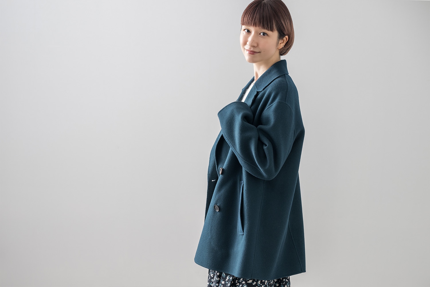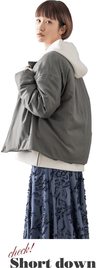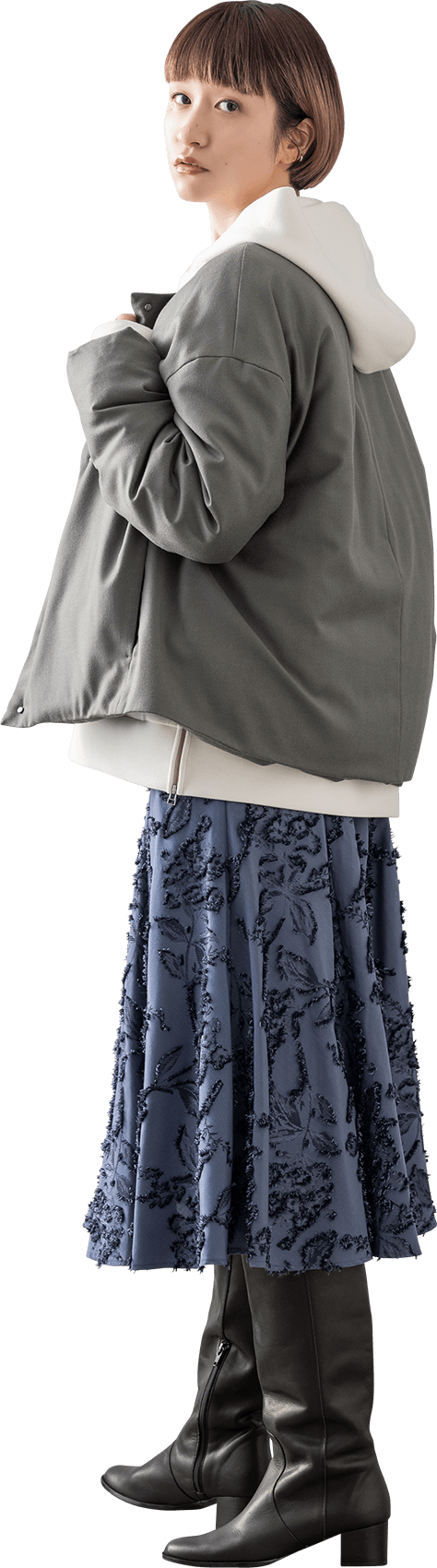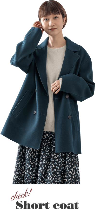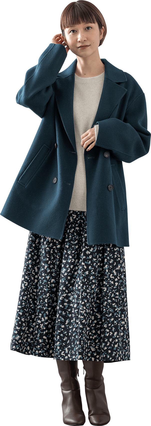 上品なカラーが魅力なショートコート。シックなトーンながらも、柄物スカートを合わせることで華やぎをプラス。冬の日常にもぴったりなマストアウター。