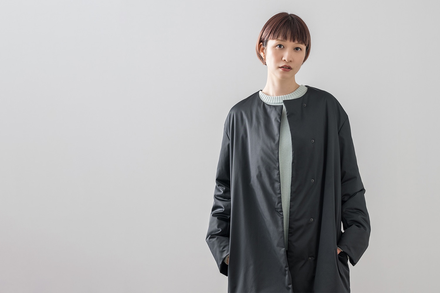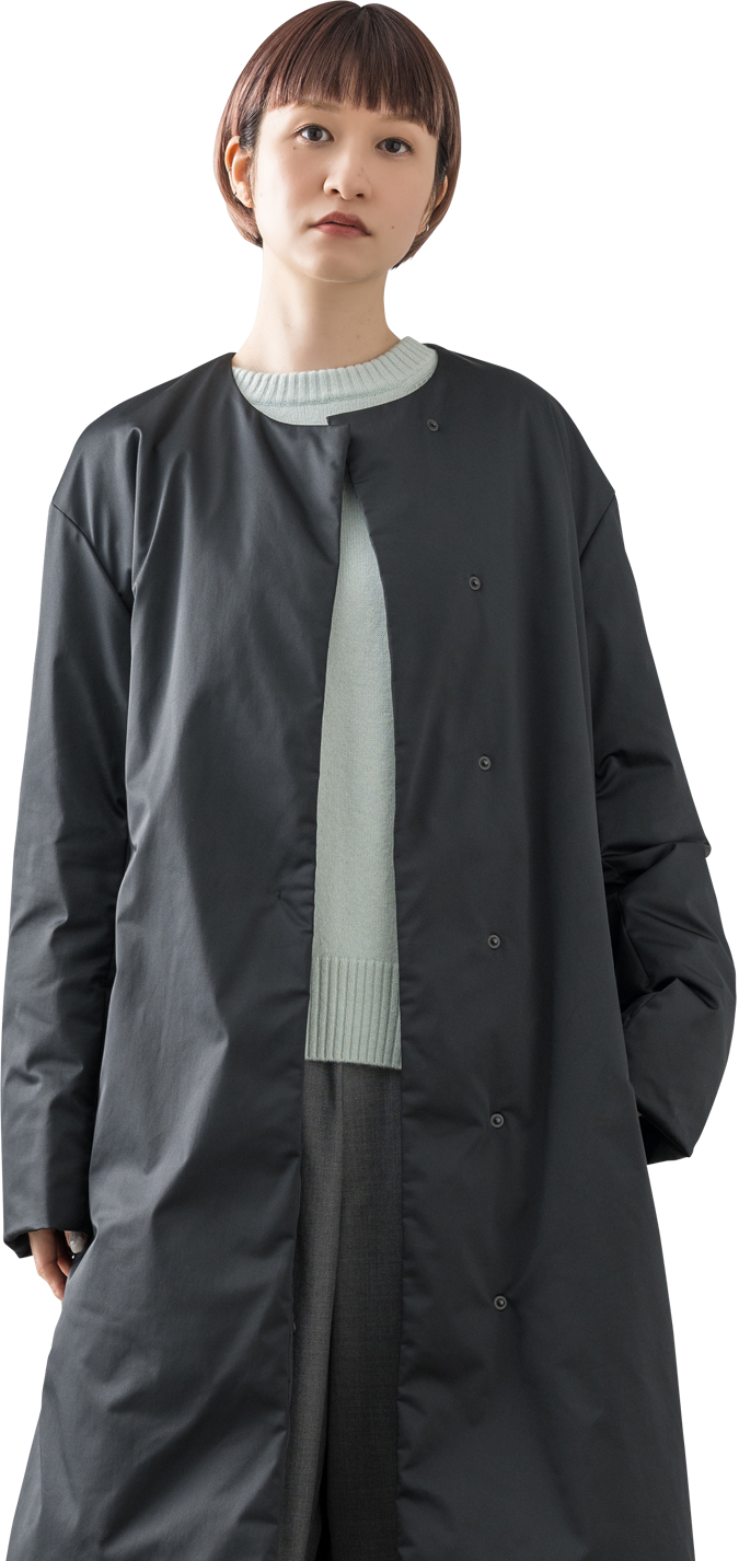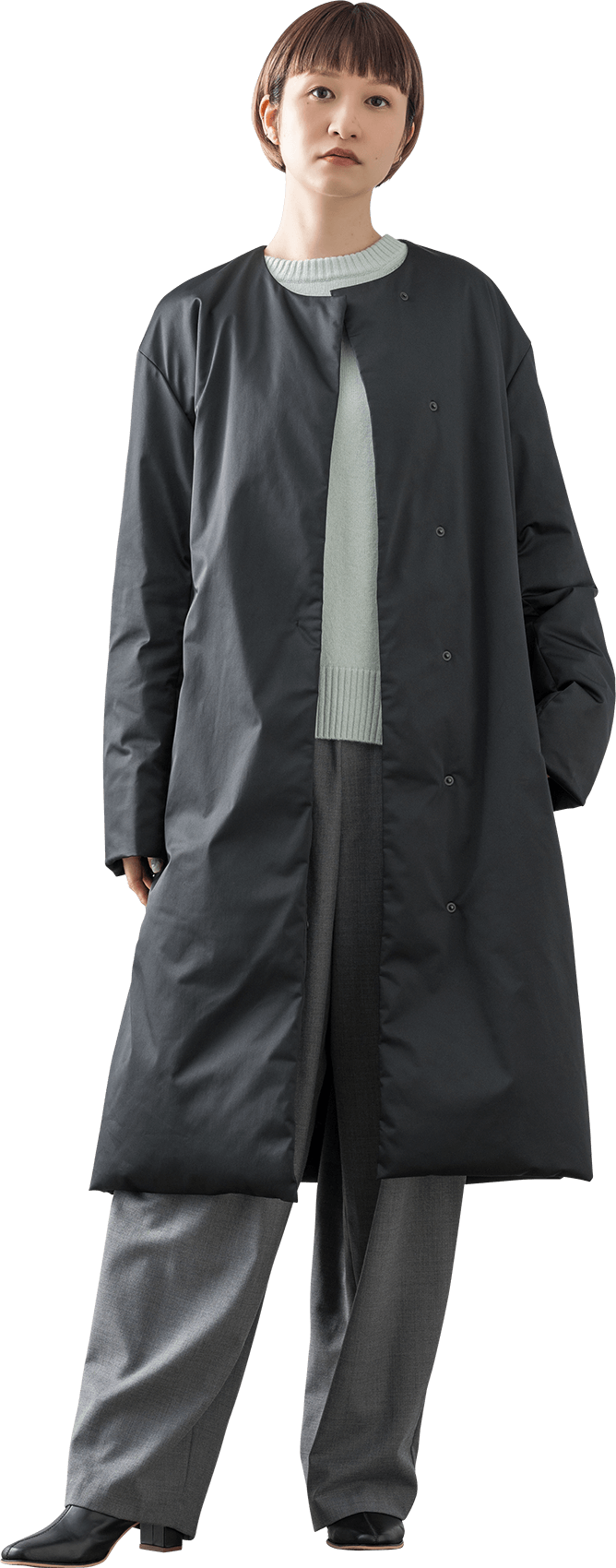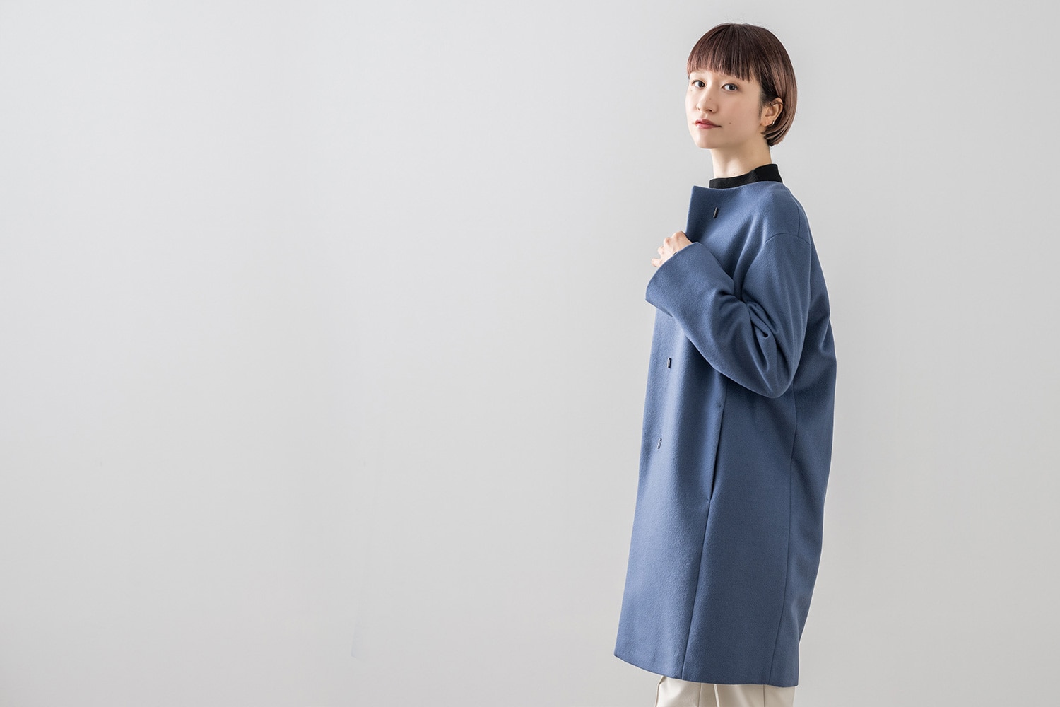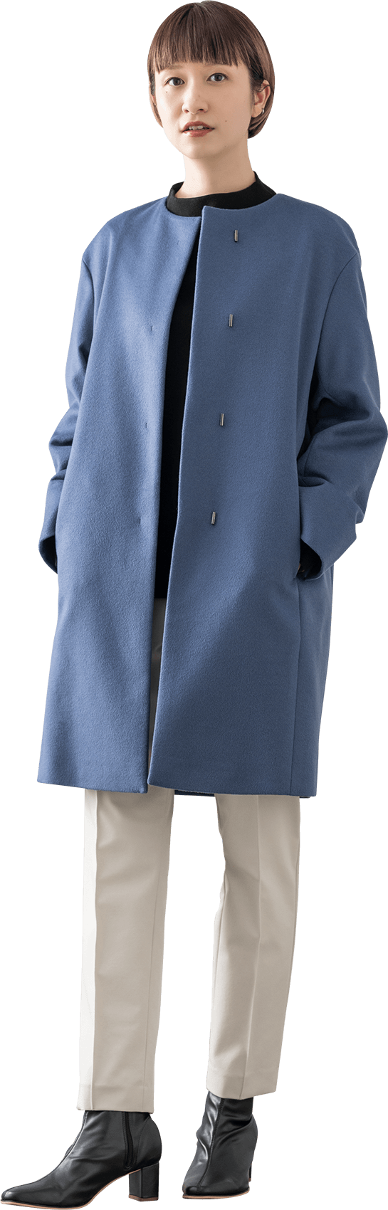 シックなブルーが魅力的なノーカラーコート。羽織るだけで洗練された印象へ。モノトーンコーデにアクセントを効かせたこの冬のシンプルコーデに。