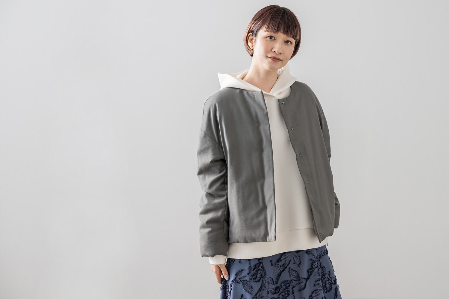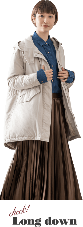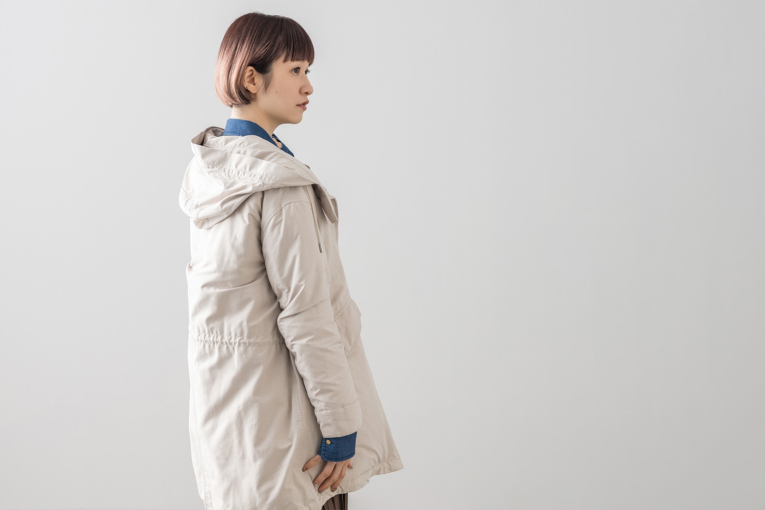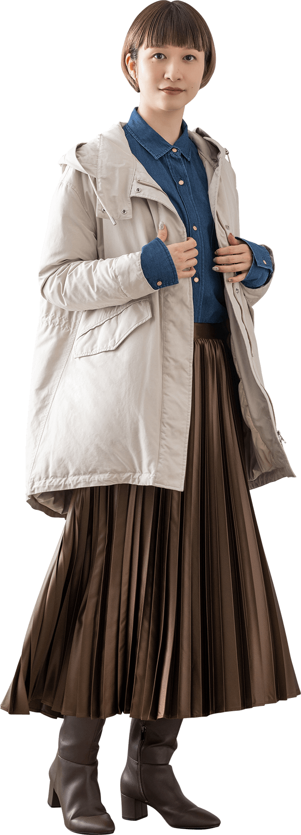フード付きが嬉しい、冬のマストアウター。デニムシャツとプリーツスカートを合わせればリラックス感と女性らしさを両立。カジュアルアウターには毎日のコーデで楽しんで。