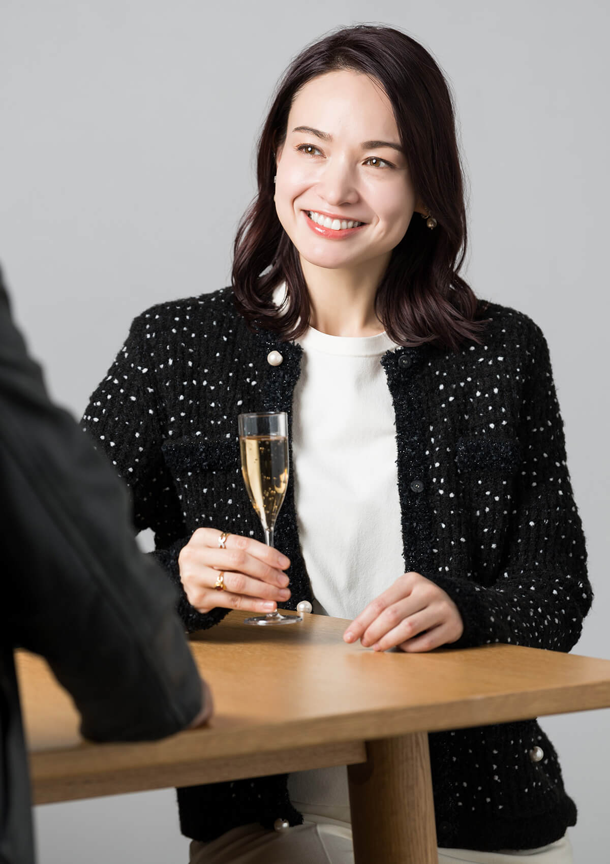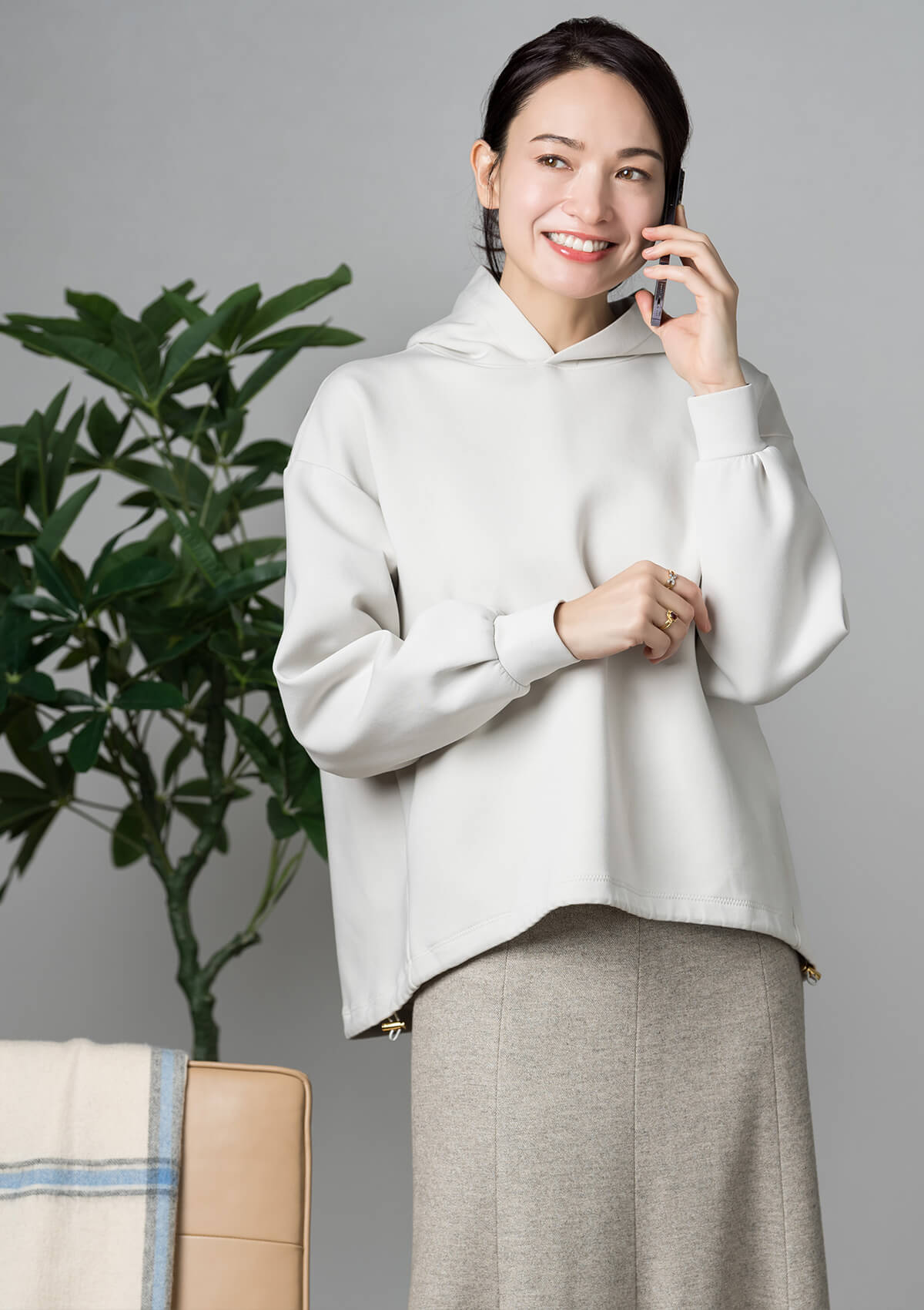 都会のホテルで過ごす、静かな午後。 余白のある時間にこそ、上質な服の心地よさが際立つ。 纏うことで整う、自分だけの贅沢を。