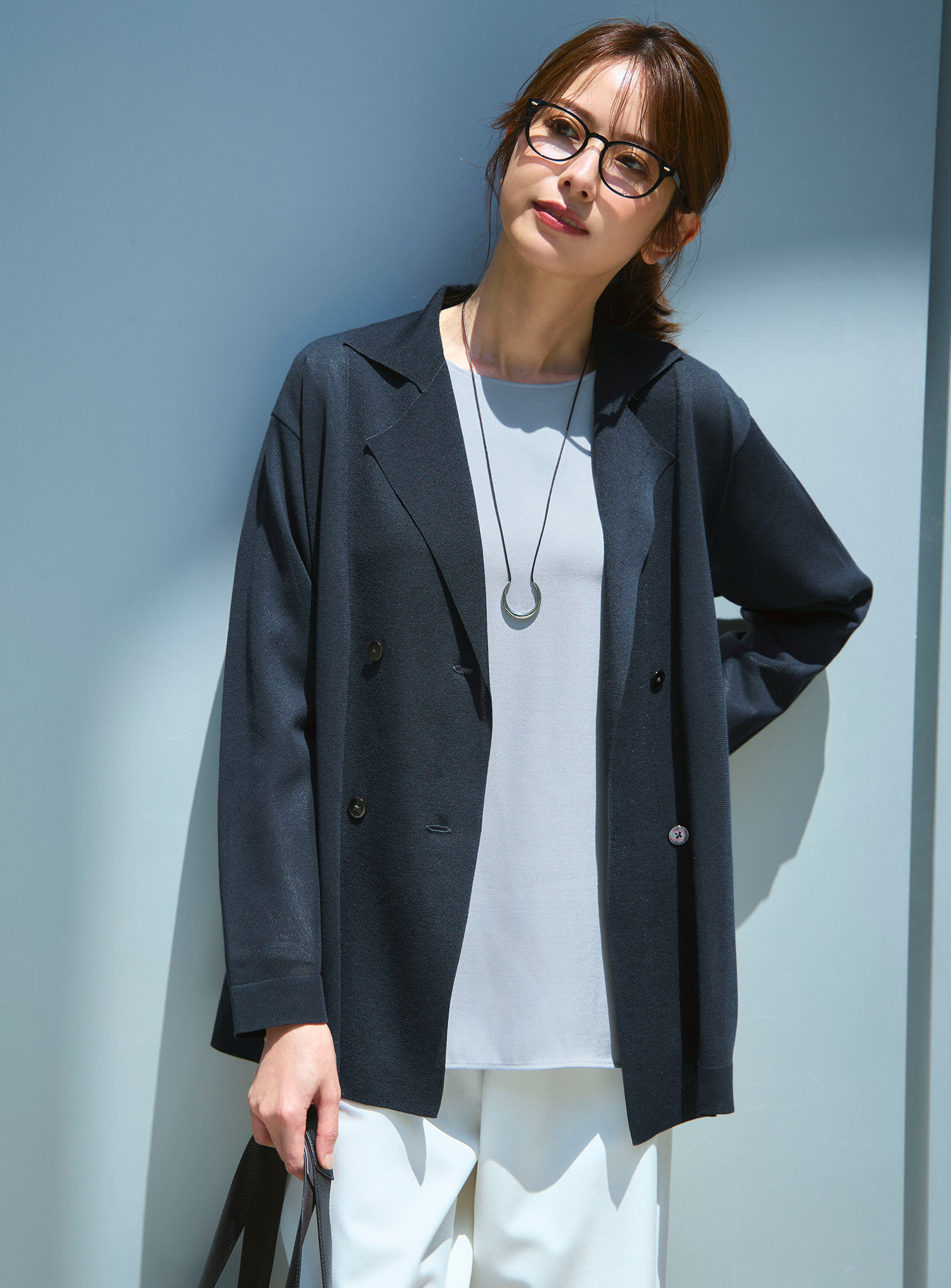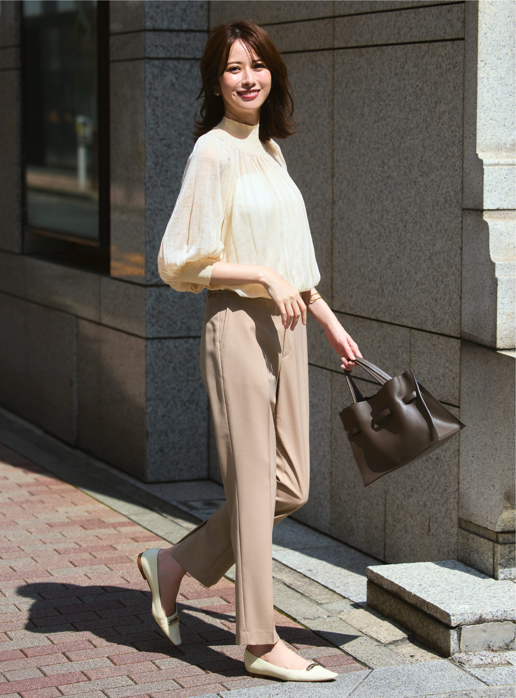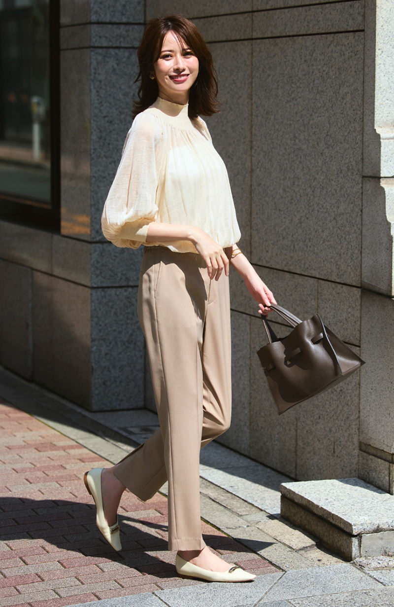 ウールでない素材×袖の透け感で長袖でも重たくなりすぎず、暑い秋通勤におすすめの一枚。