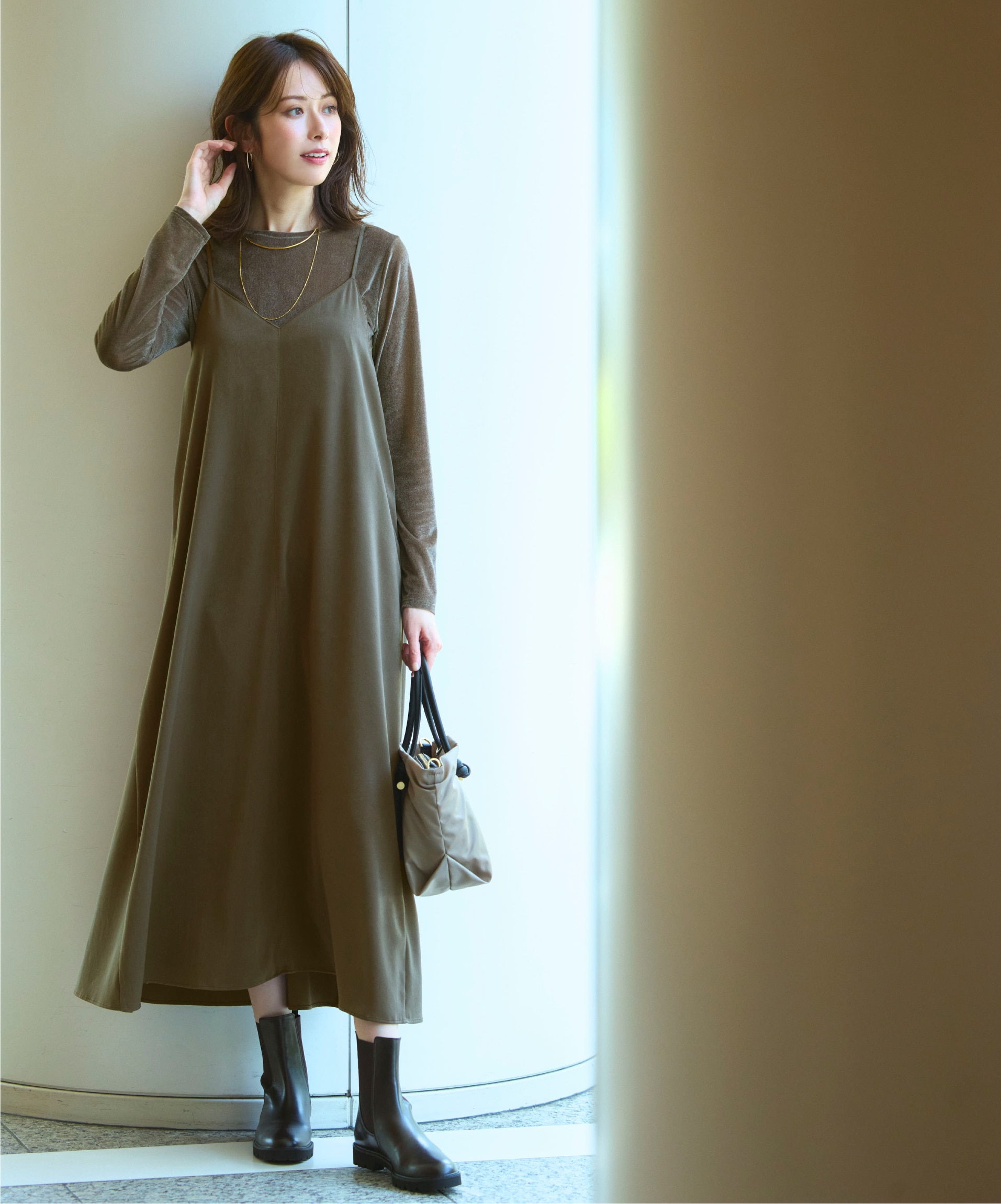 トレンドのベロアを、今年は程よいシアー素材でこなすのが上級テクニック。