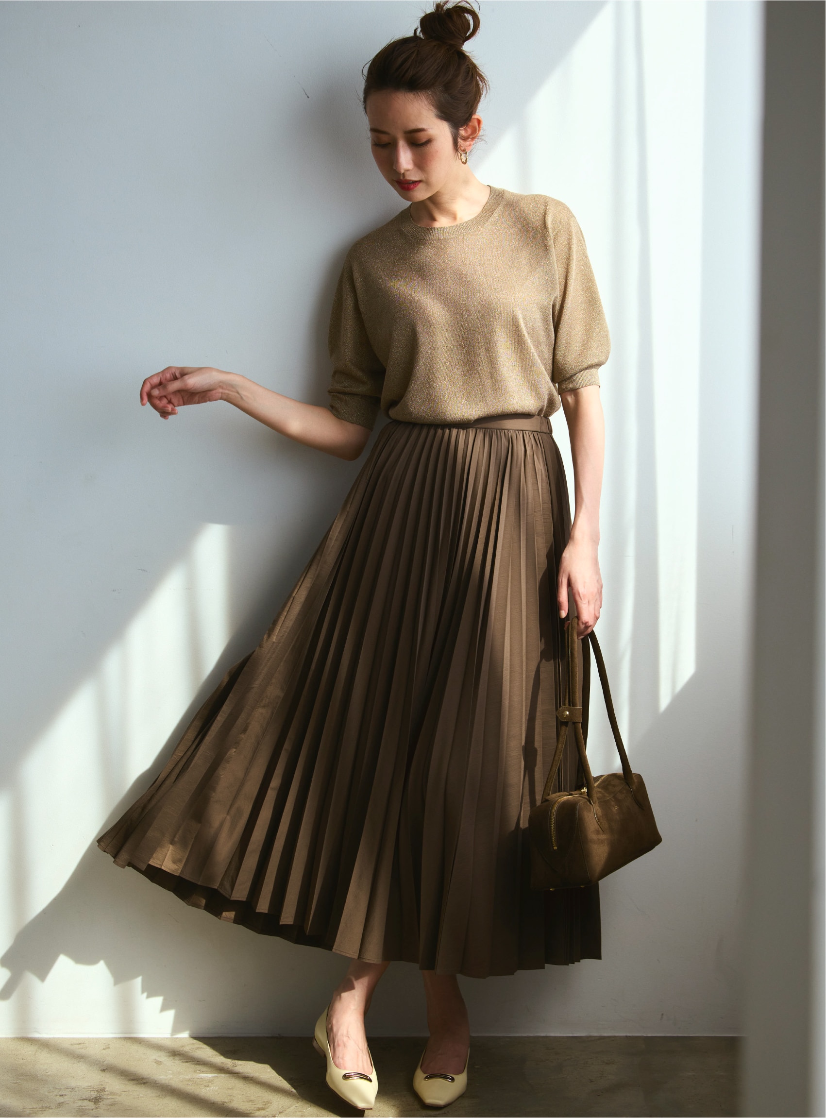 たっぷりな分量で目を引くプリーツスカートと、