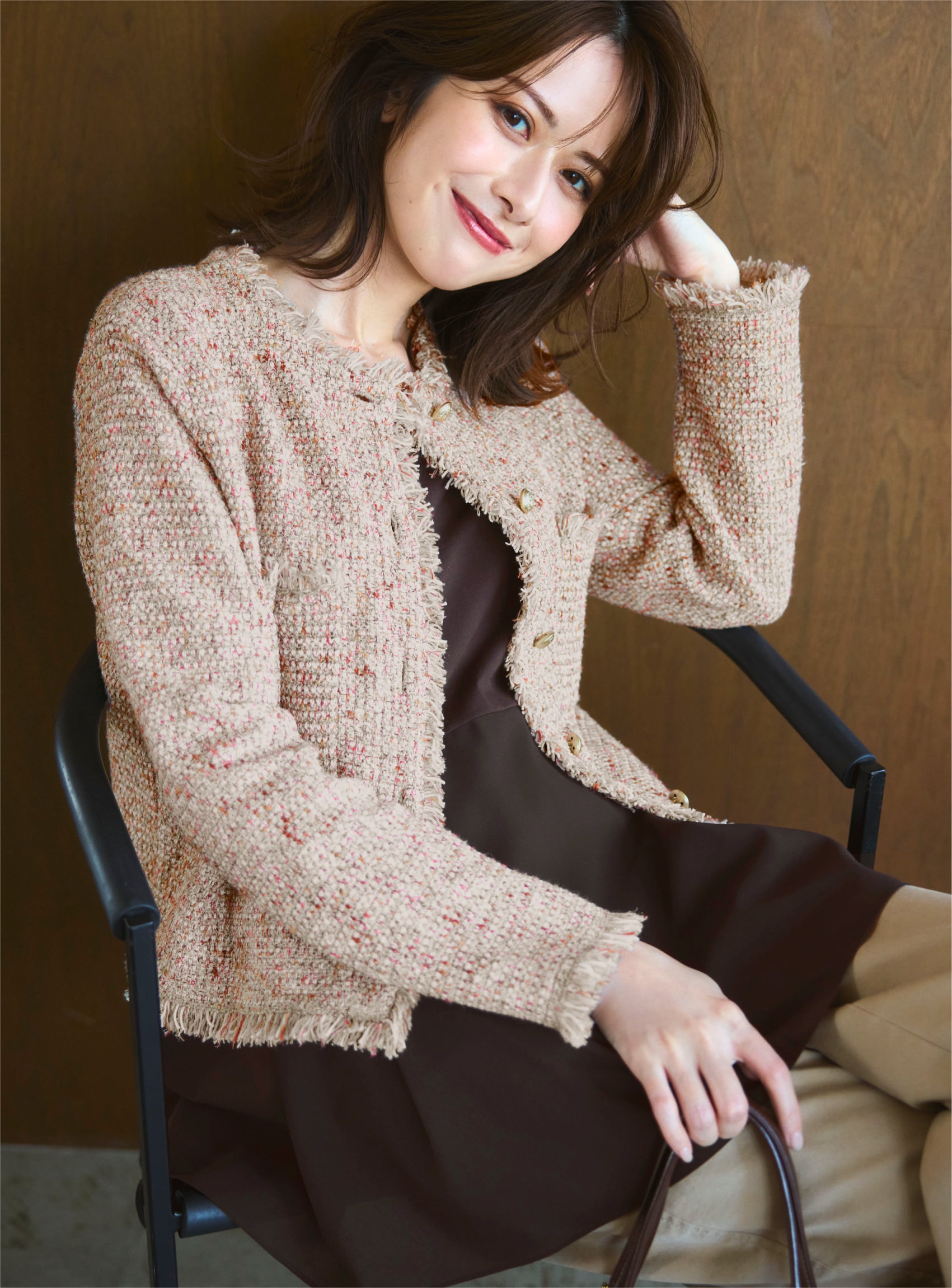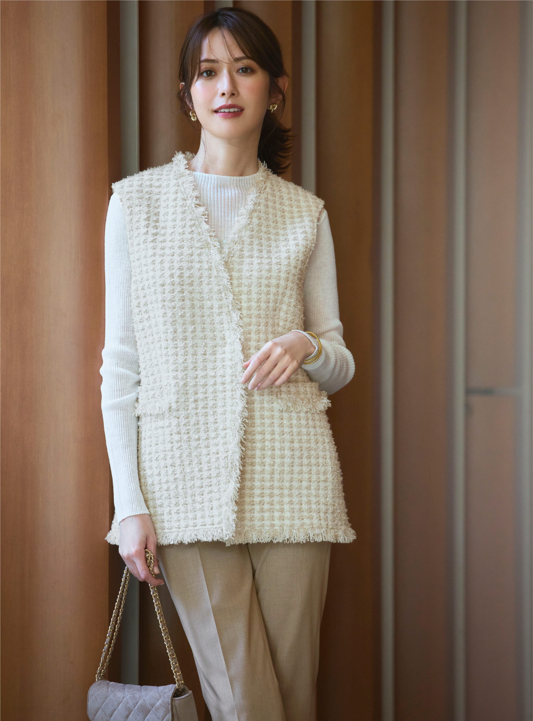 羽織るだけでクラシックな秋スタイルが完成するツイードジレ。