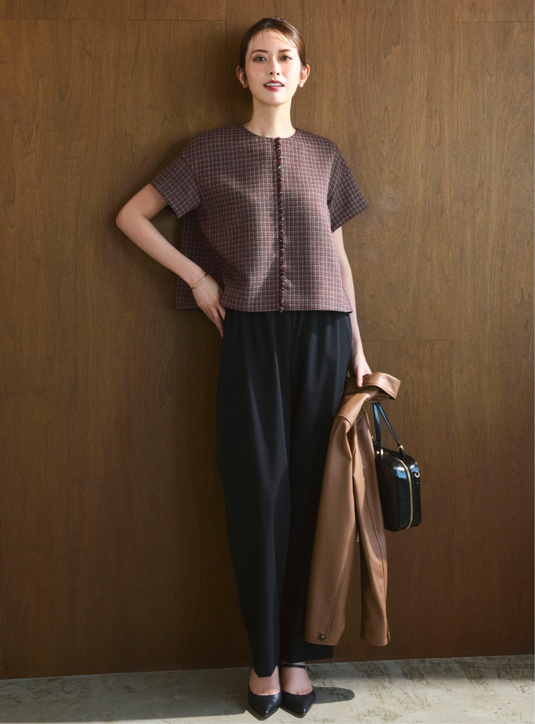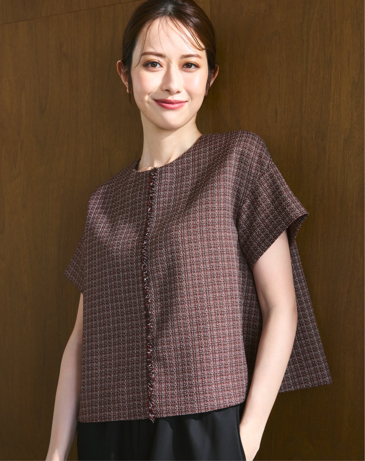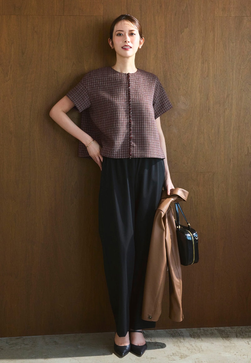 フリンジ使いや後ろのポイントファスナーなど、少しレトロな雰囲気も醸し出すツイードライクブラウス。