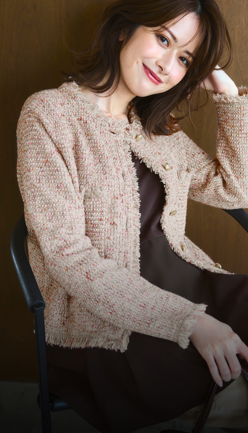 豊かな色彩で織りなすニットツイードジャケットは、金ボタンが煌めきを与え、フリンジ使いが華やかさを与えてくれる。