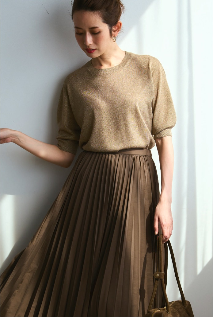 残暑が続く時期にもさらっと着られる五分袖ラメニット。