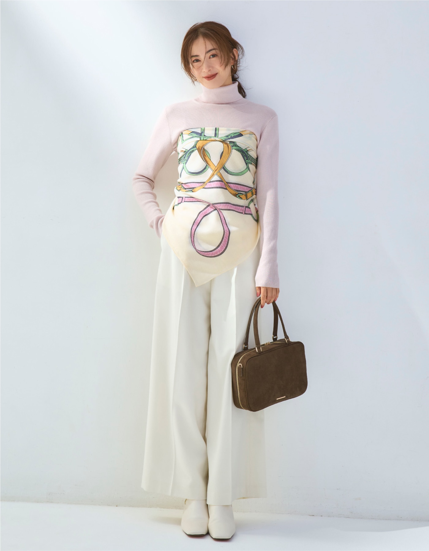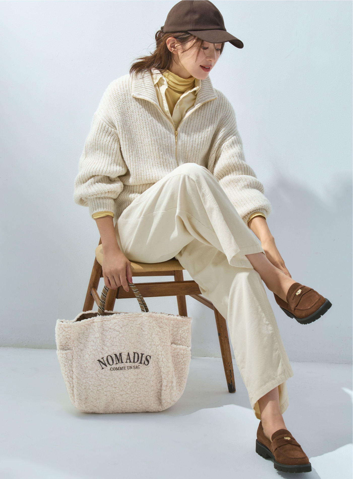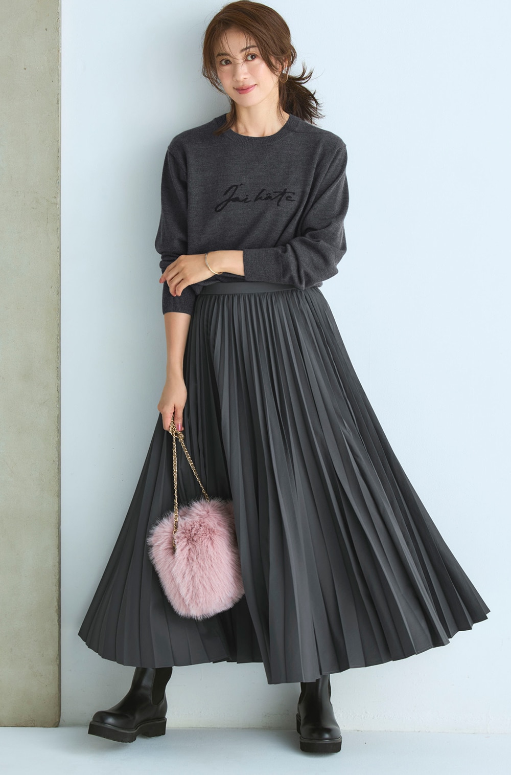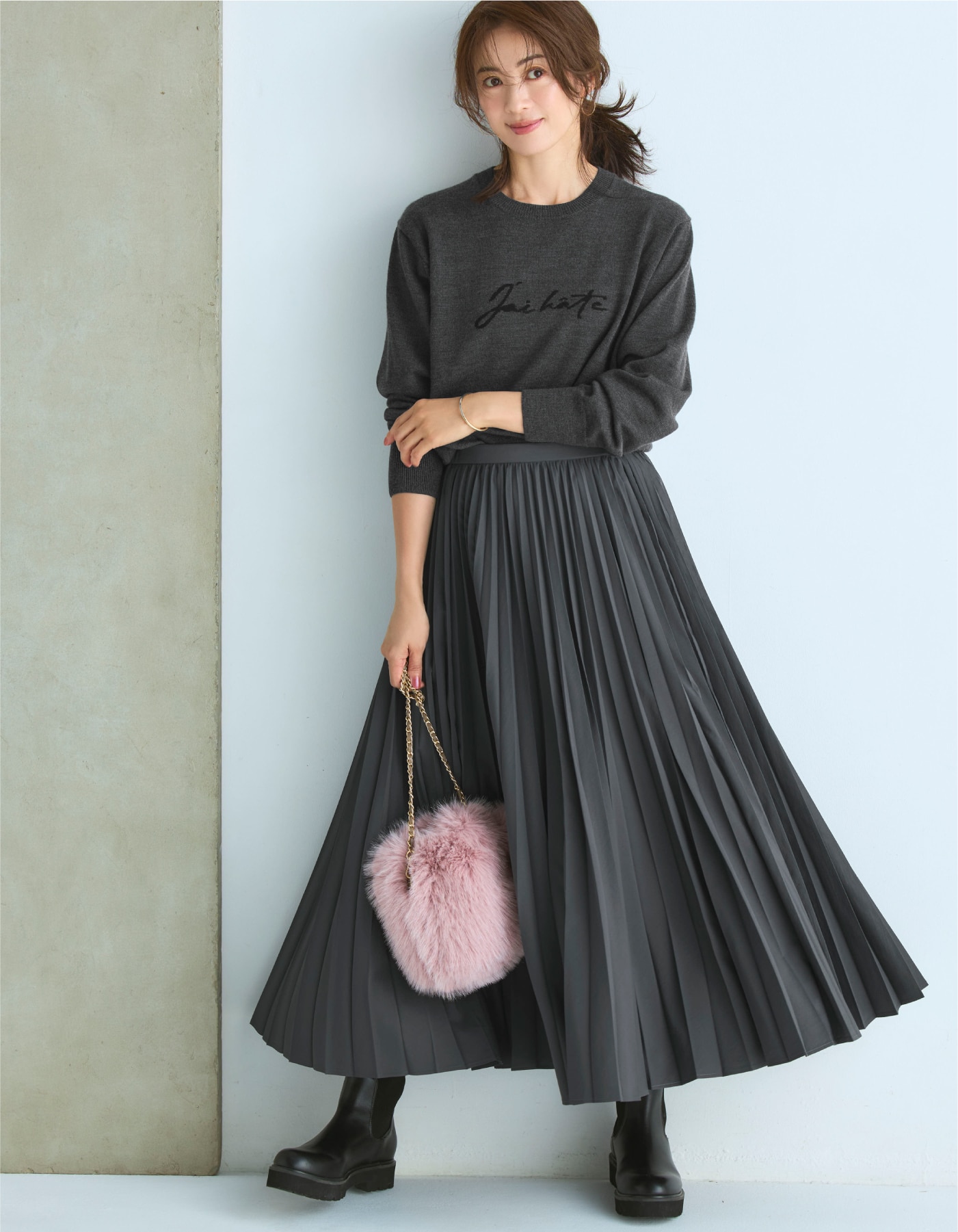 ロゴニットの甘さとピンクファーバッグの華やぎ、