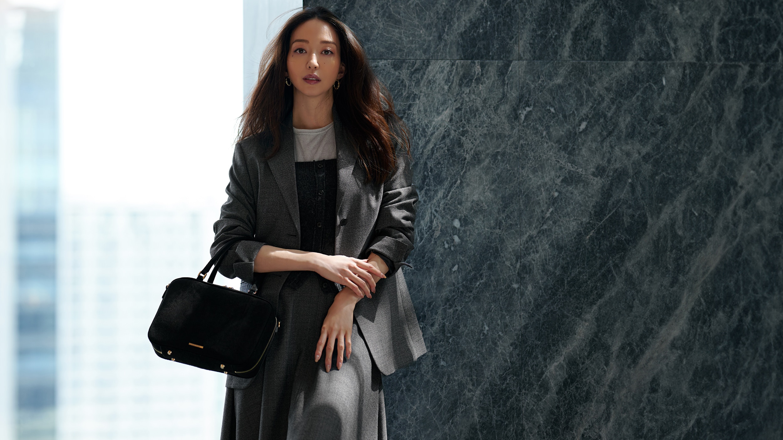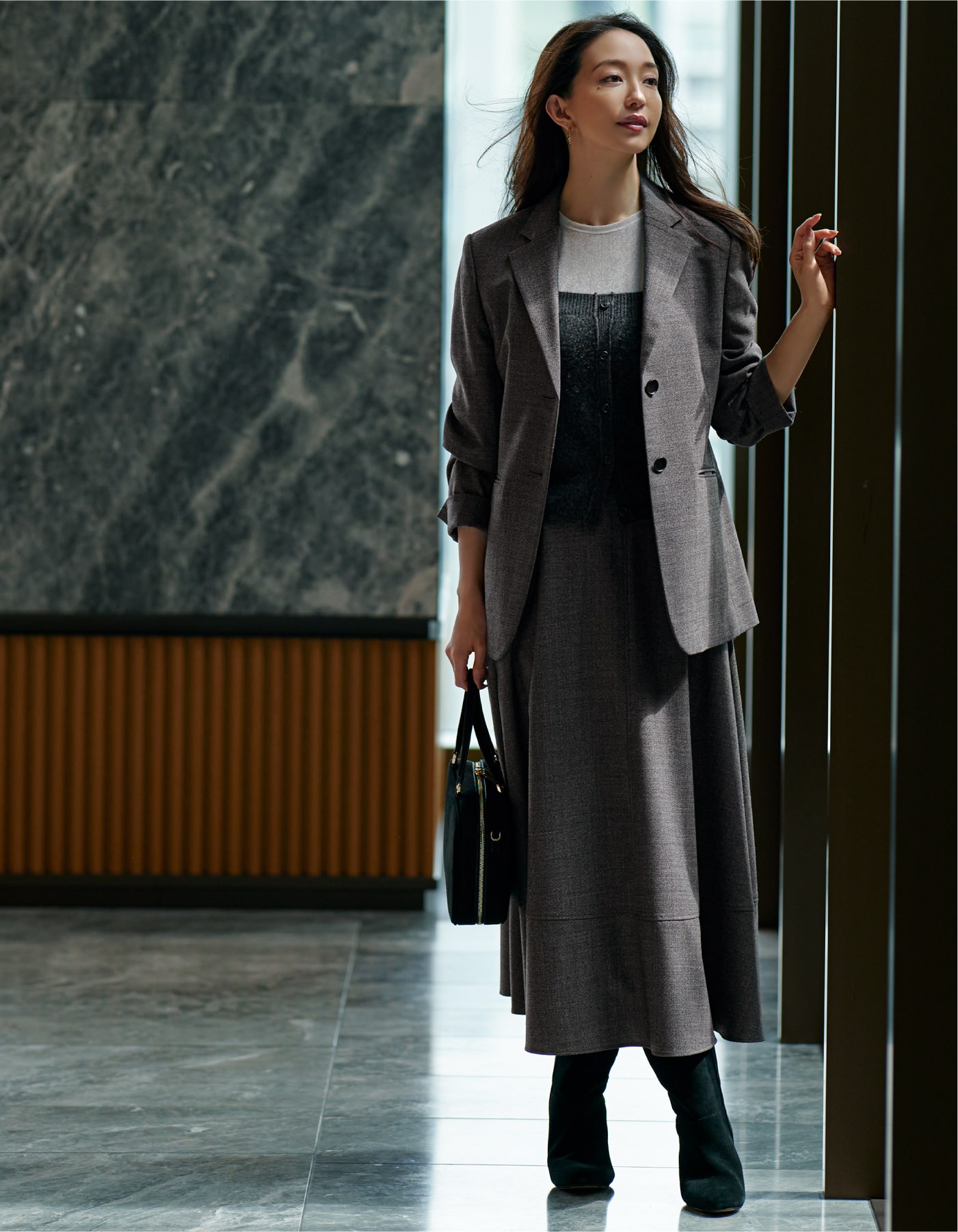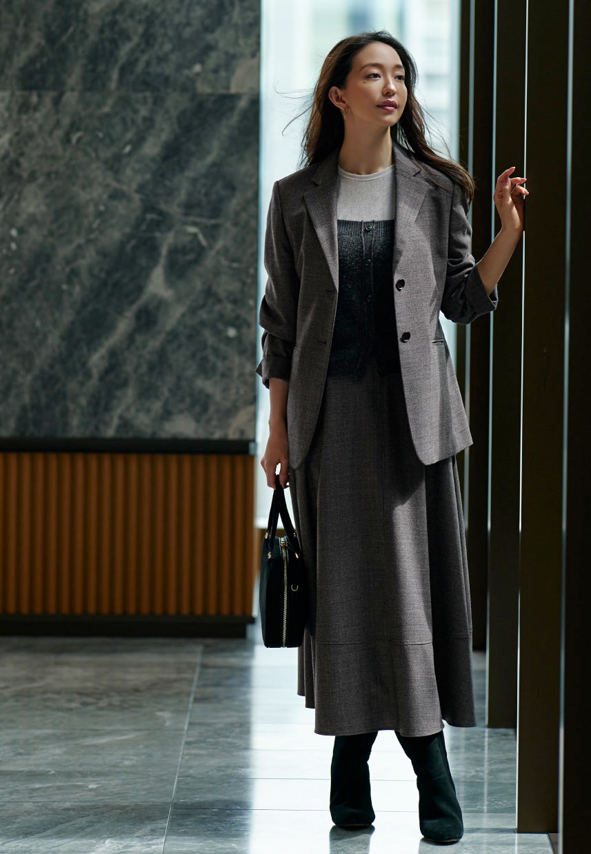 ハンサムなセットアップもスカートを選べば女性らしい印象に。インナーにベロアやビスチェの今年らしいアイテムを差し込みつつ、グレーワントーンで全体をまとめてみて。