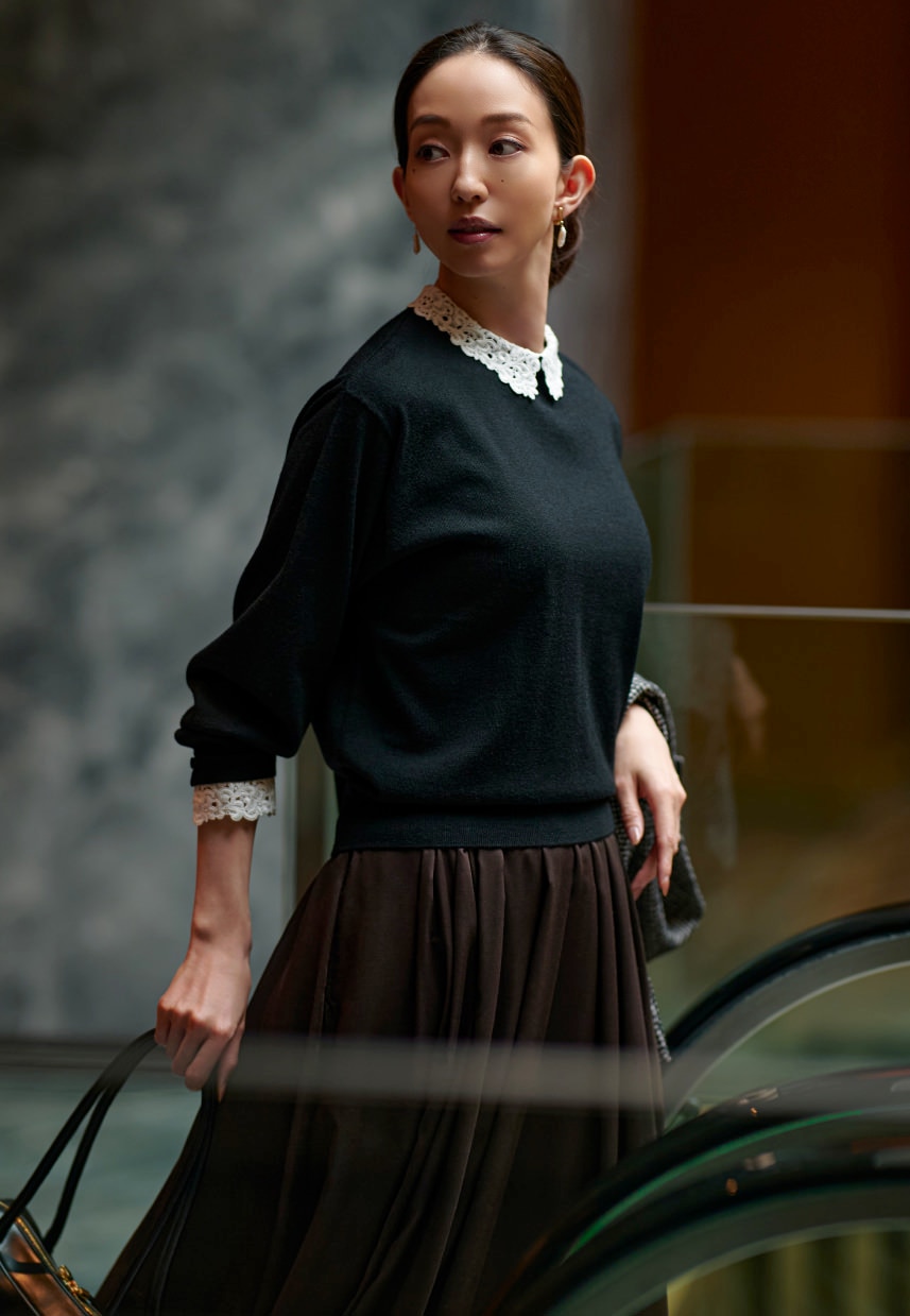 襟のデザインできちんと感をおさえつつ、レースの甘さで柔らかな雰囲気をプラス。色味を抑えたら、お仕事にマストな好印象を与えるスタイリングが完成。