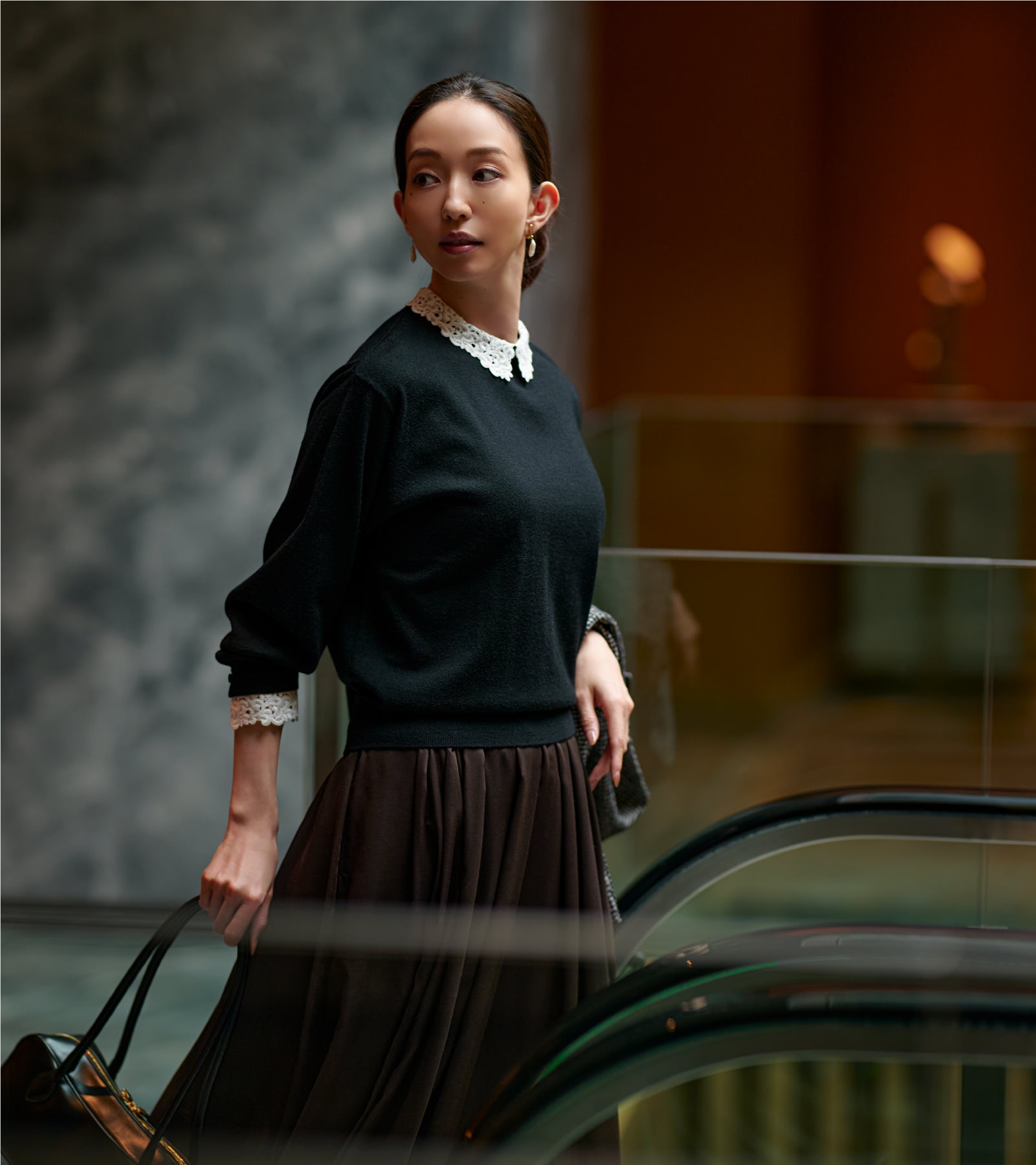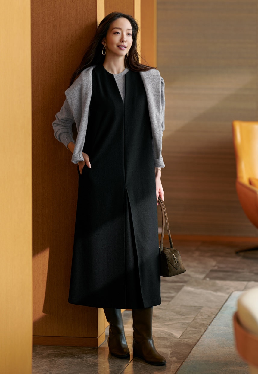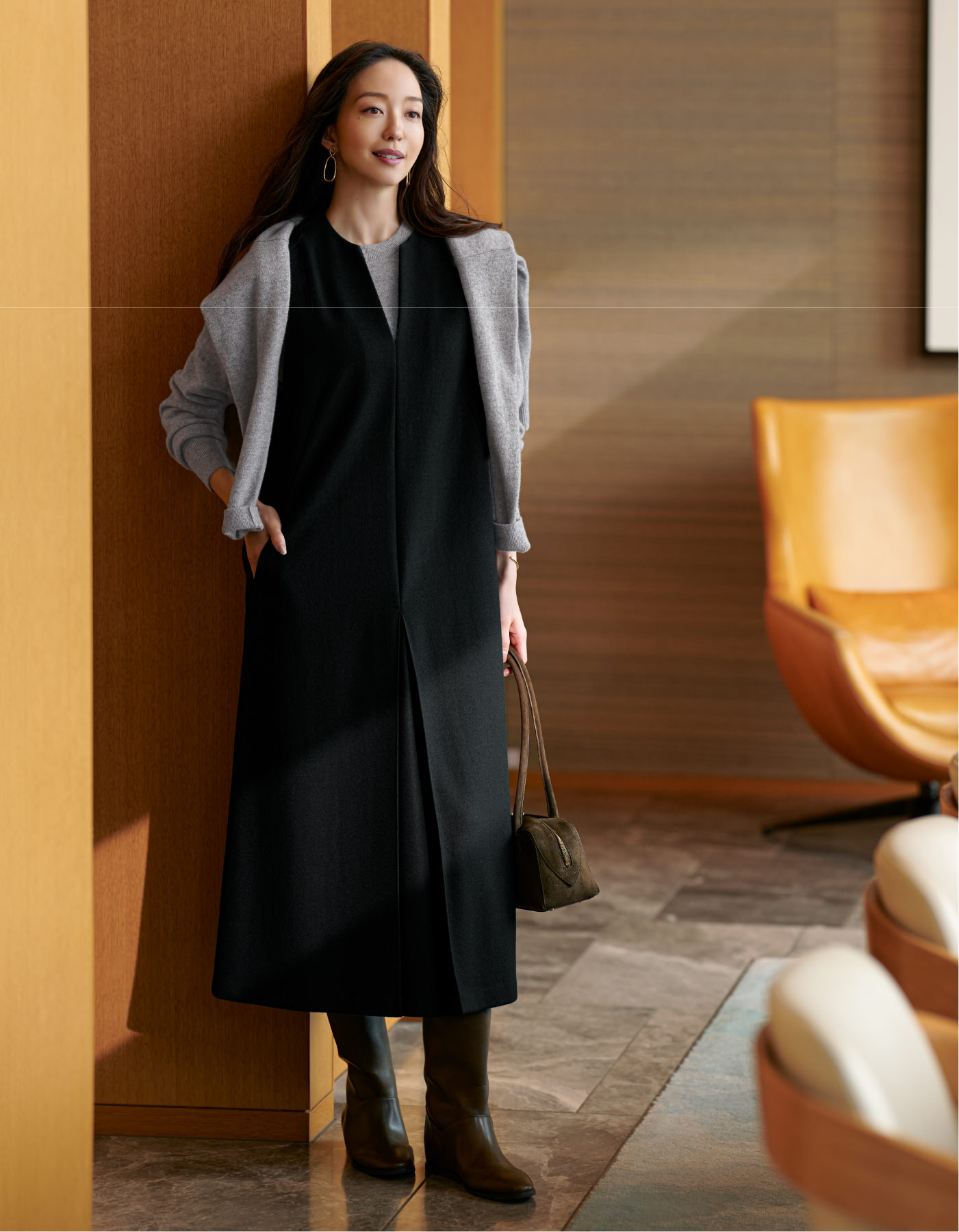 上質なウールのワンピースにあえてゆとりのあるカシミヤニットをレイヤード。それぞれの素材が持つ柔らかな風合いが、秋の空気を運んでくる。