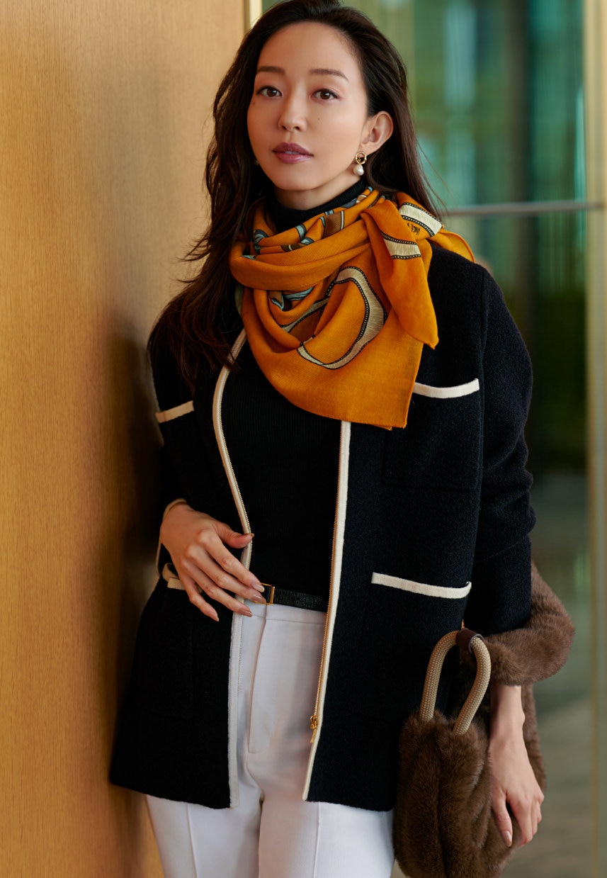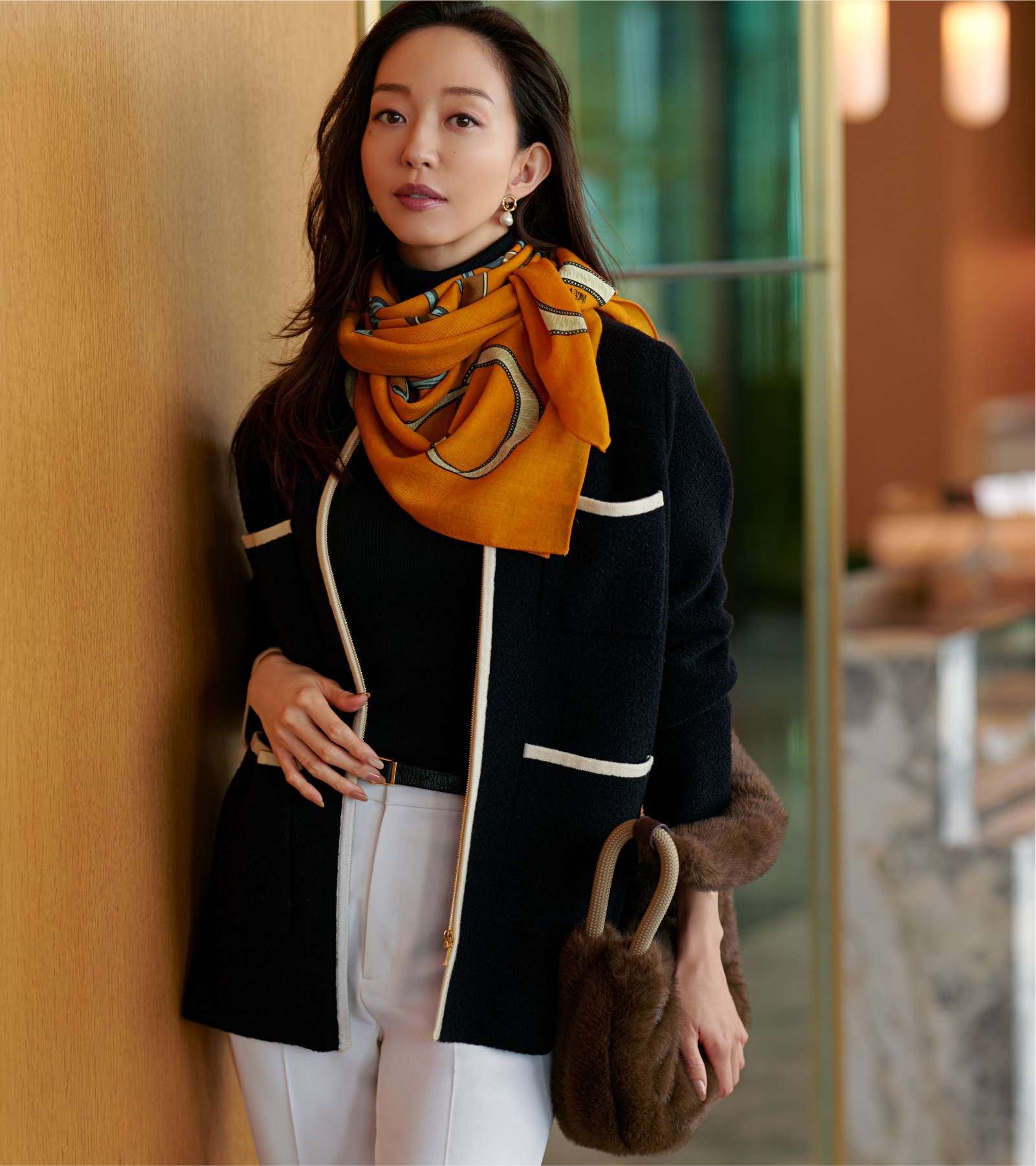 首元にストールをONすることで、華やぎがプラスされる。いつものシンプルなお仕事服が簡単にアップデートできるテクニック。