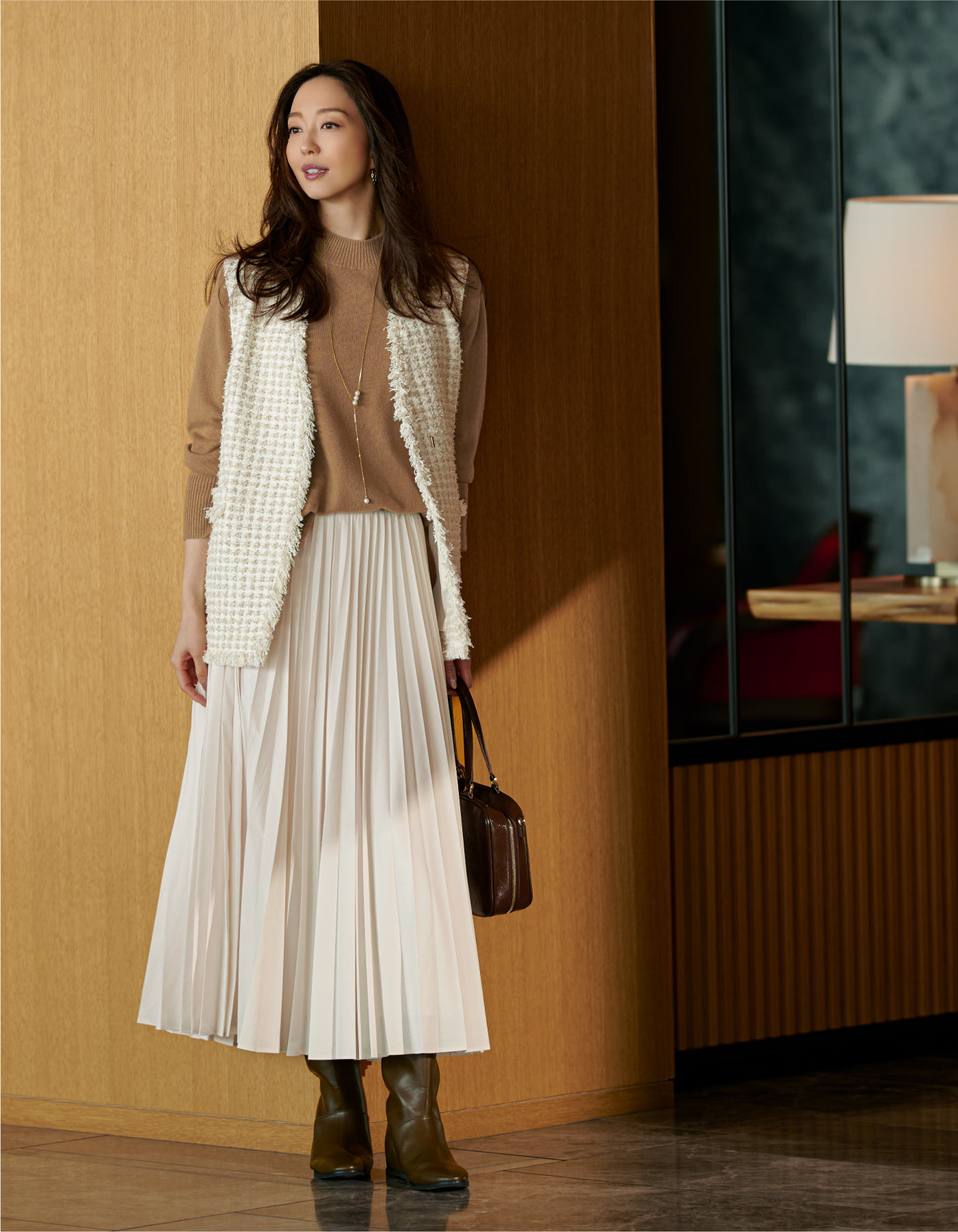 上品さをたずさえたプリーツスカートは、オフィススタイルに必須のアイテム。今年らしいツイードジレを合わせることで、トレンドも取り入れて。