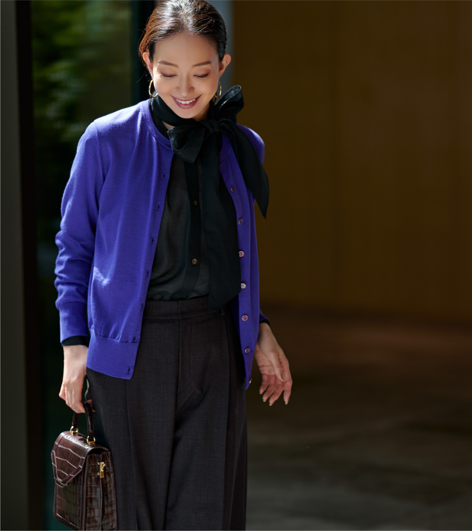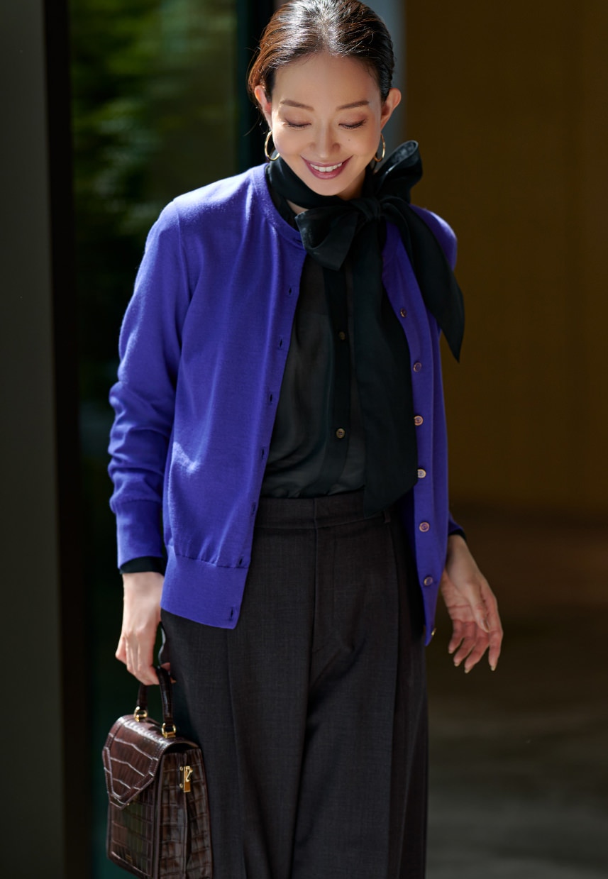 目を惹く知的なブルーが、凛とした印象を与えてくれるカーディガンを主役に据える。品の良さはそのままに、サイドに流したボウタイ使いで新しさを加えて。