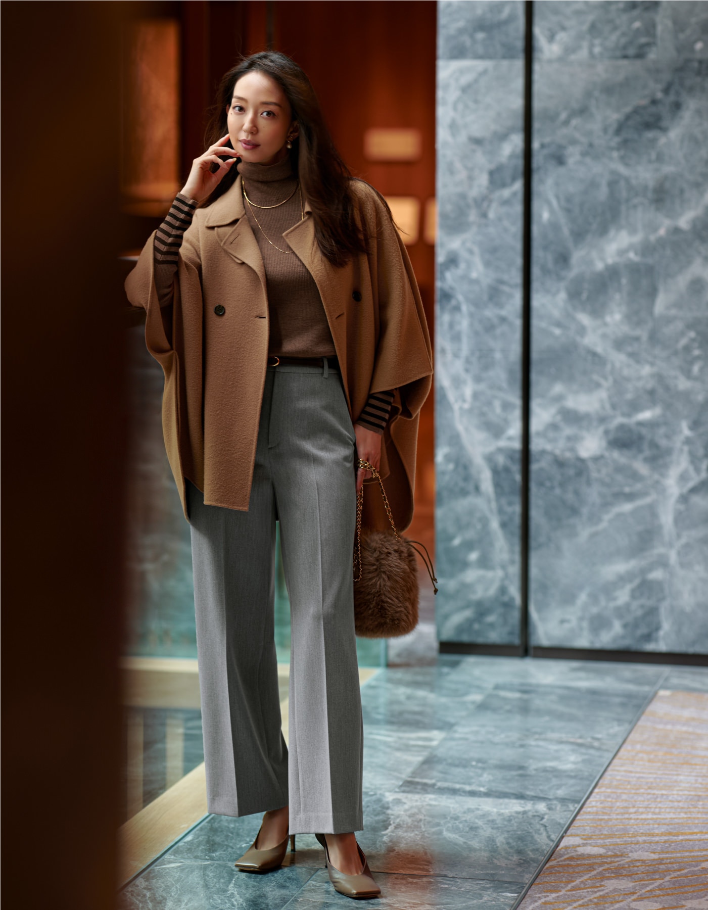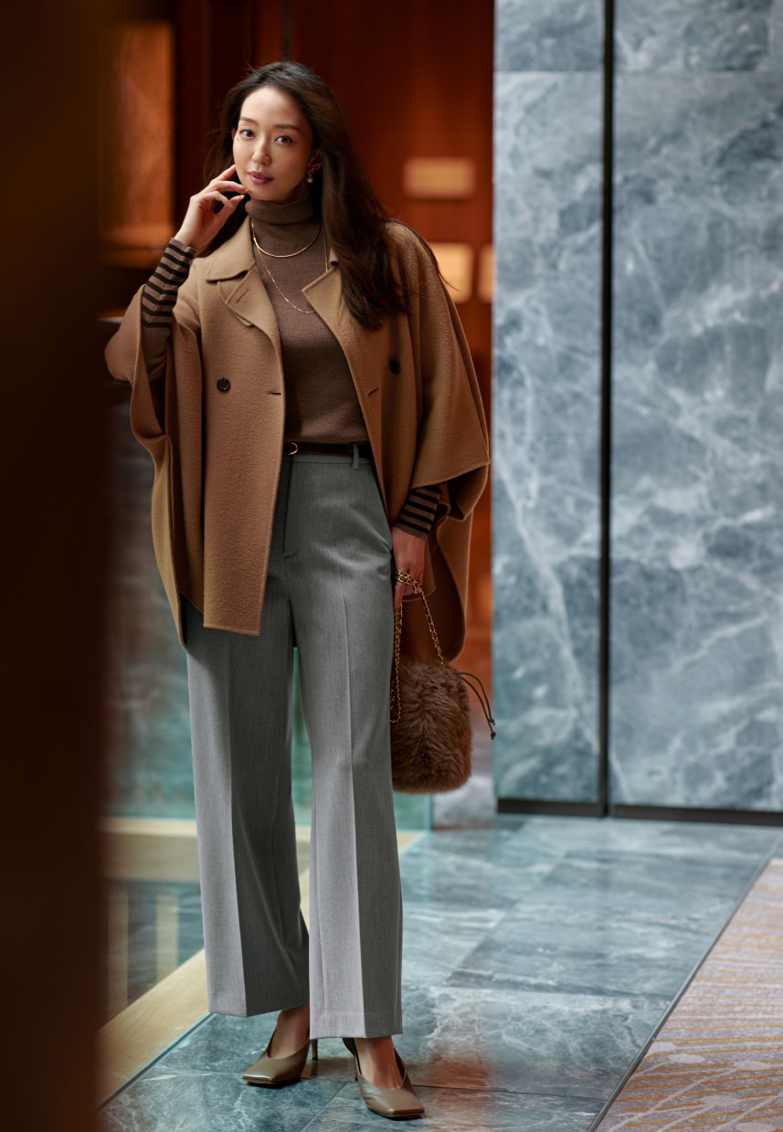 グレーのパンツでほっこりしがちなキャメルをモダンに昇華させて。広がりすぎないワイドシルエットは、活躍の場を選ばない万能な逸品。
