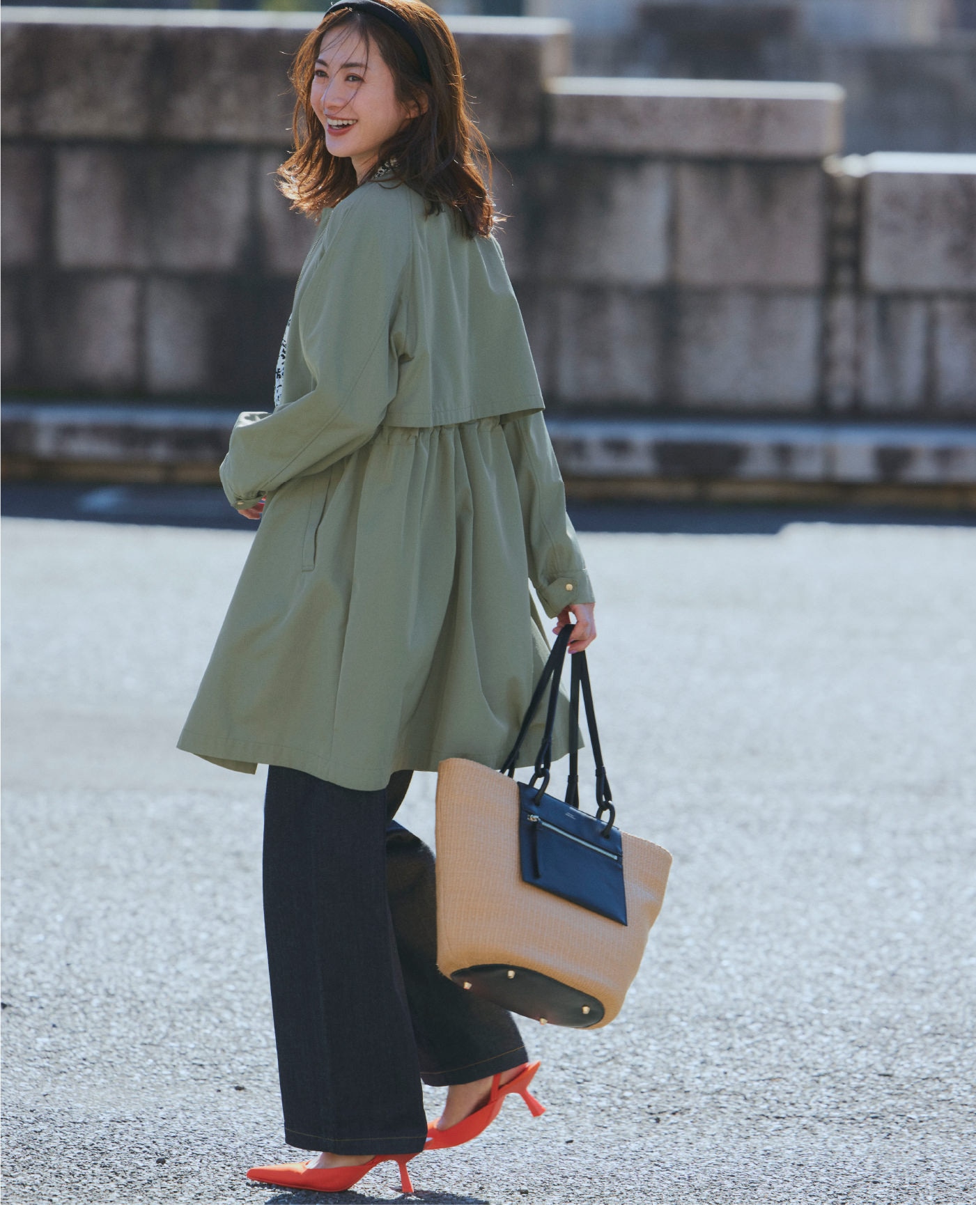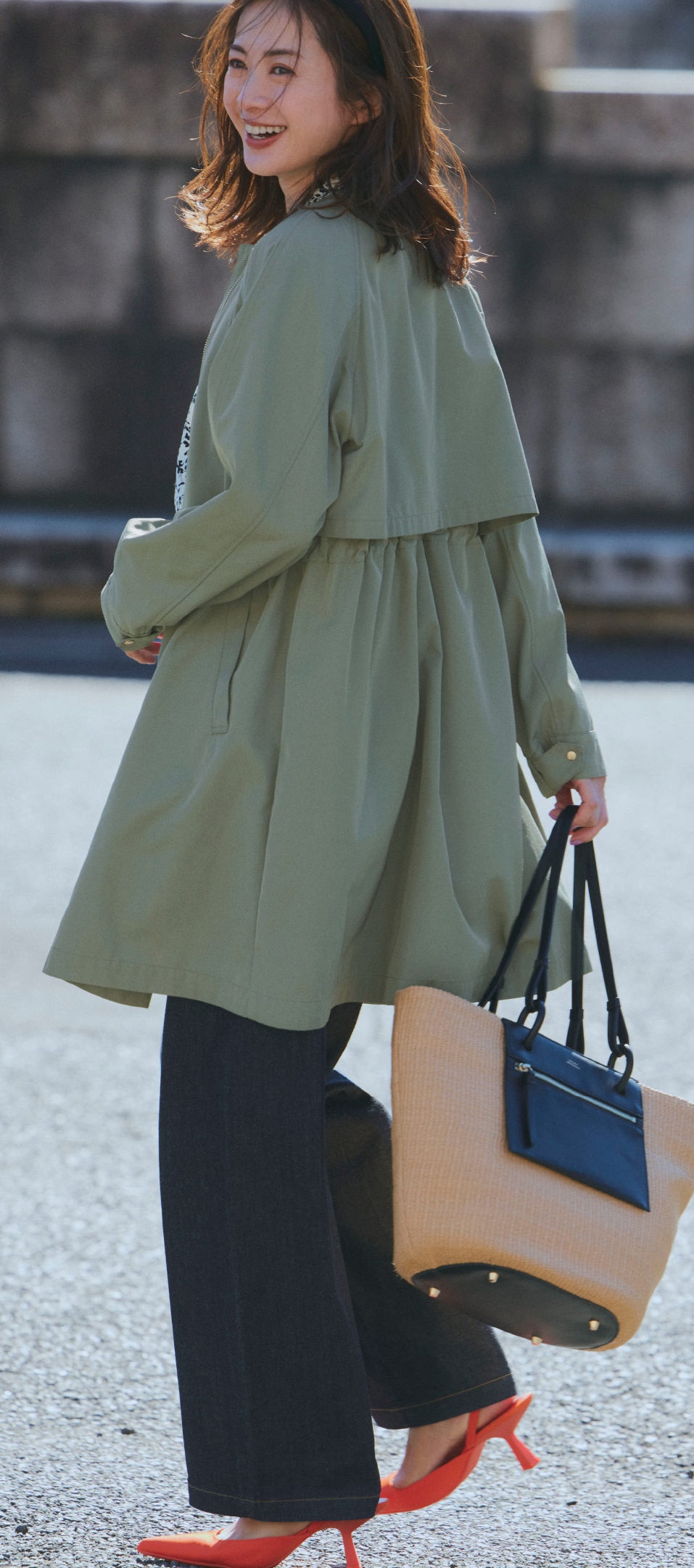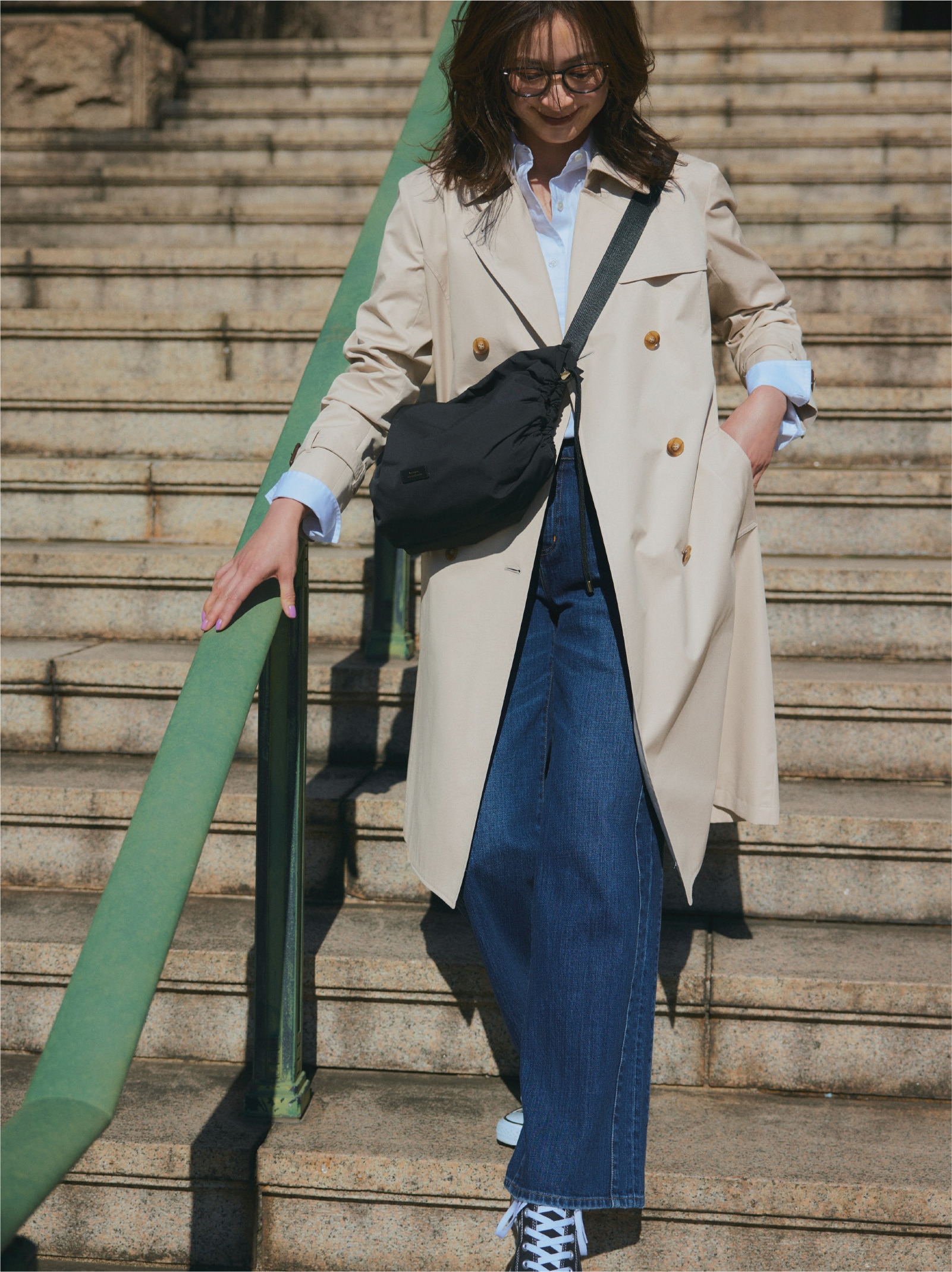 まろやかでナチュラルな色味のベージュは春の鉄板カラー。トレンチをシャツ×デニムのカジュアルダウンで楽しんで。