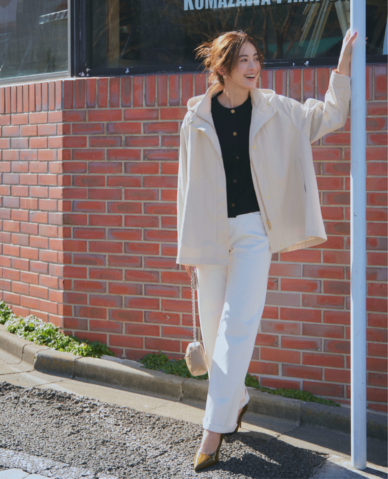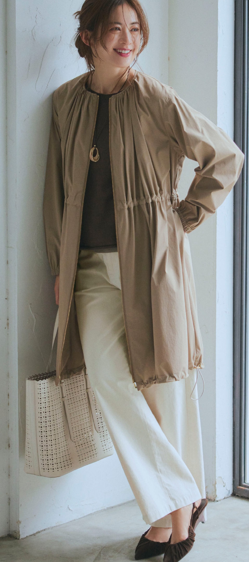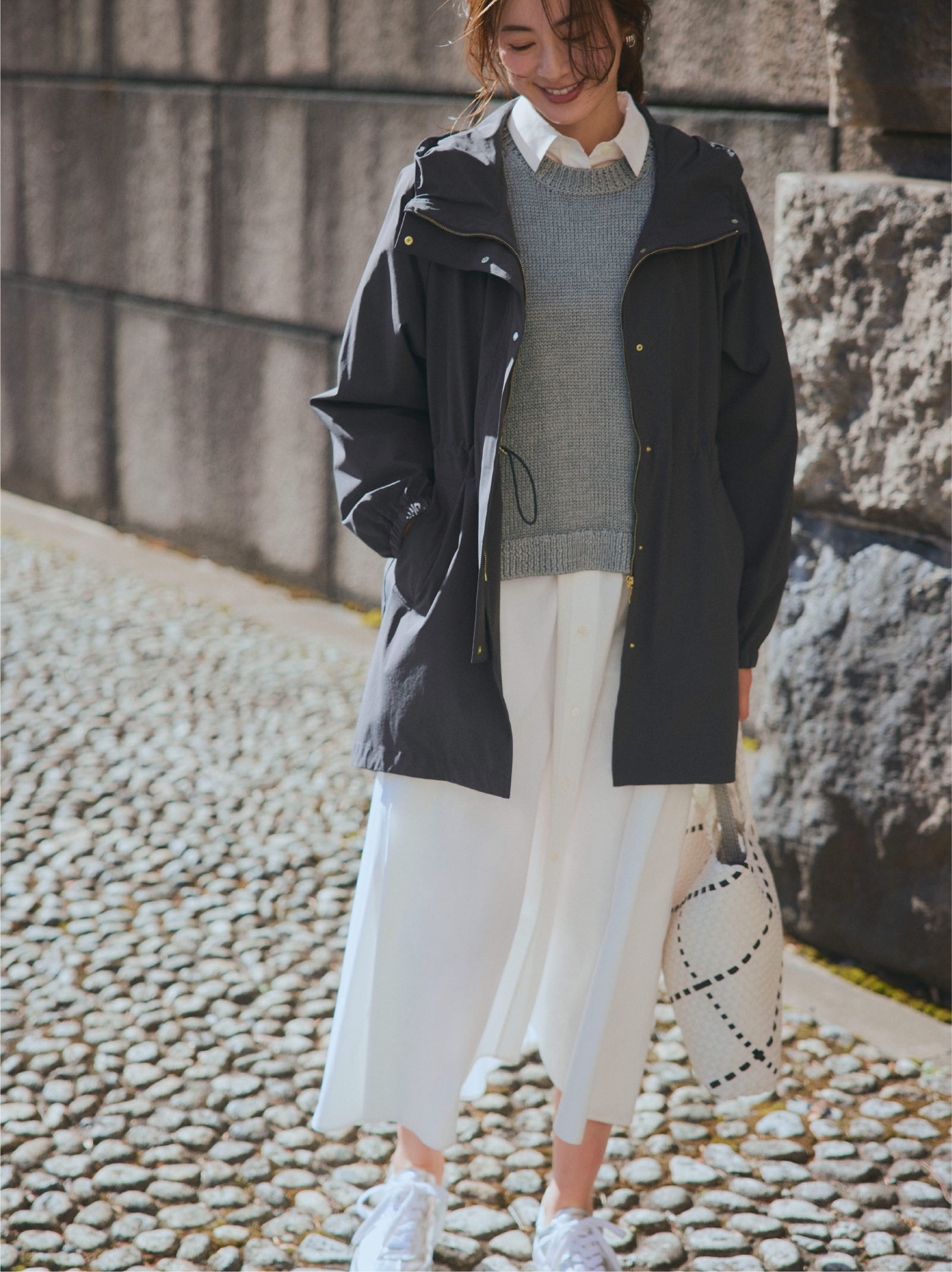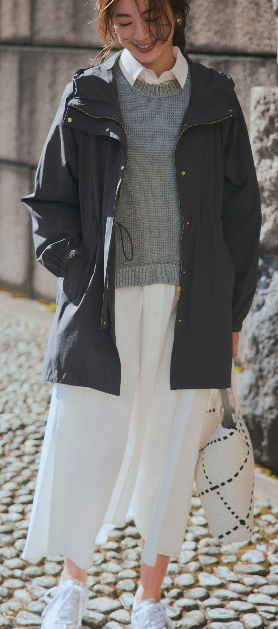 フレッシュな白をスパイス役として投入すれば顔周りも明るくなり、地味色コーデがパッと華やぐ。