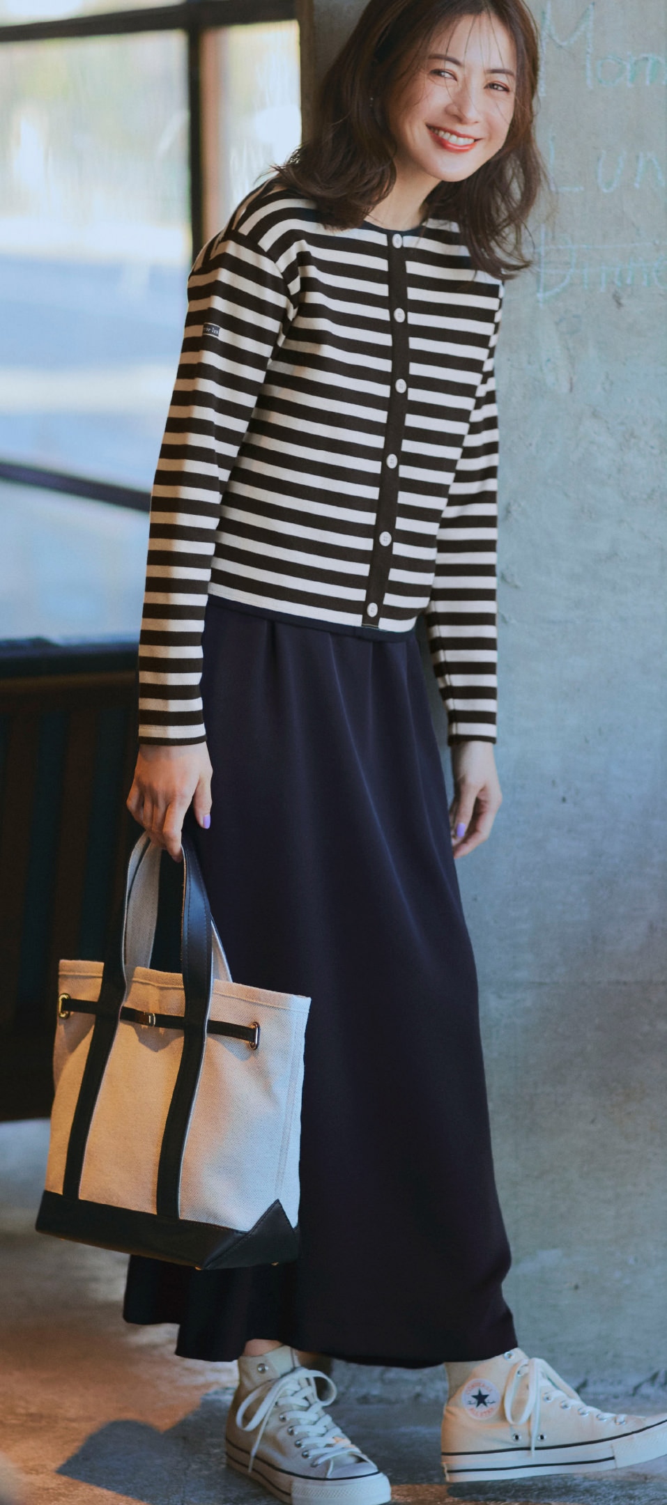 空や海を連想させる“青”も実はアースカラーの仲間。時に一点映えするカラーを組み合わせることが、地味色コーデにも必要な小技。