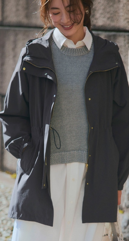 “マウンパ”には、インナーにキレイめニットを合わせるとこなれた印象に。カジュアル×キレイめのバランスが大事。