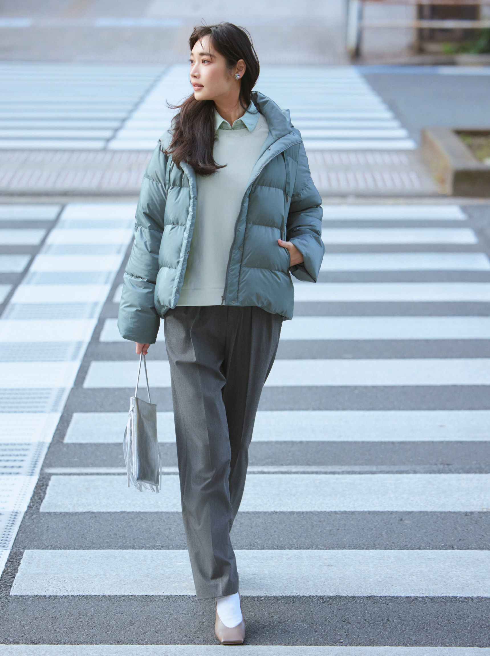 澄んだ冬の空気に馴染むかのような淡いミントカラーのスウェットは、ハンサムなグレーのボトムで受けてスタイリッシュに着こなしたい。