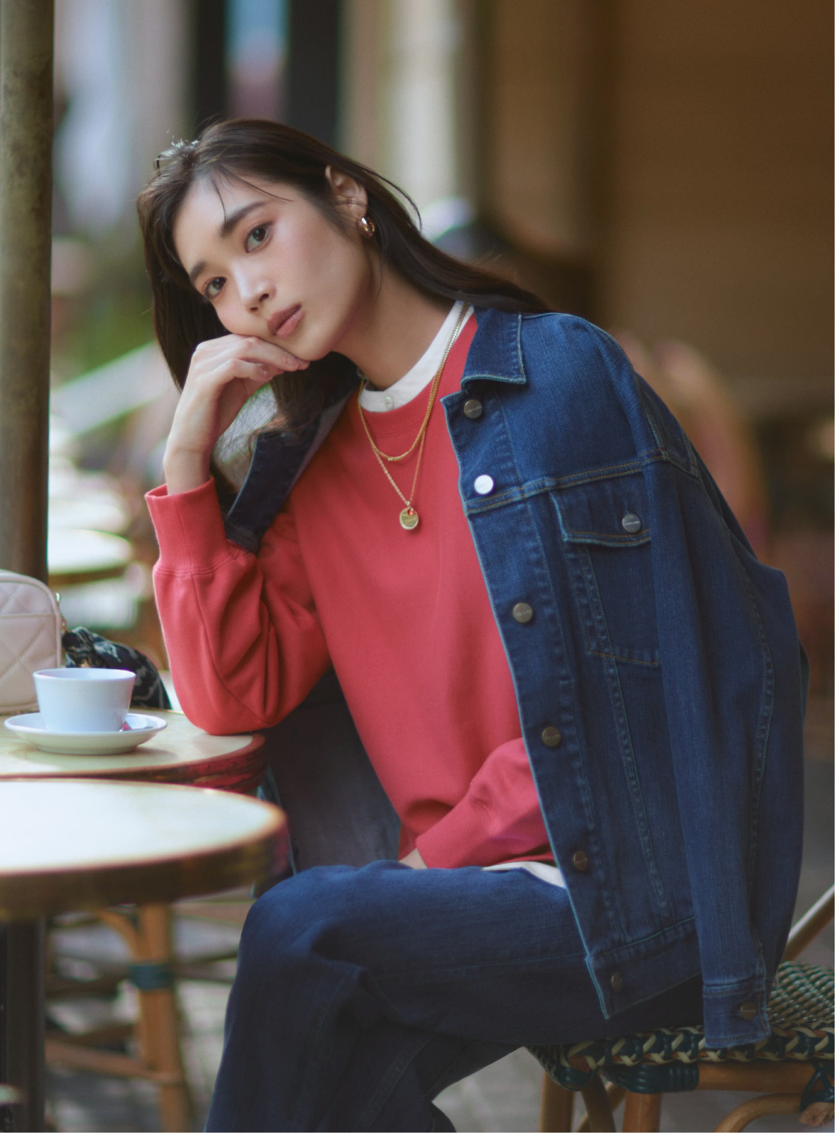 一見派手見えなカラースウェットも、白シャツの力を借りれば中和されるから不思議。春に向けて出番が多くなるデニムセットアップとも相性◎