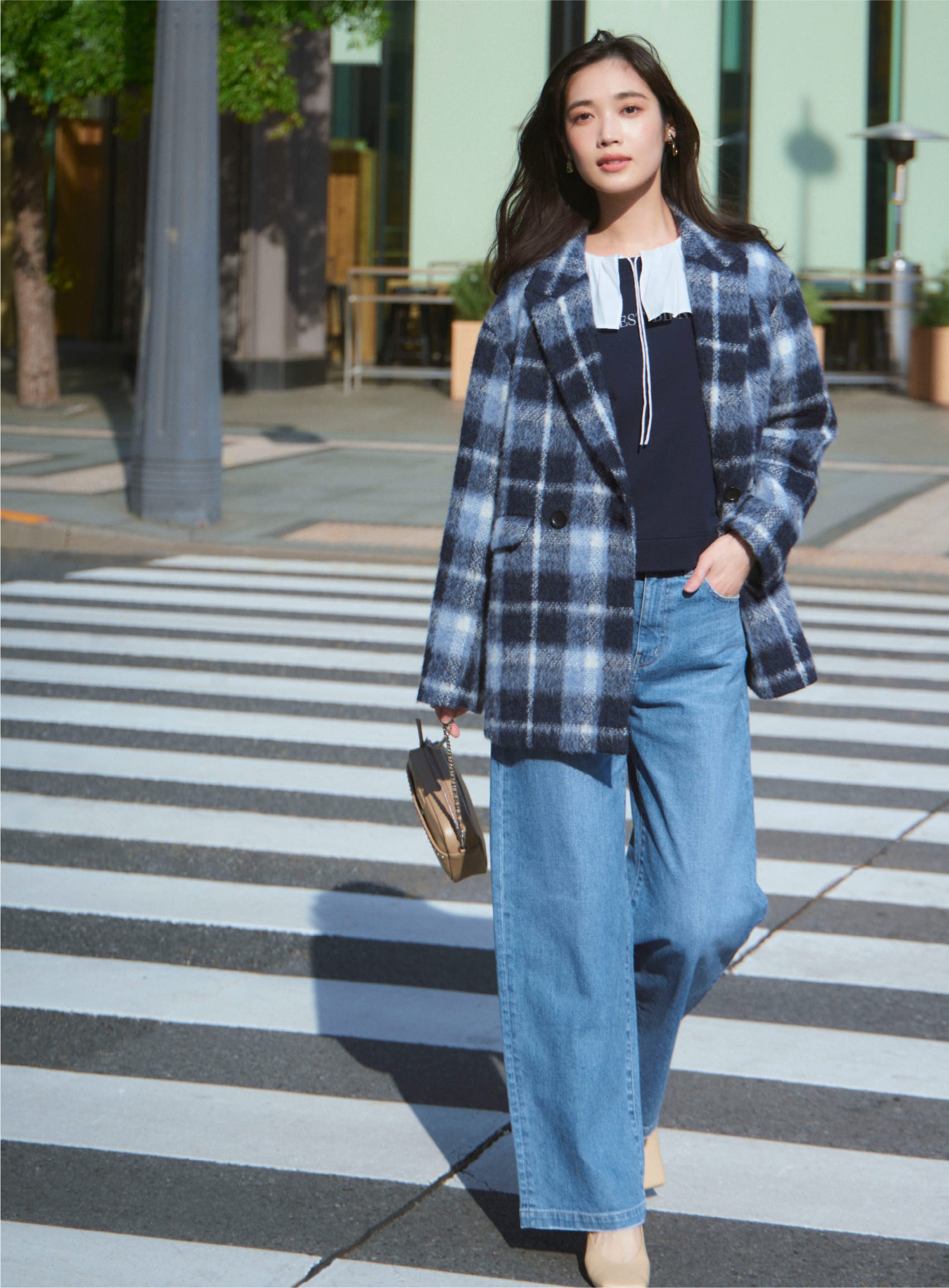 フリルブラウスをインナー使いで活用すれば、スウェットの日も〝ただのシンプル〟に陥らない。大胆なチェック柄コートとデニム合わせも今っぽコーデに一役。