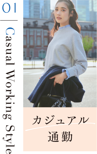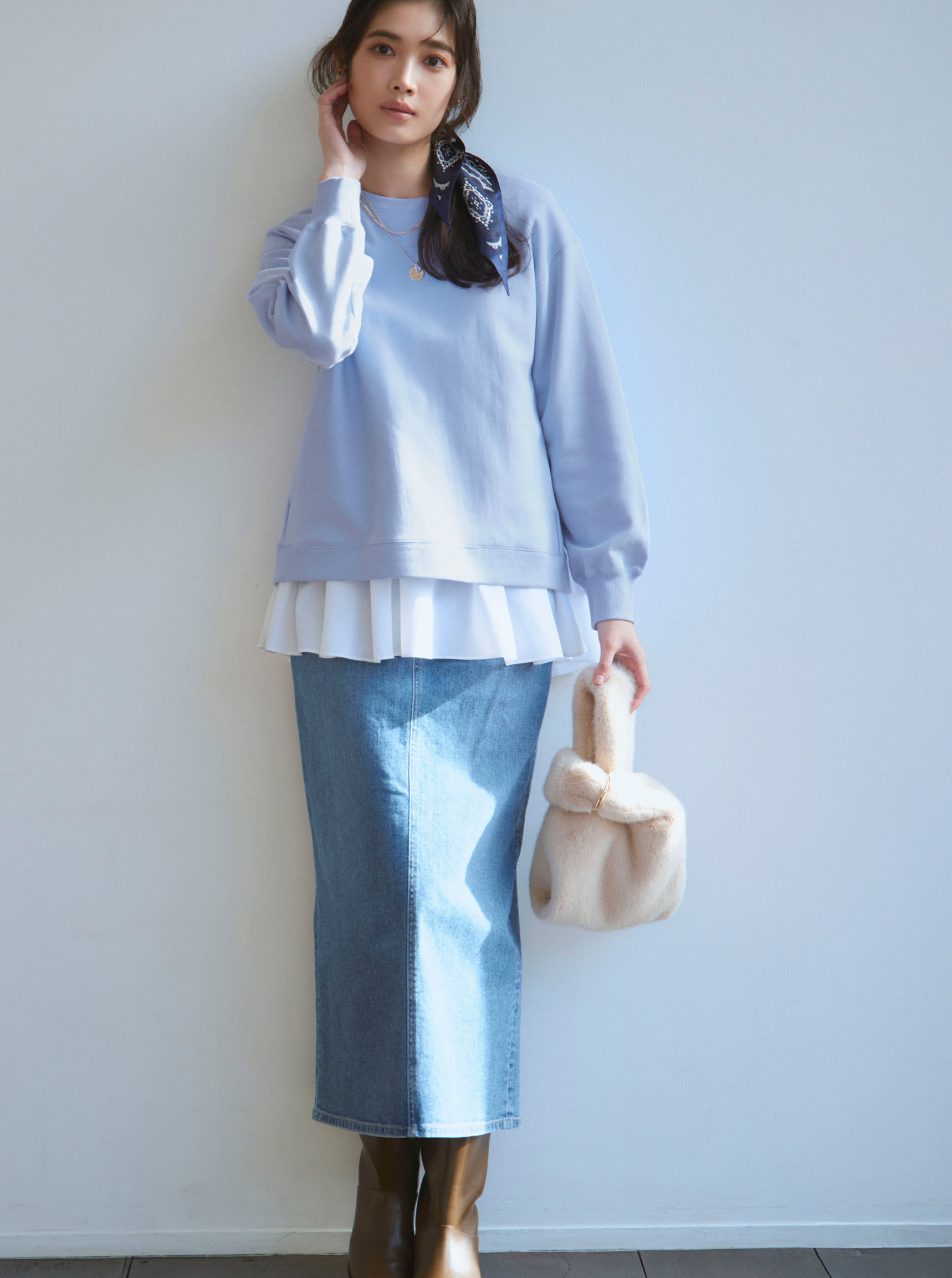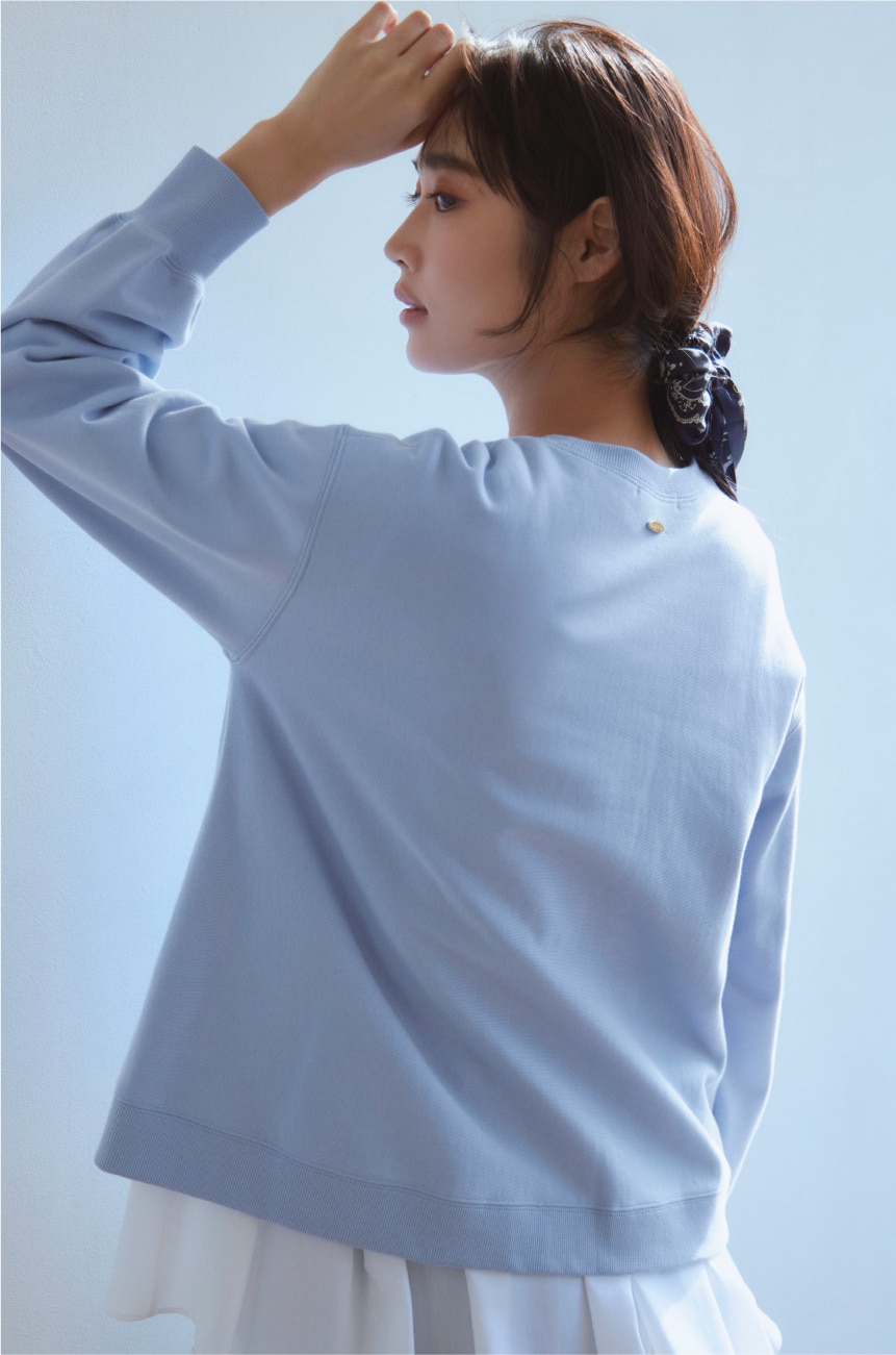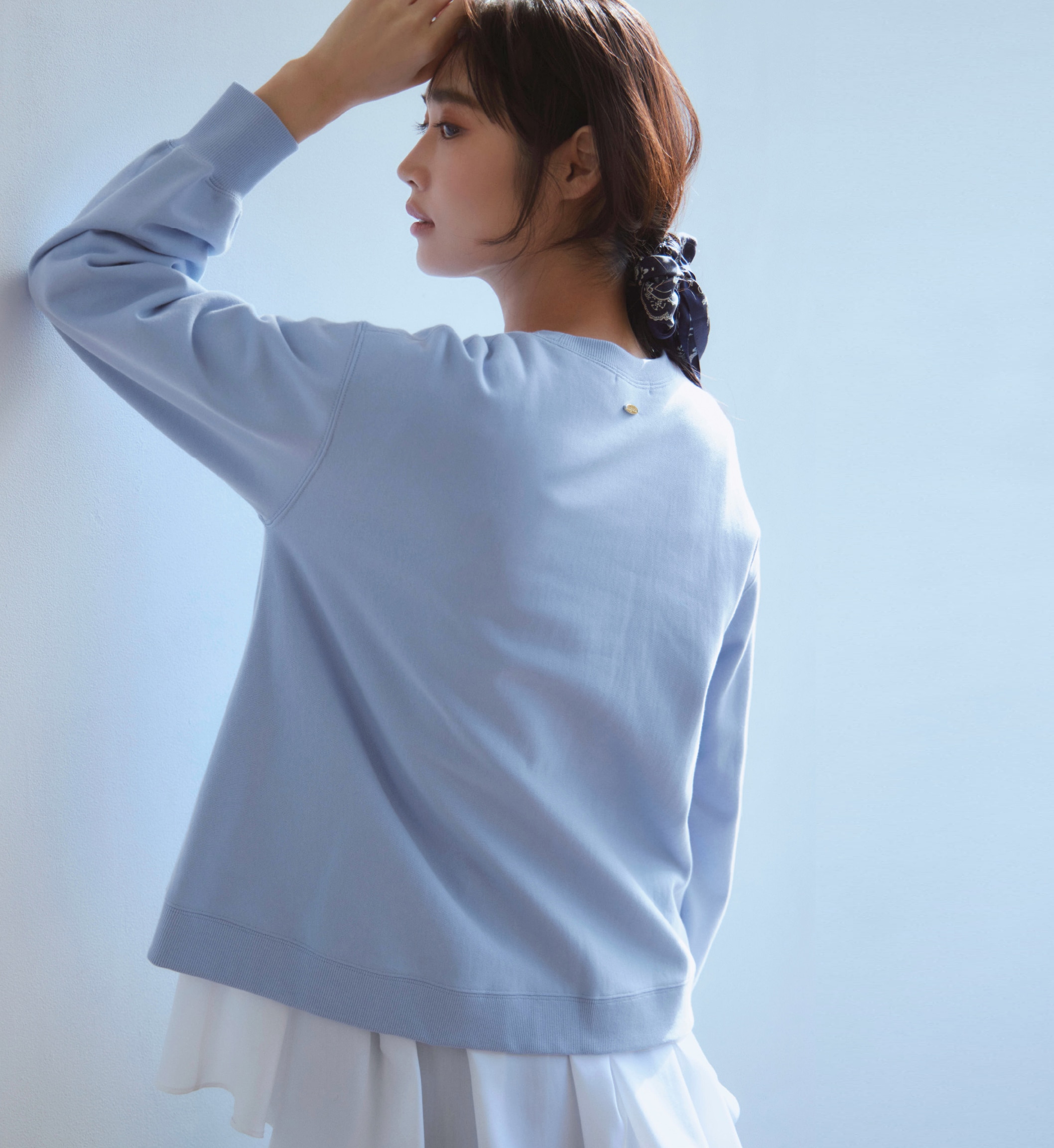 青空と雲のコントラストのように、スカイブルーでまとめた上下に、今季大人気のレイヤードカットソーを忍ばせればカジュアルなスウェットも女っぽく仕上がる。メタルプレート使いで後ろ姿も抜かりなく。