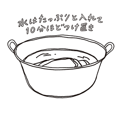 手洗いする場合は、つけ置きをメインに。洗濯桶の中に水5Lと洗剤を入れ、洗剤が溶けたら裏返しデニムを入れます。そのまま放置して10分ほどつけ置き。こうすることで汚れはある程度落とすことができ、色落ちも最小限に抑えられます。すすぎは水を入れ替えながら、洗剤の泡が出なくなるまで繰り返して。最後に洗濯機で1分間脱水を行って完了。