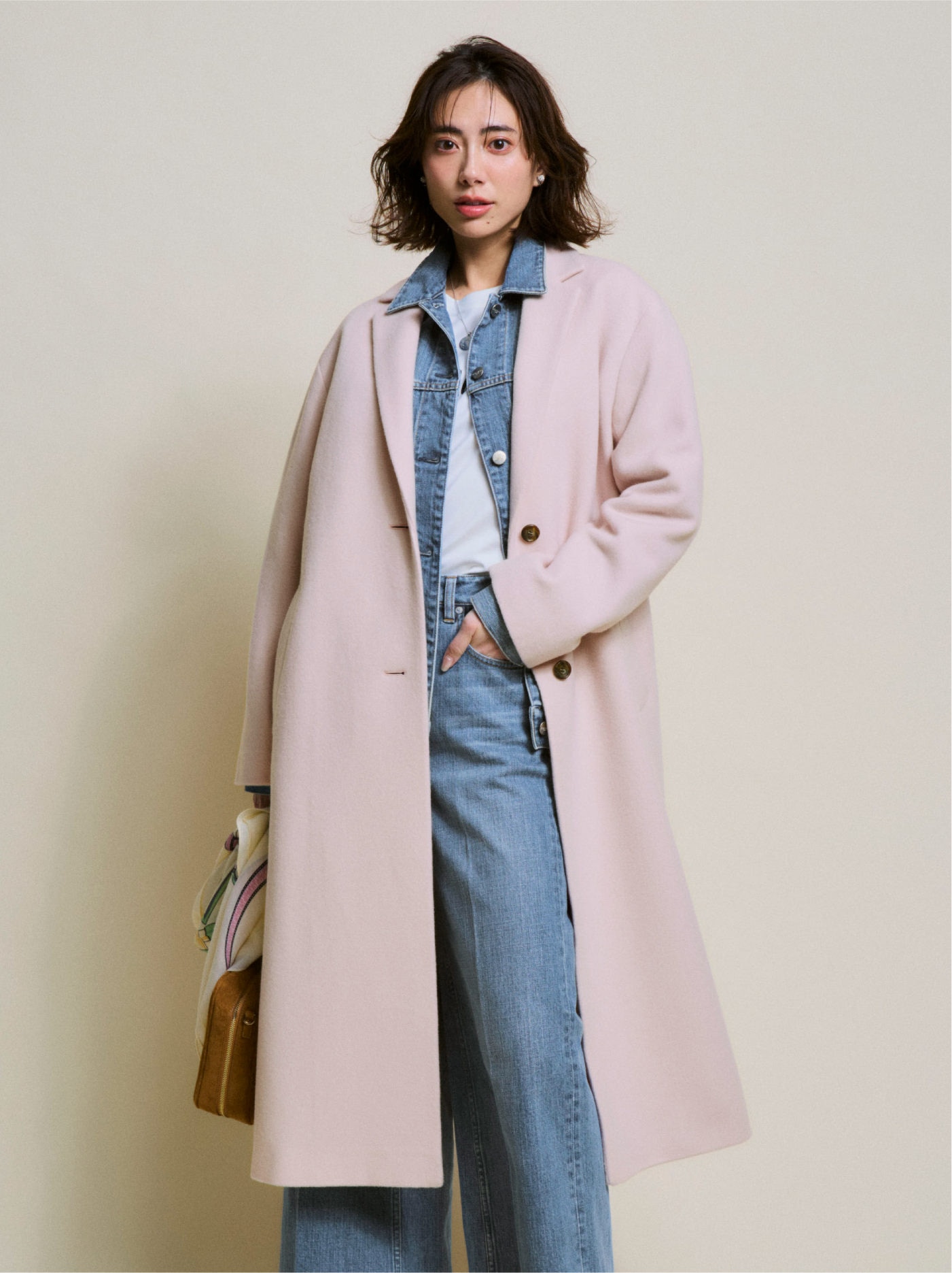 顔まわりを明るく見せる桜色のコートは、