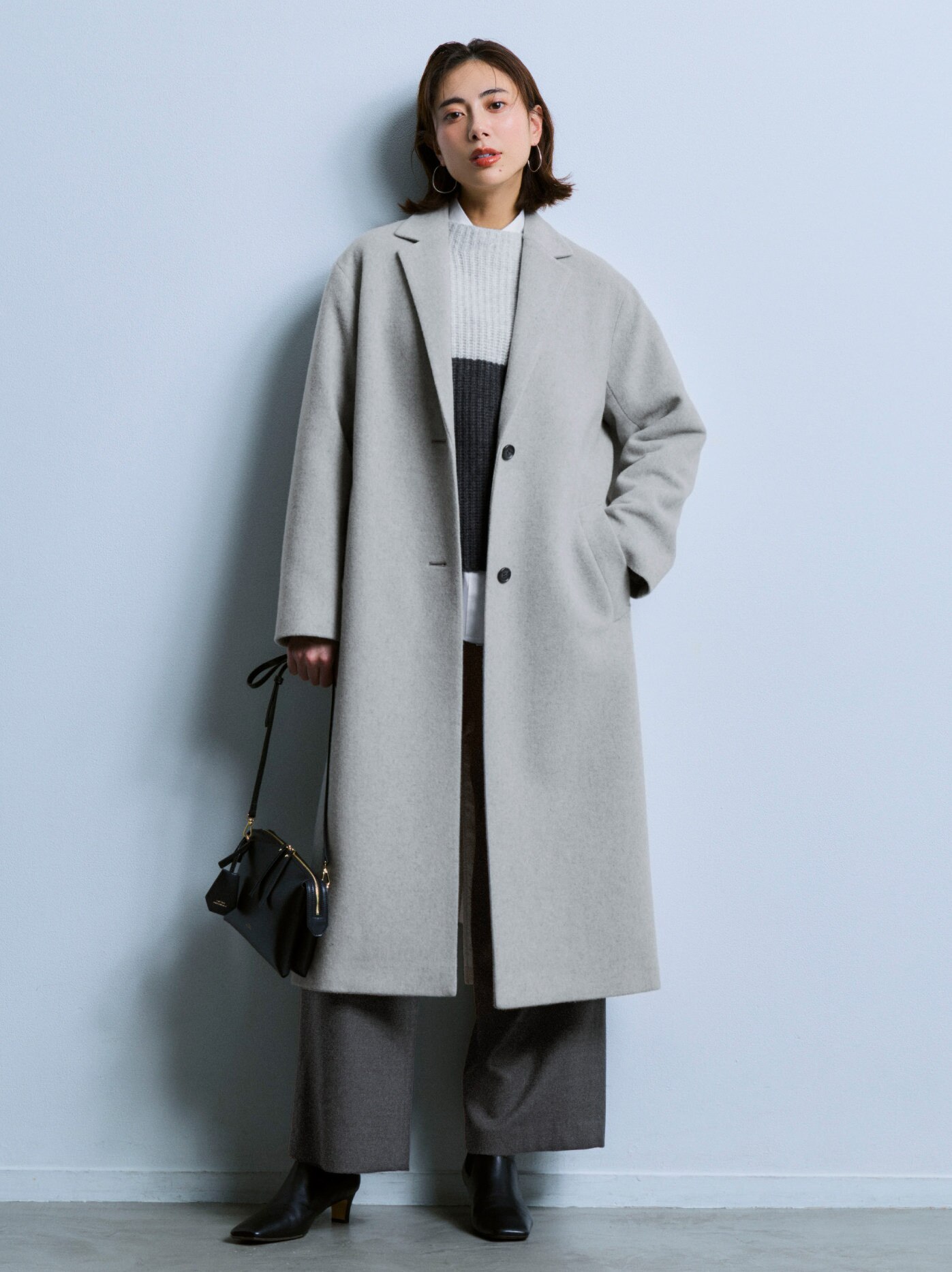 ニュートラルなライトグレーのコートは、