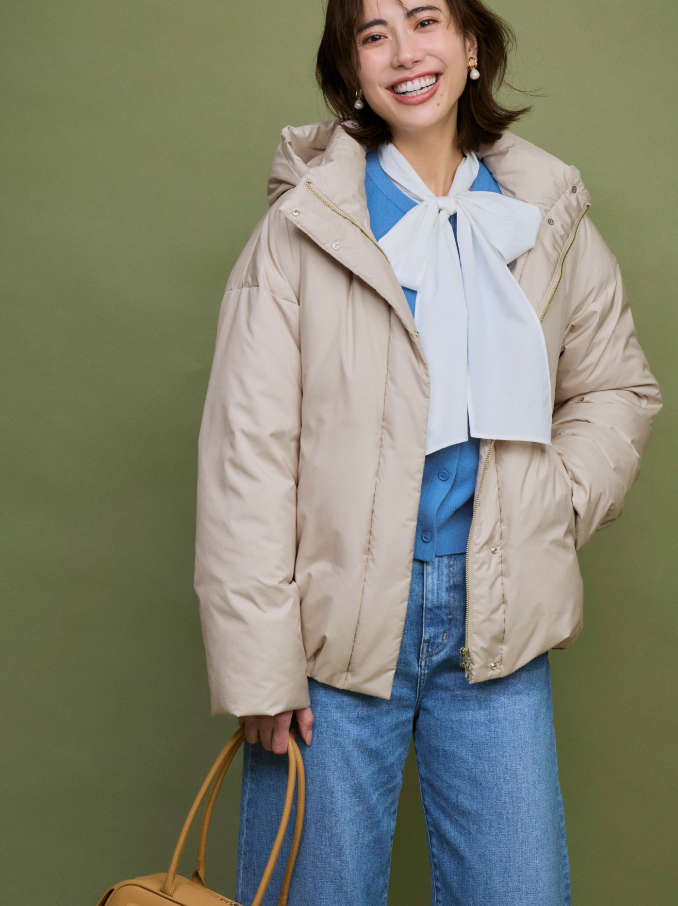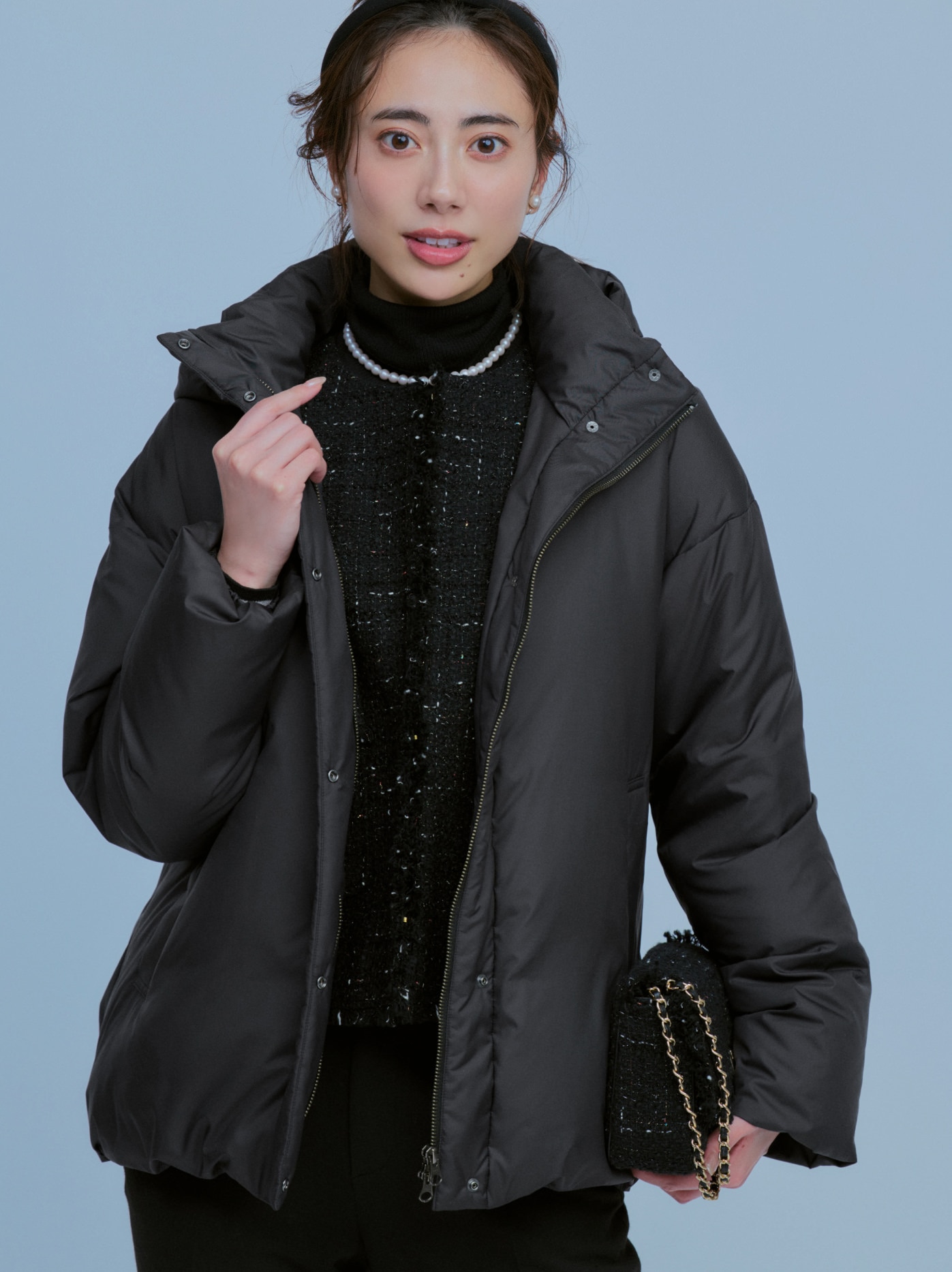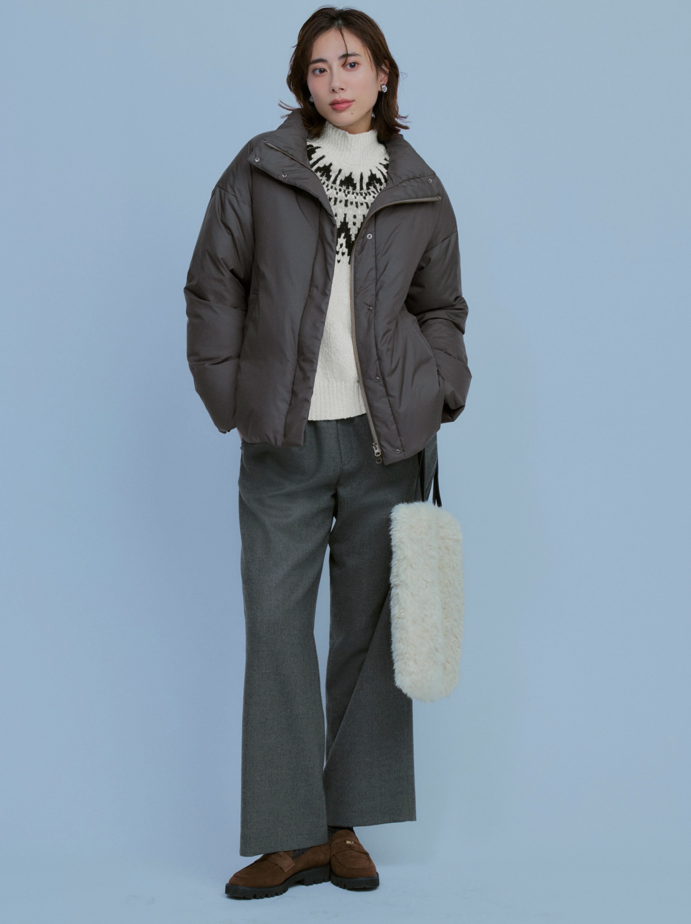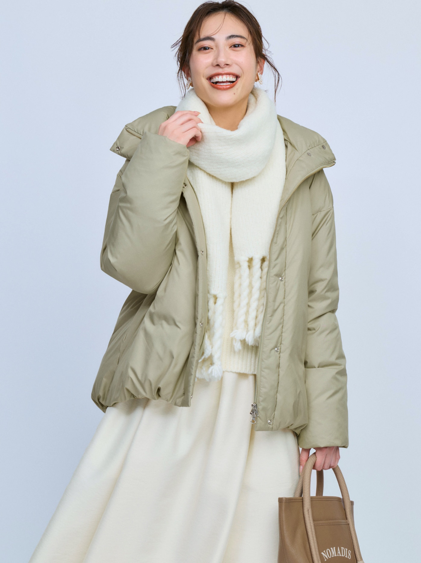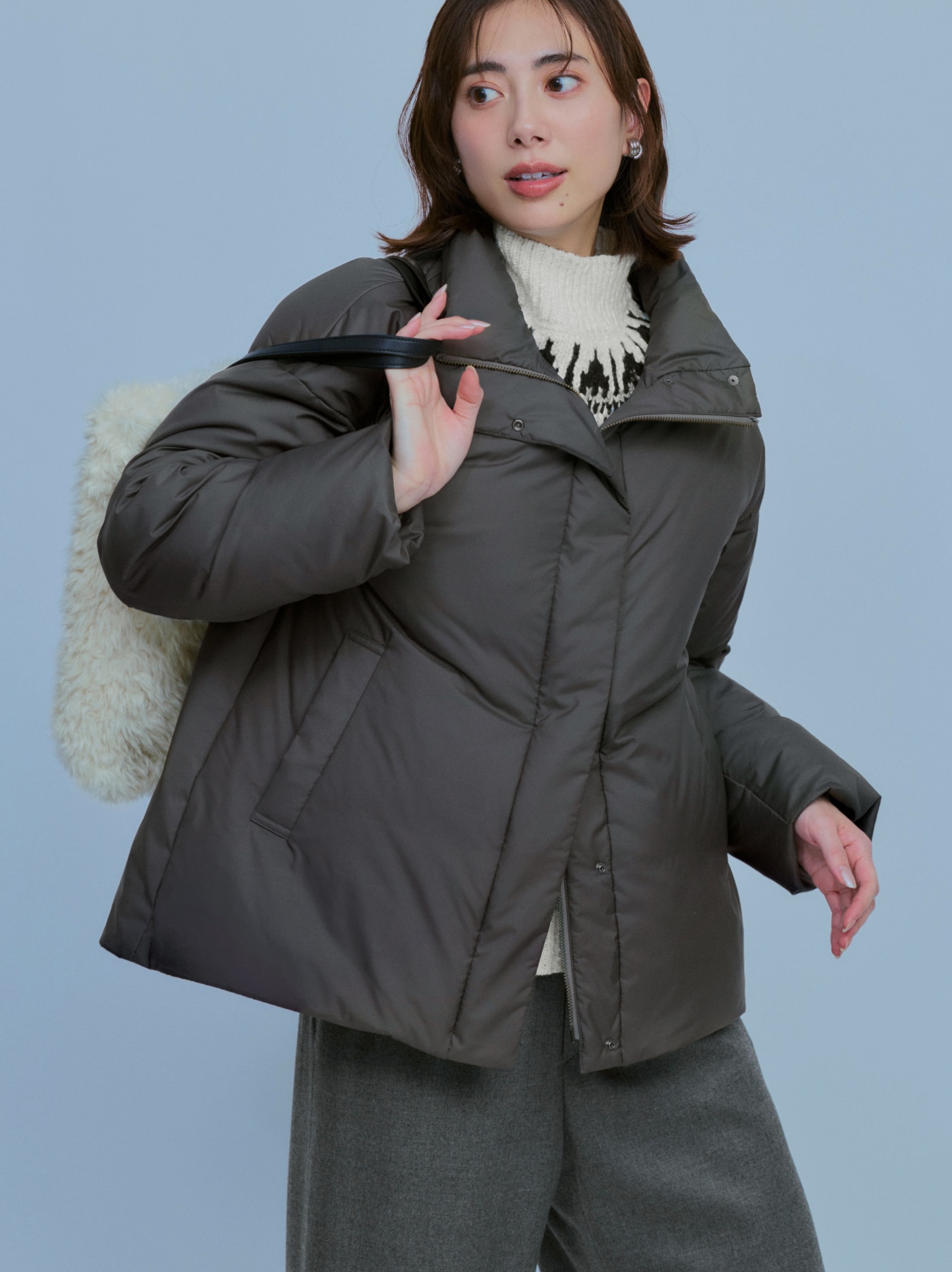 冬の装いに女性らしい柔らかさを添える一枚。
