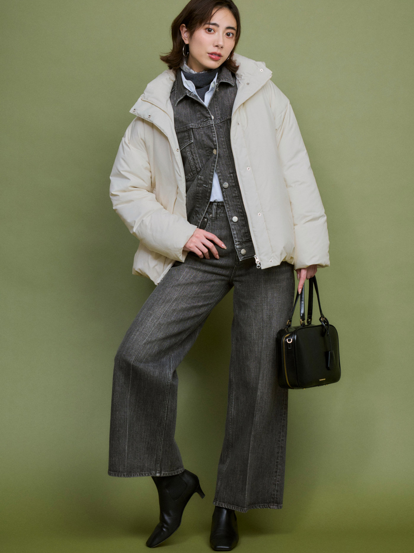 ニュアンスのあるライトセージグリーンは、ホワイトルックにさりげないアクセントを添えるカラー。