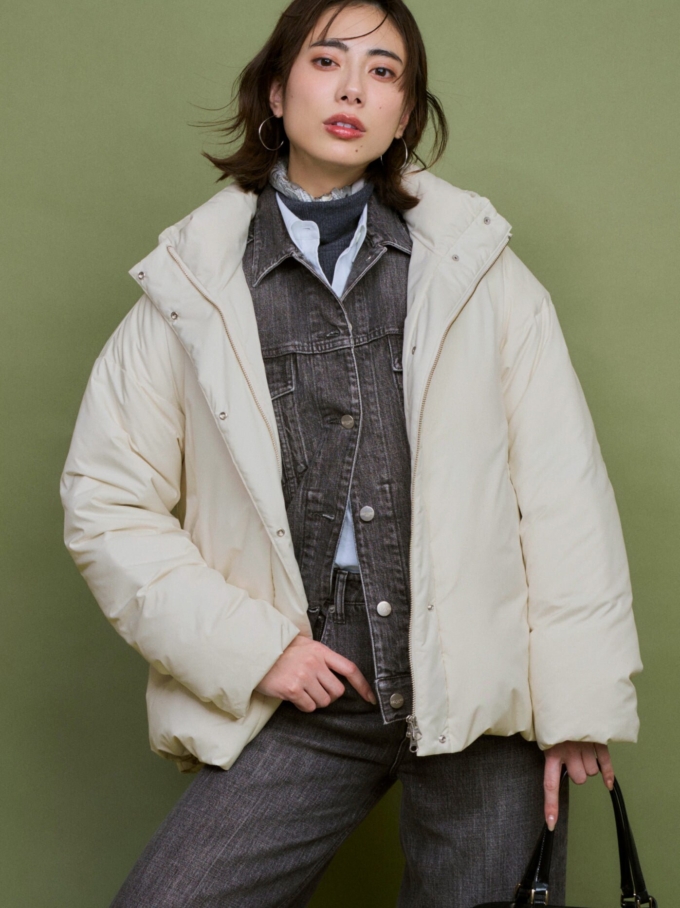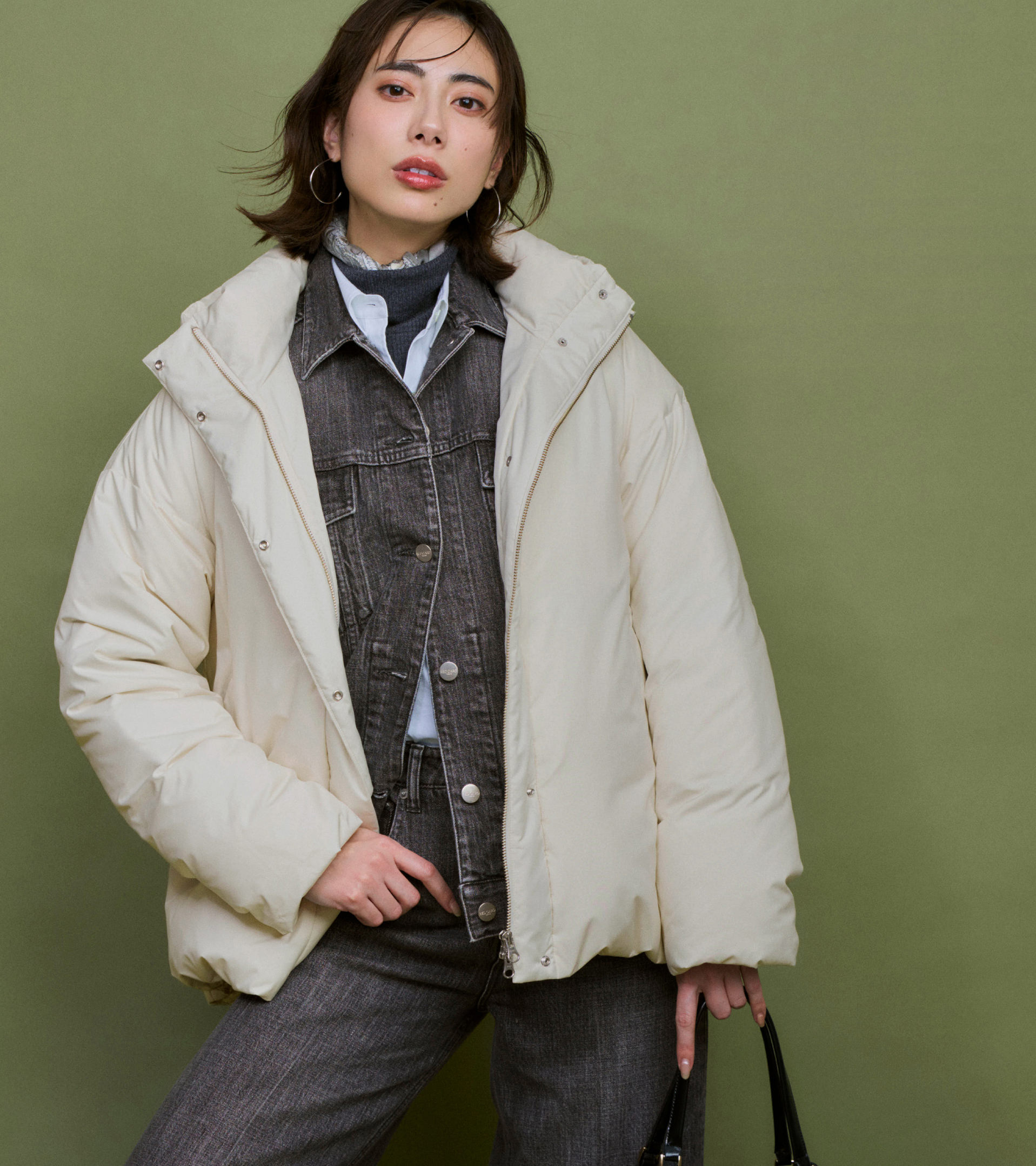 端正なラインがワントーンコーデを引き立てる。