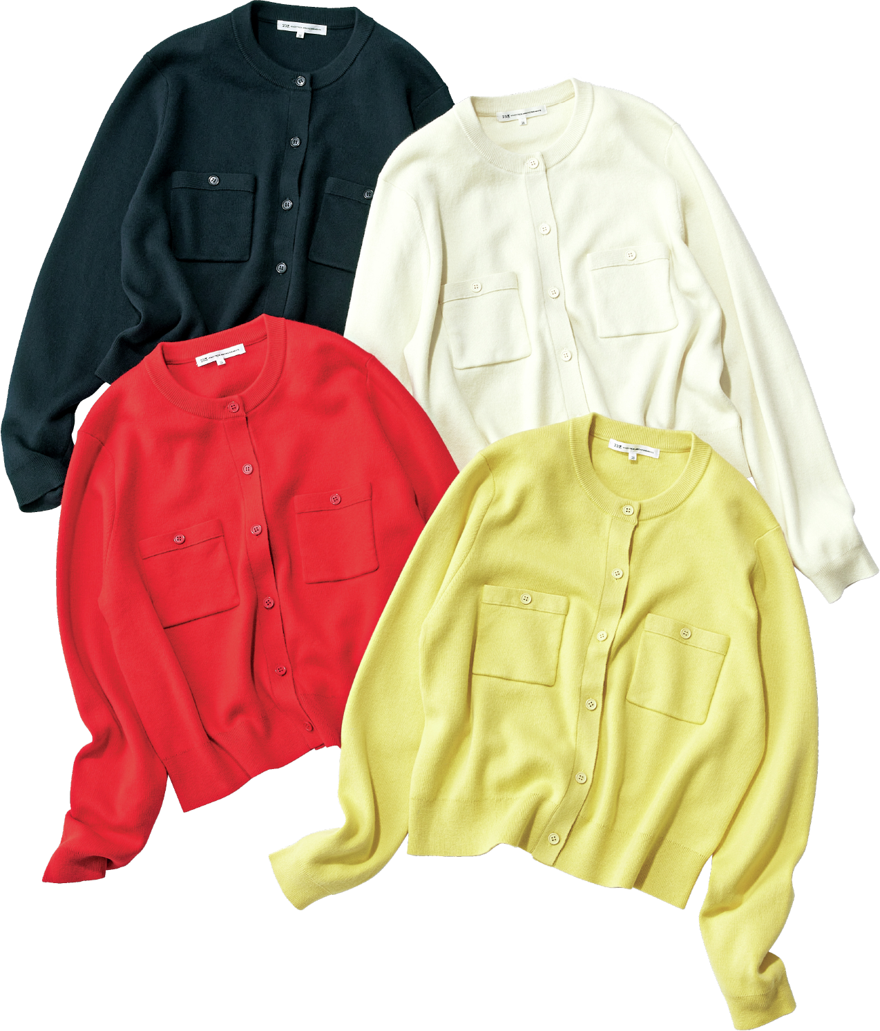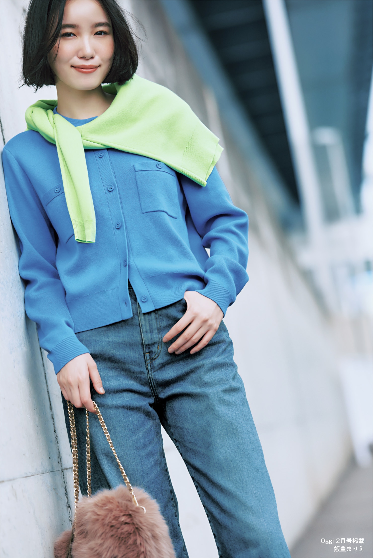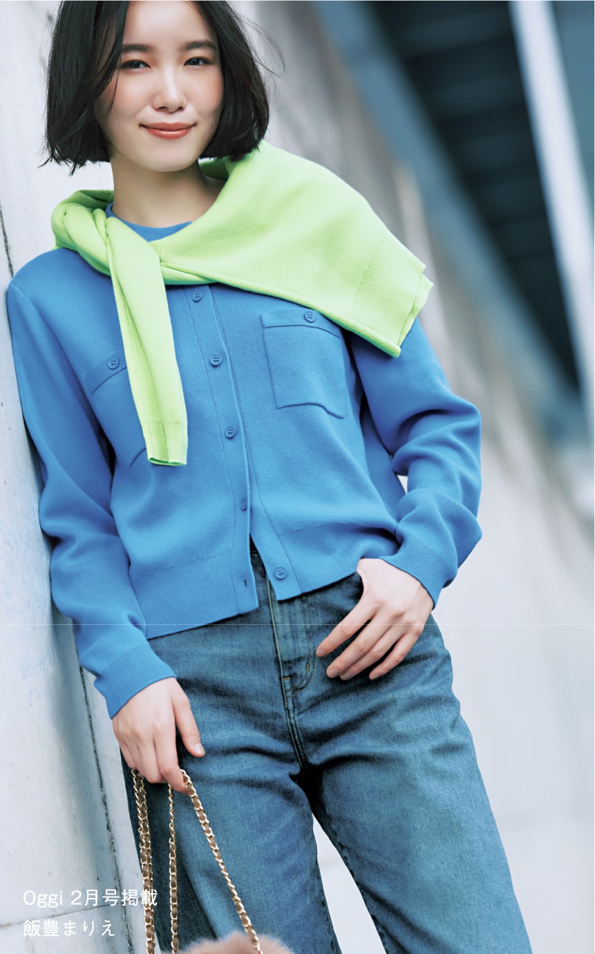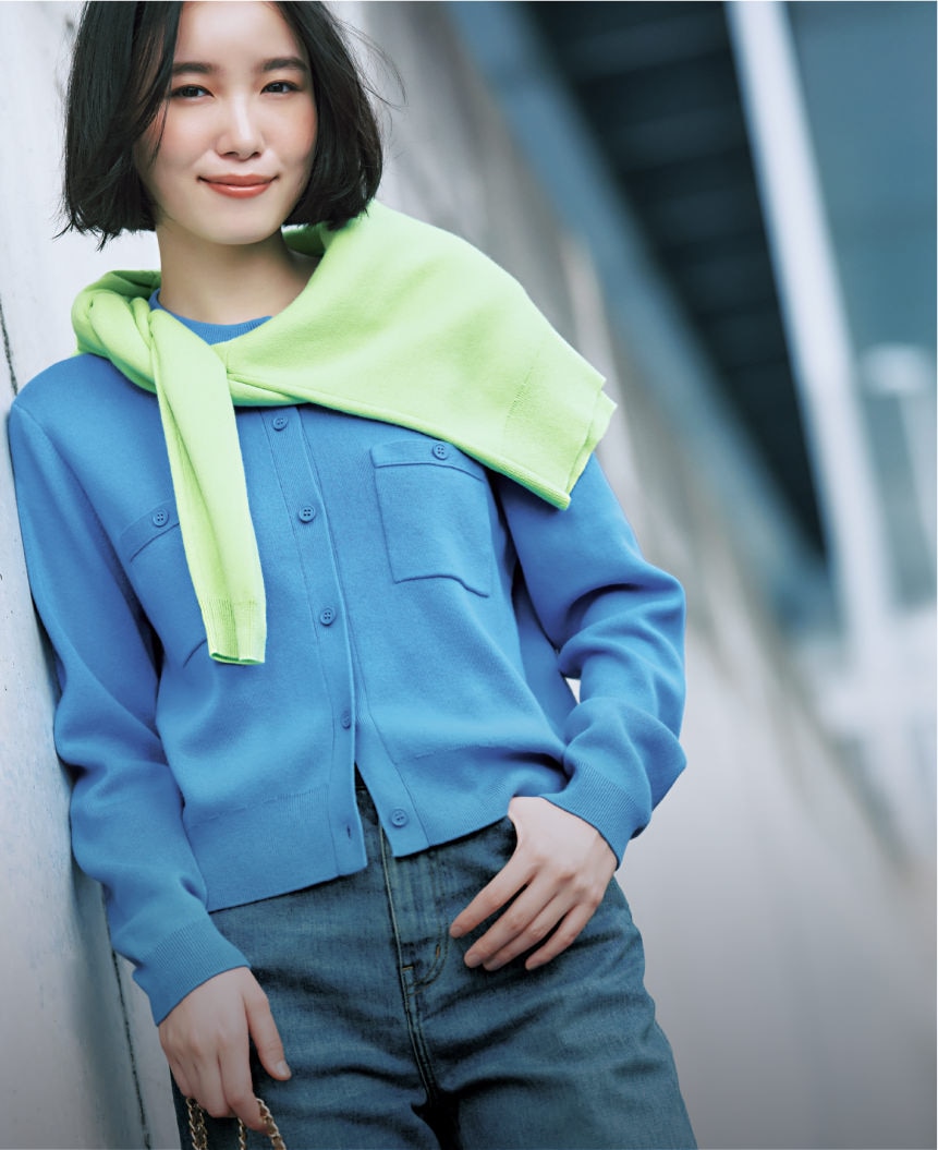 「このカーディガンは、きれい色が多彩!鮮やかだけど、いろいろな色と合わせやすい…そんなカラーリングになっているので、カラーオンカラーのスタイリングも気負いなく楽しめます。×デニムの王道コーディネートもたちまち春らしく」(石関さん)