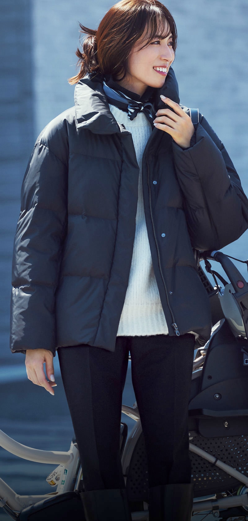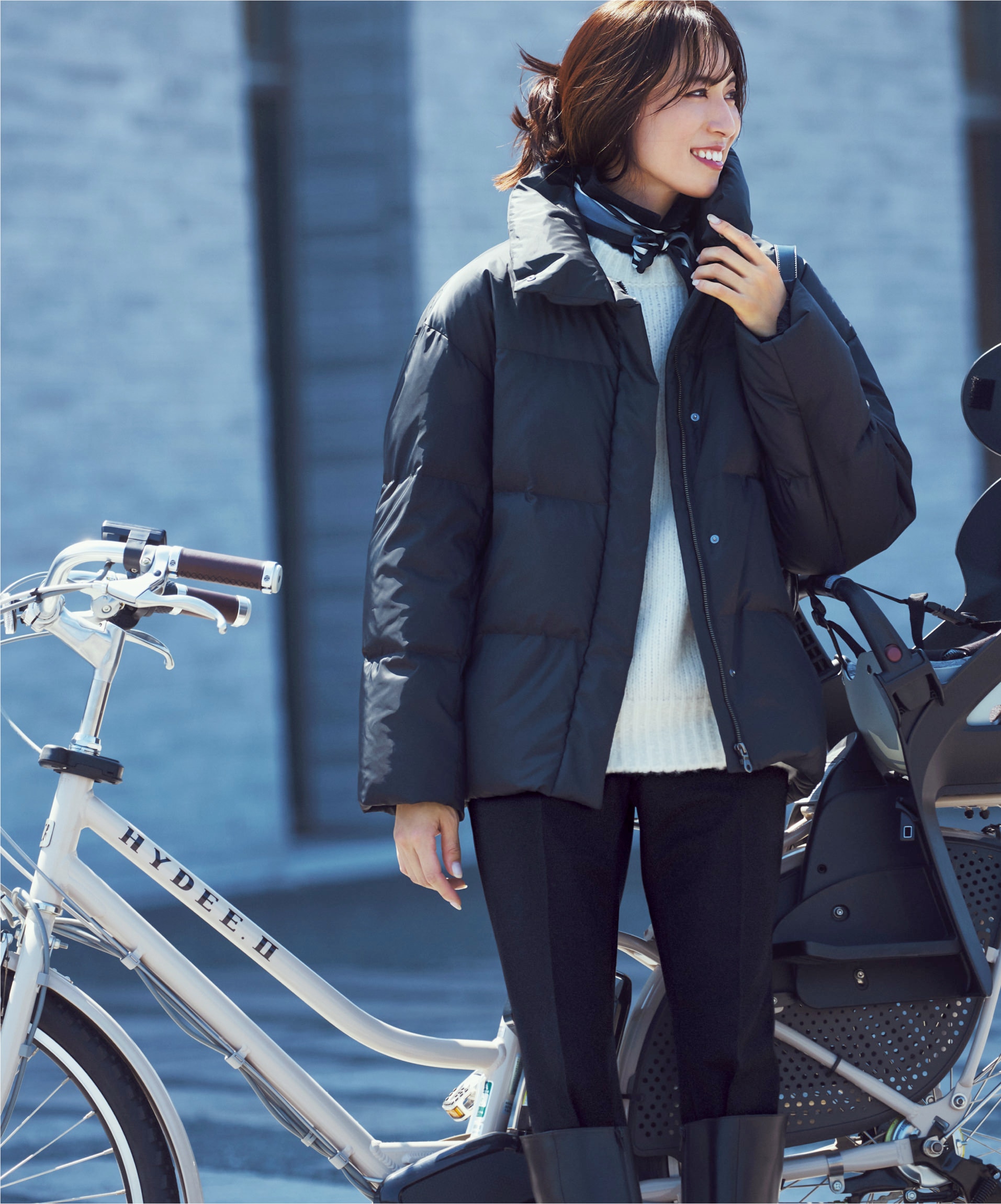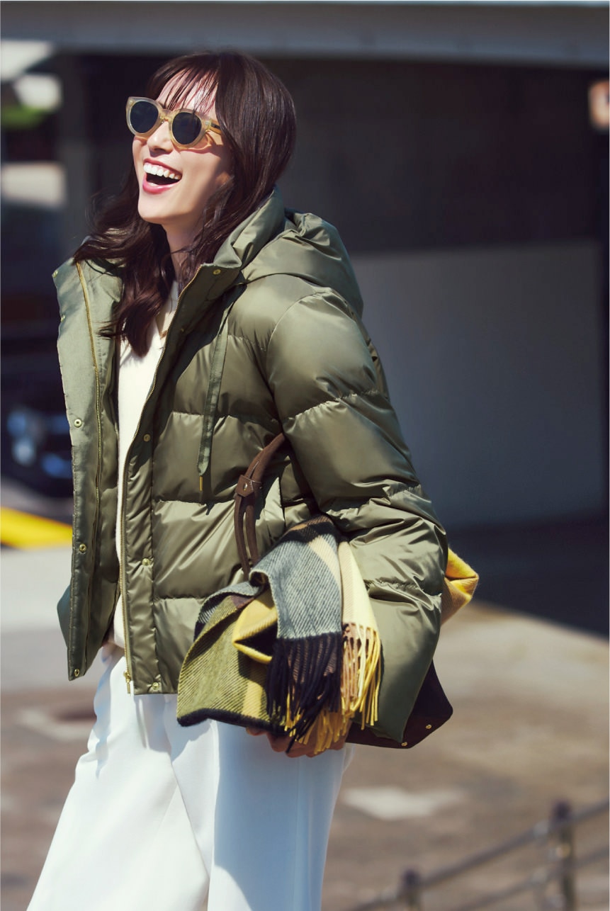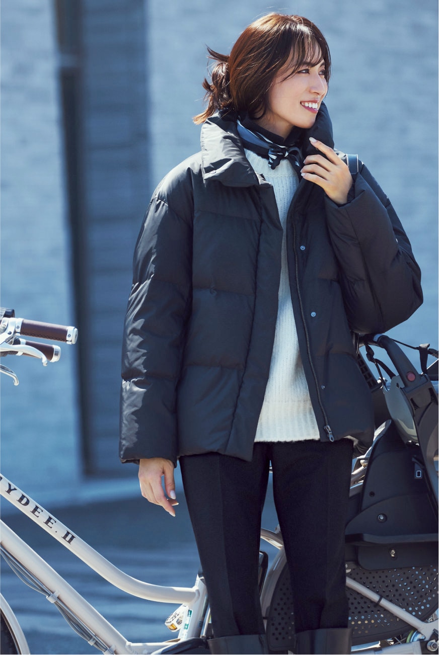 送迎や公園、見守りに旅行…。冬中頼りきりのダウンが自宅で洗えるのは忙しいママにとって嬉しい限り。機動力あるショート丈は大きめ衿が着こなしのアクセント。ハンサムなモノトーンコーデに更新感をプラスしてくれる。