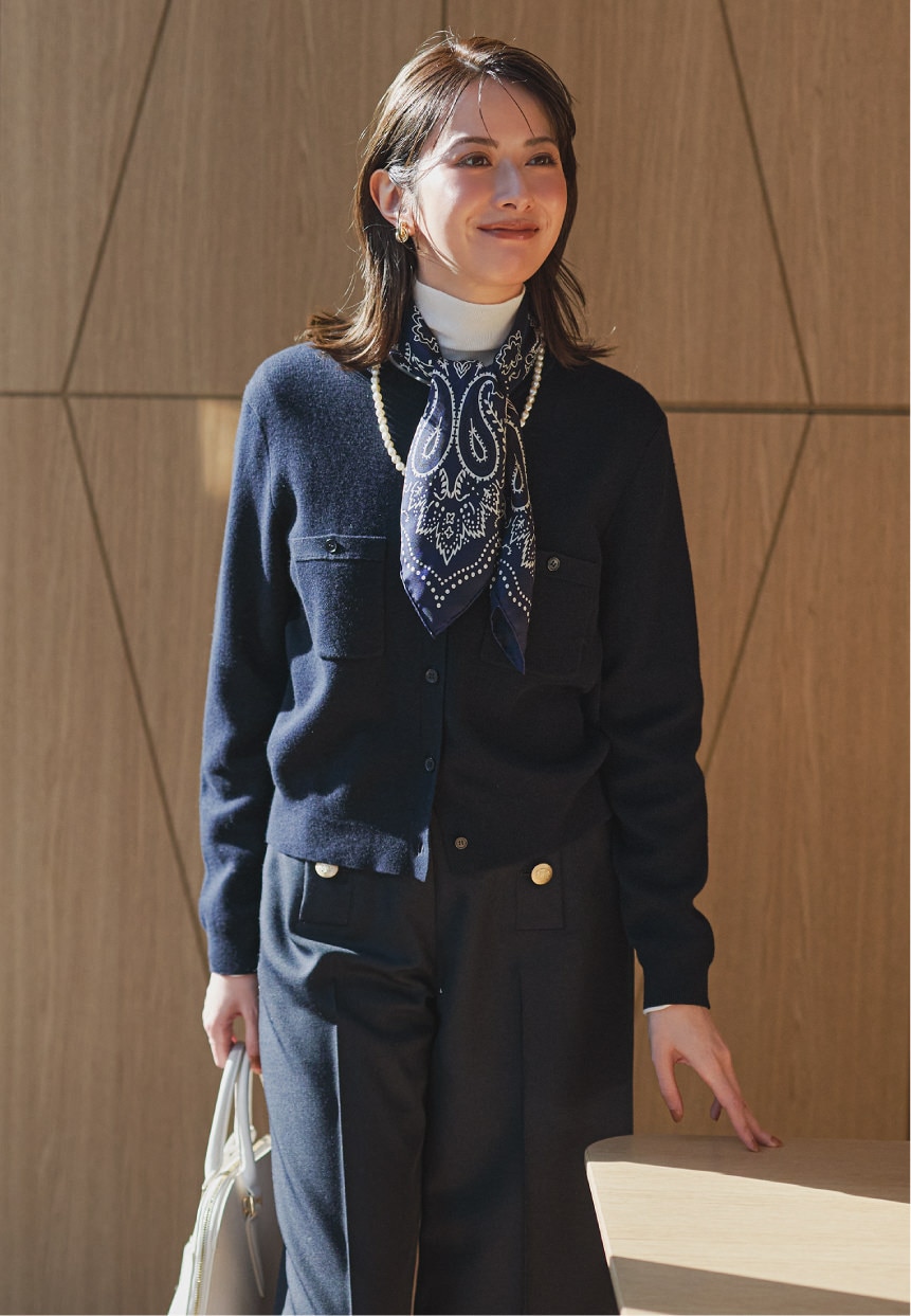 知的で落ち着いた印象のネイビーのカーディガンは、