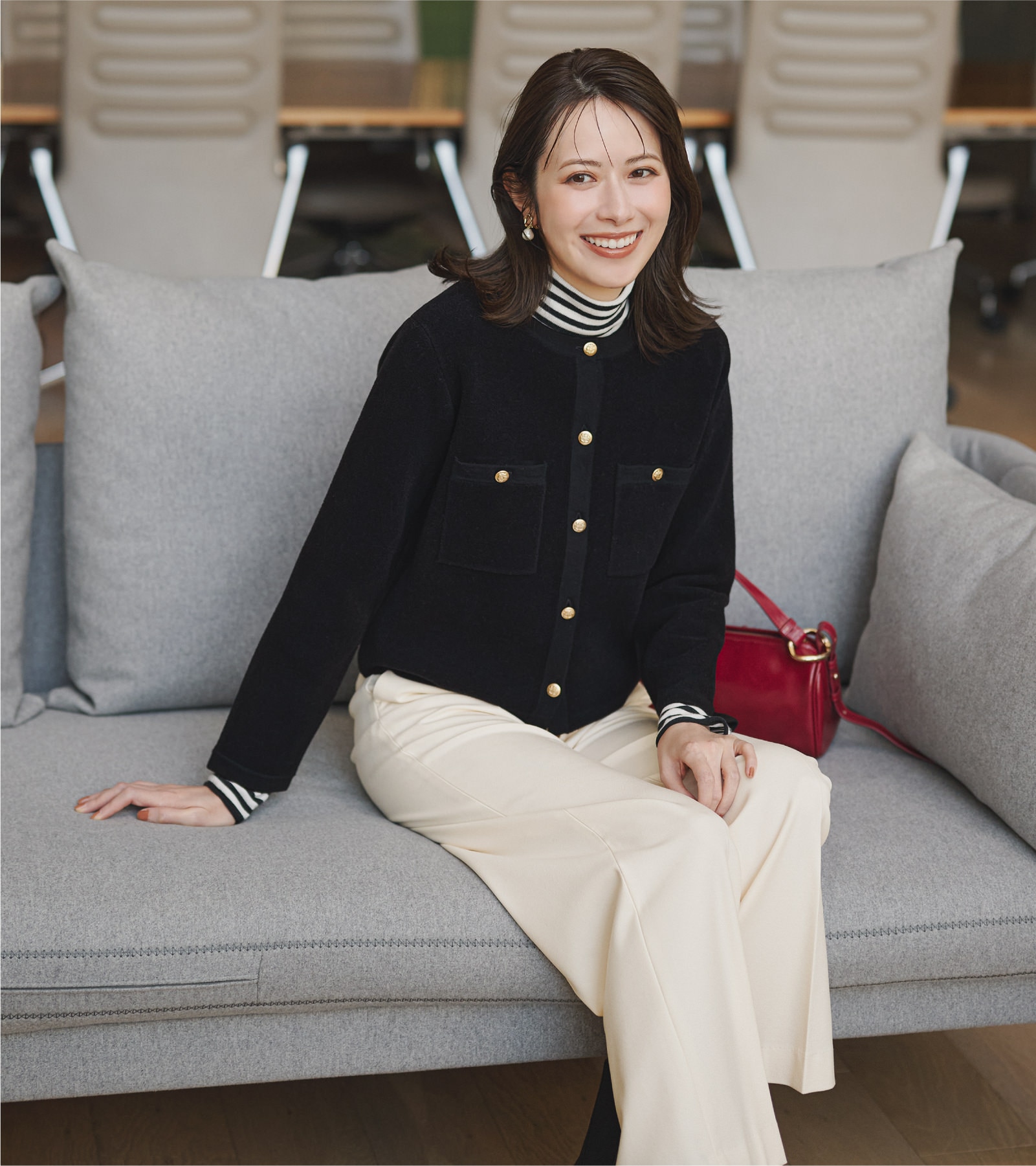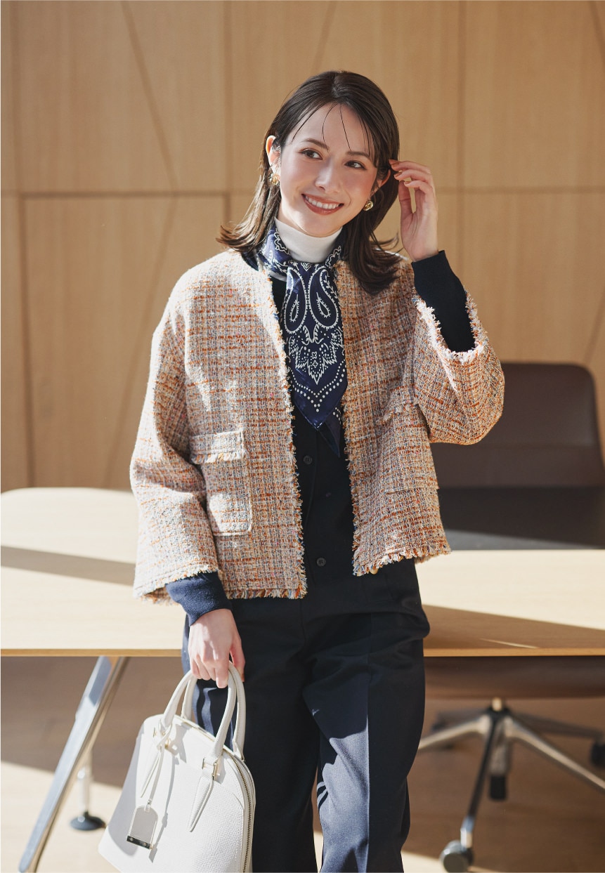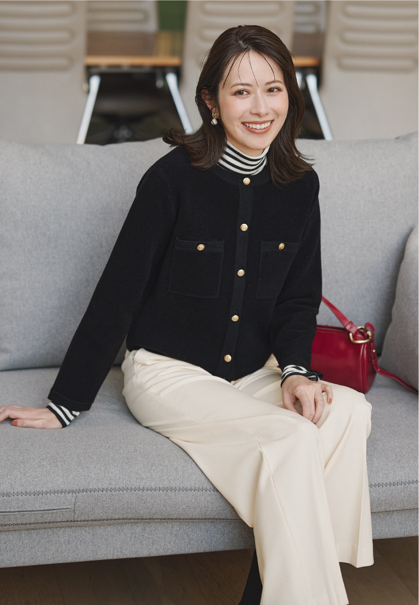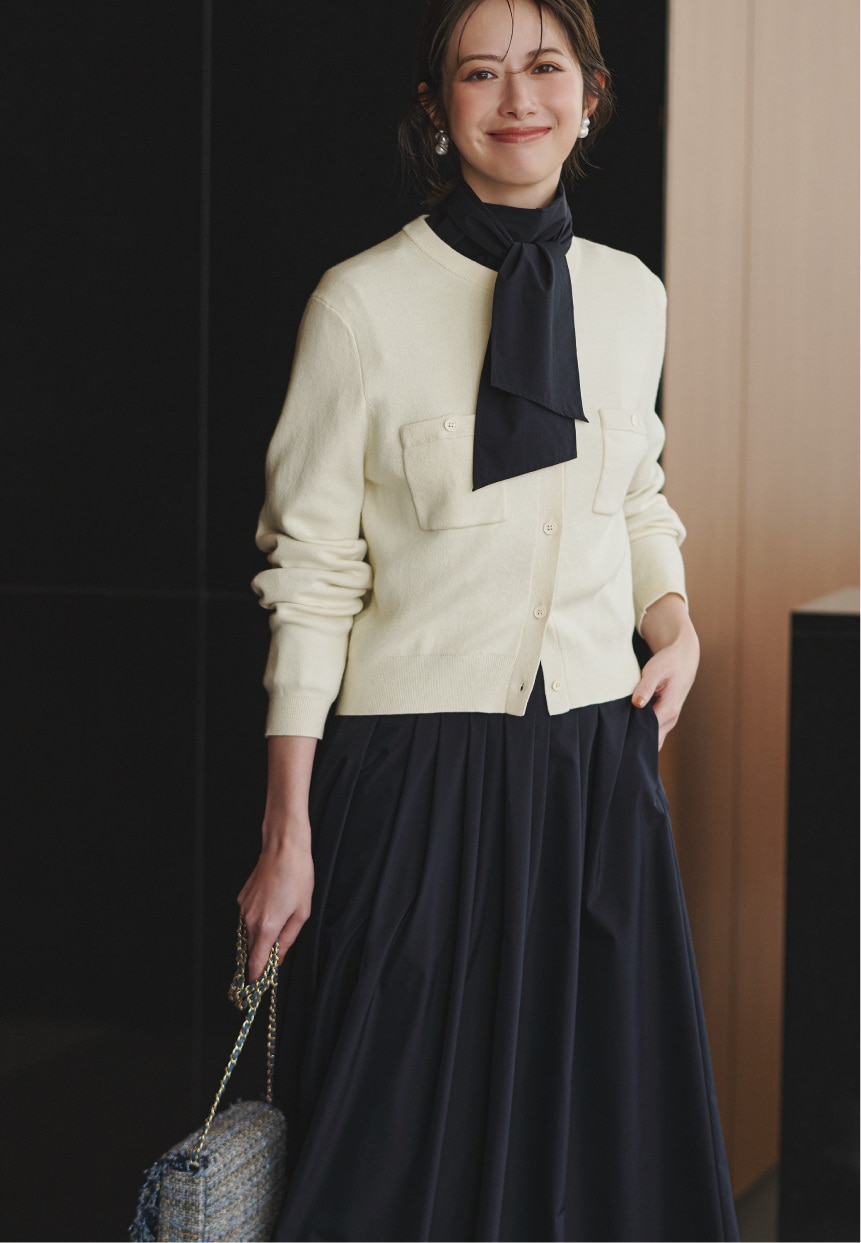 襟元のフェミニンなディテールがさりげない華やぎを添える。