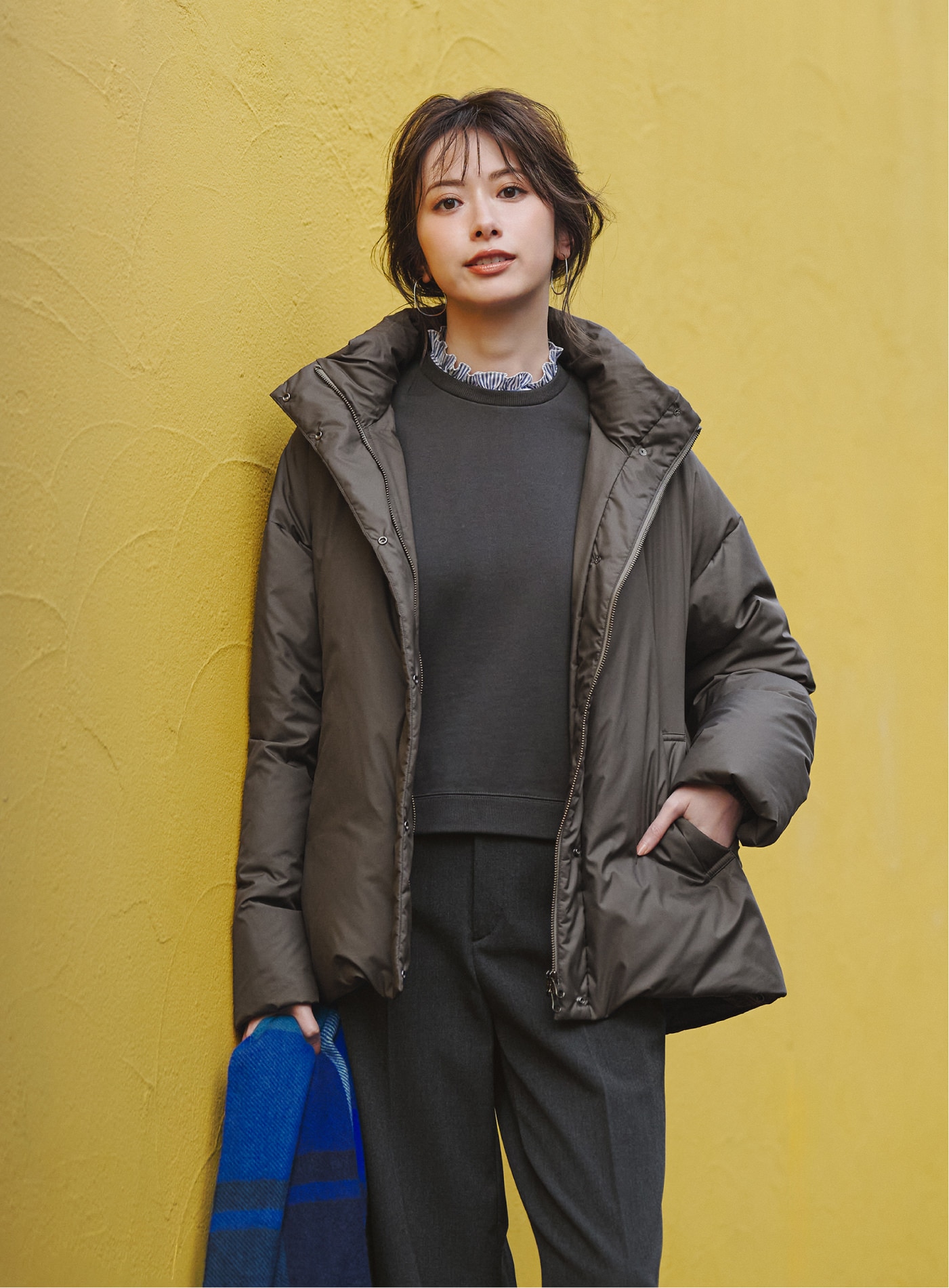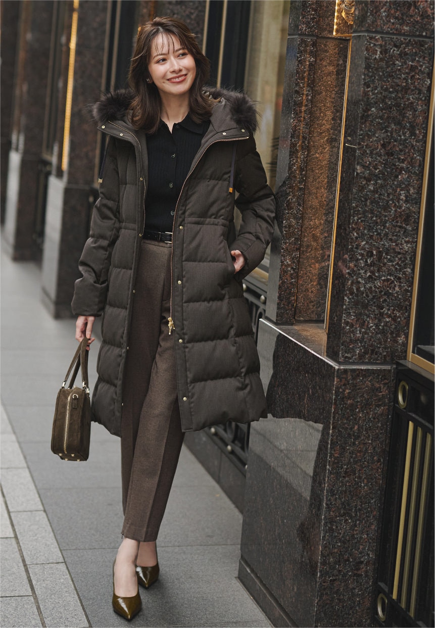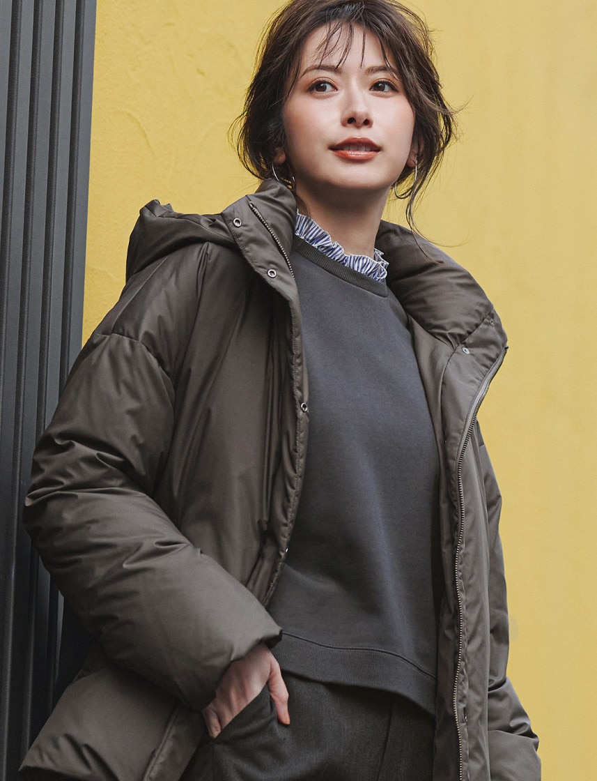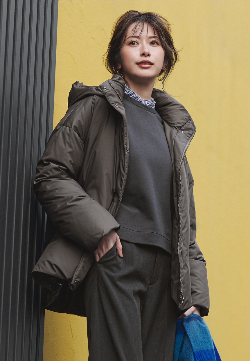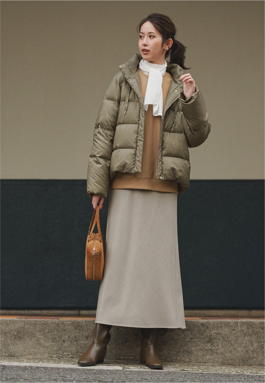 カーキダウンを重ねた配色バランスが美しく、