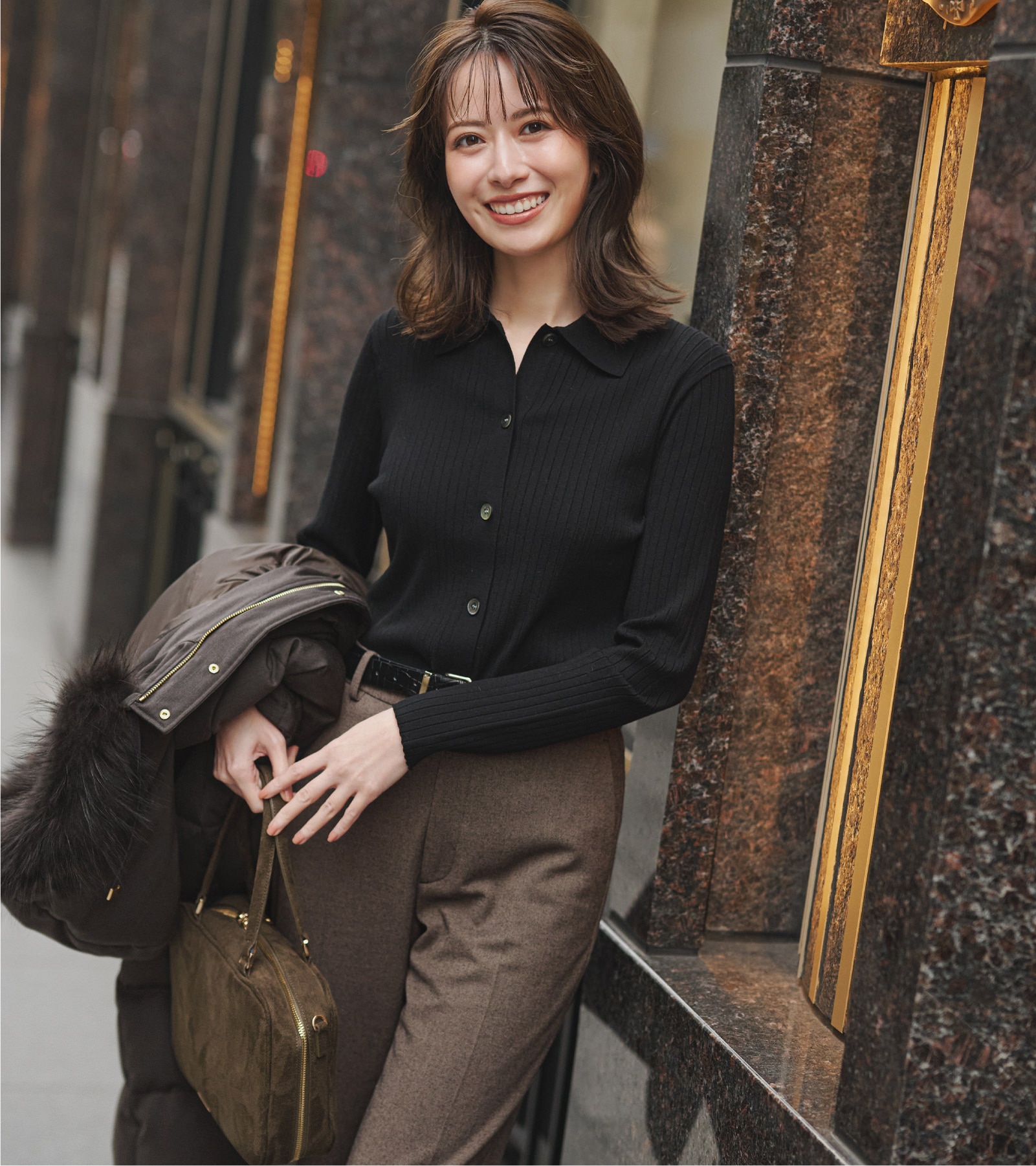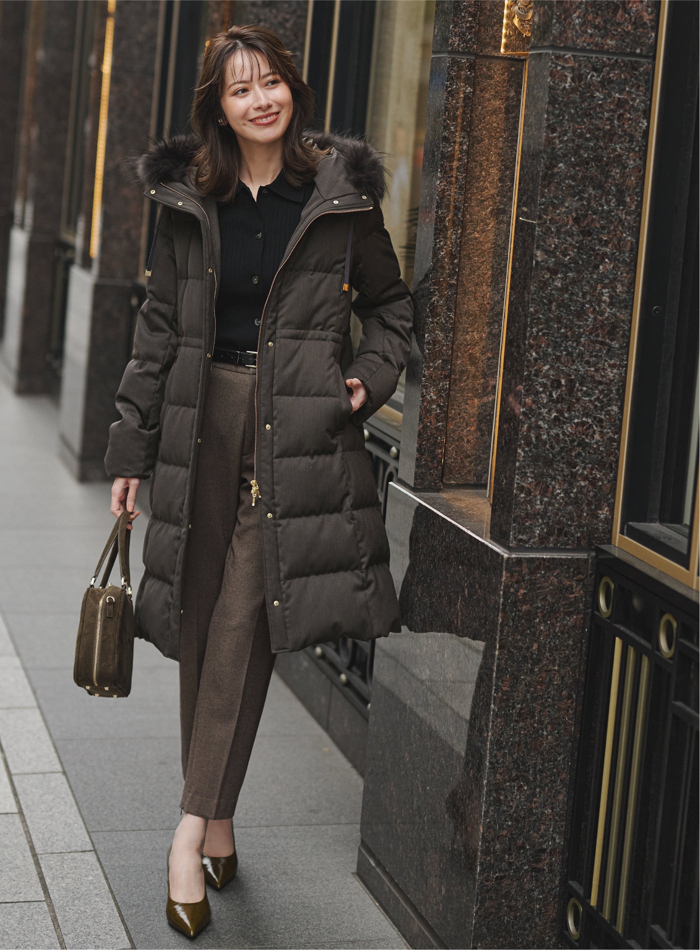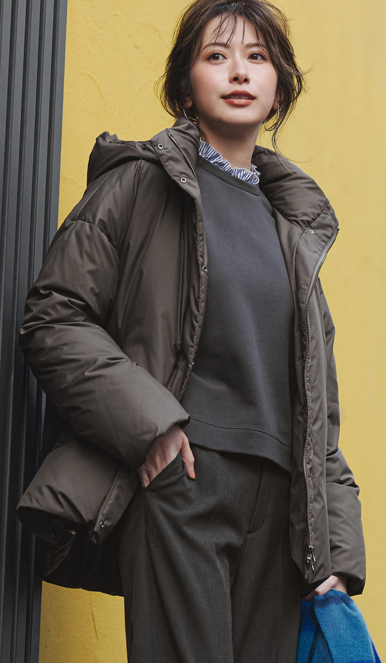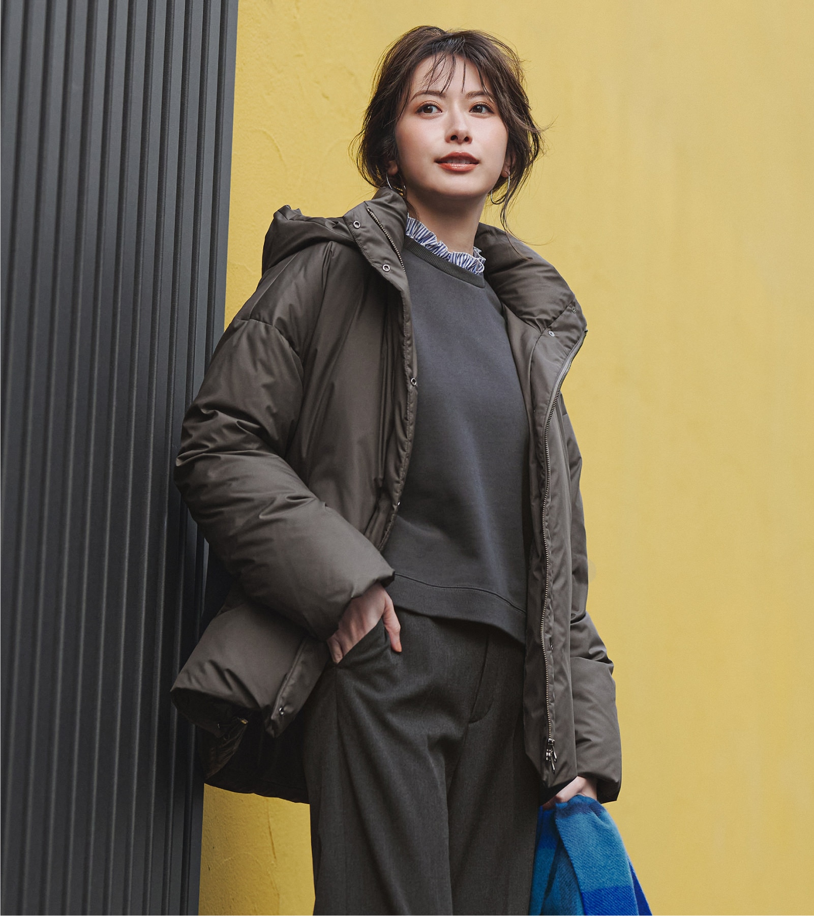 カーキダウンを重ねた配色バランスが美しく、
