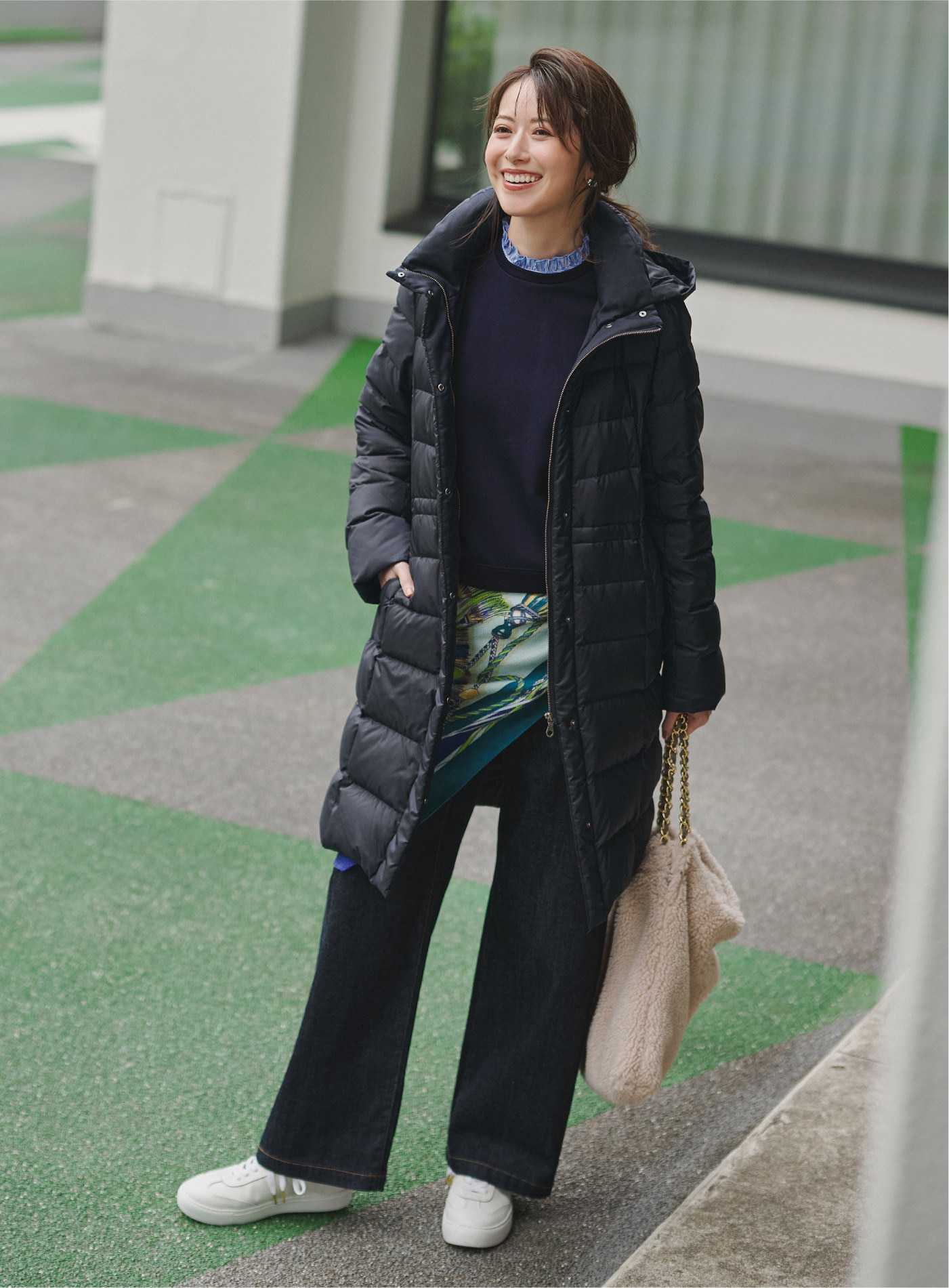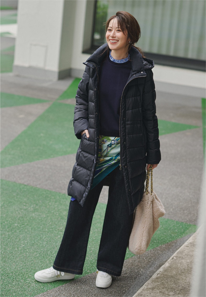 ネイビーデニムとダウンで全体をワントーンにまとめ、