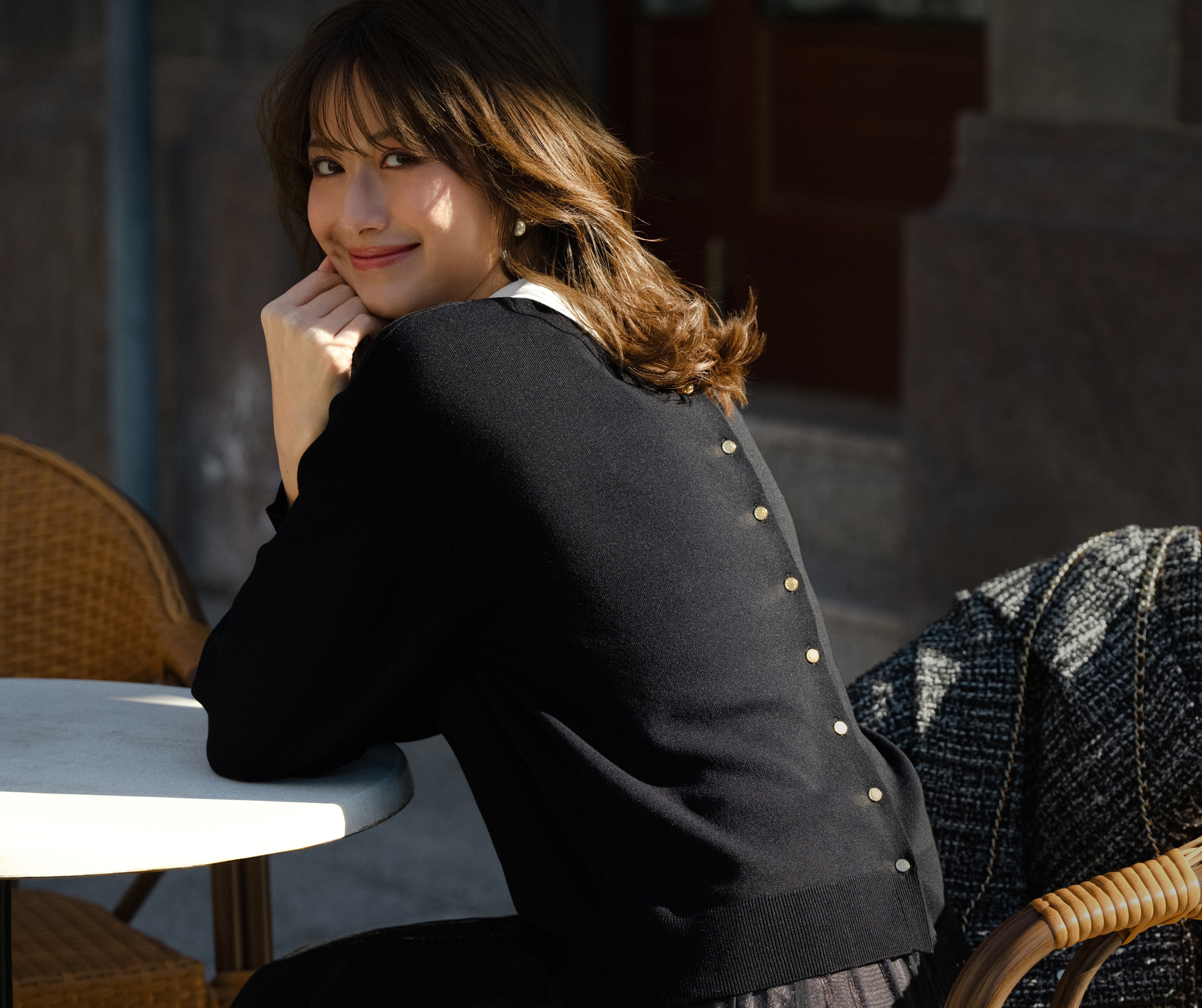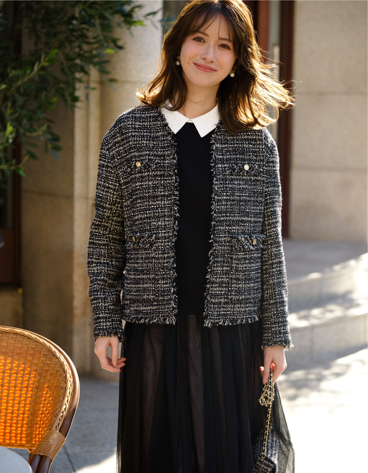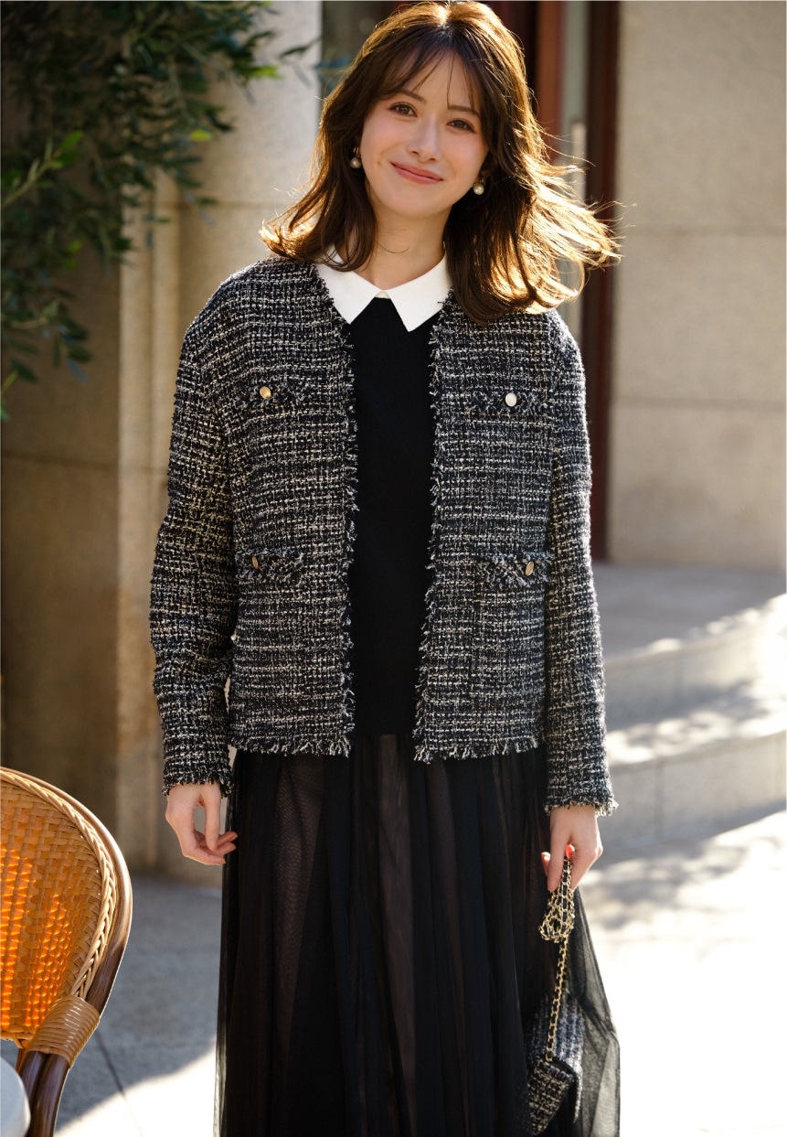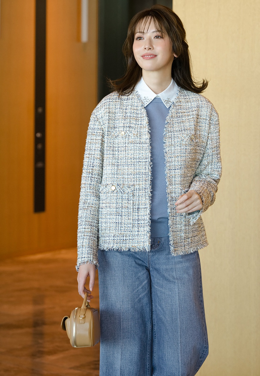 華やかなツイードジャケットとの相性も抜群。