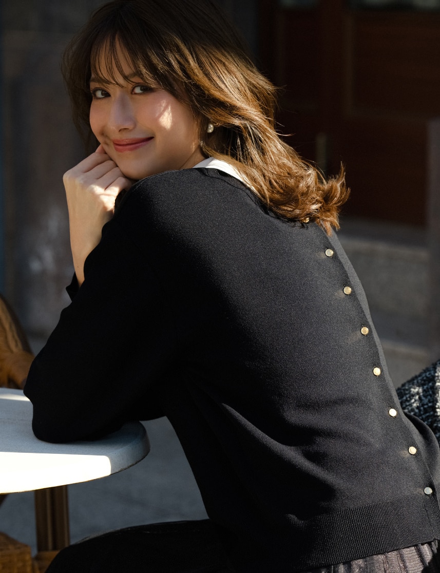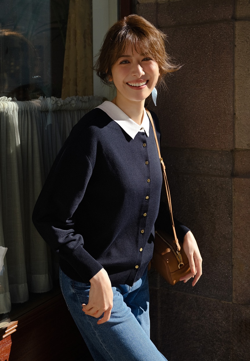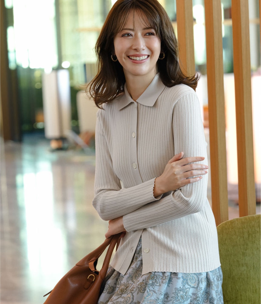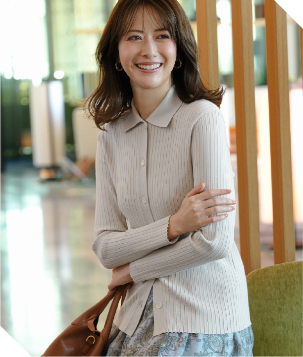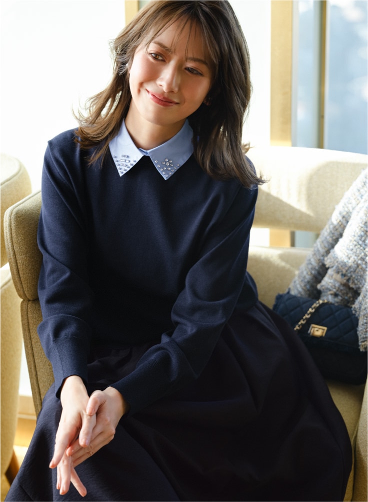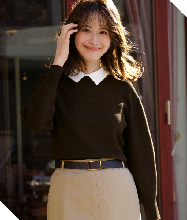 顔まわりを上品に彩る襟付きニット。