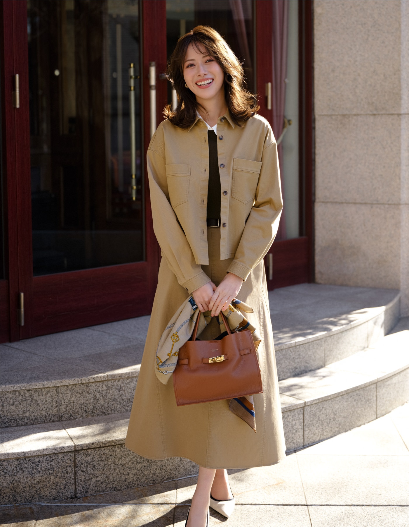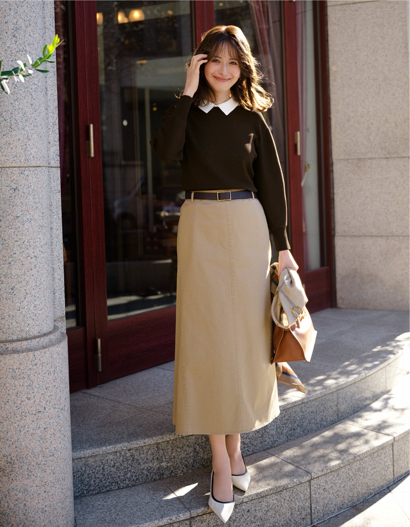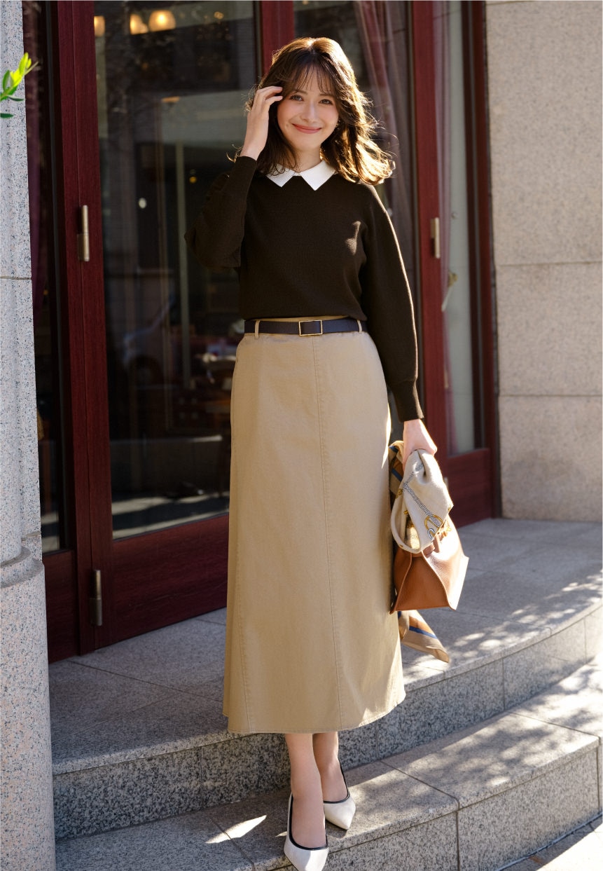 同色系のスカート合わせが上品な印象に。