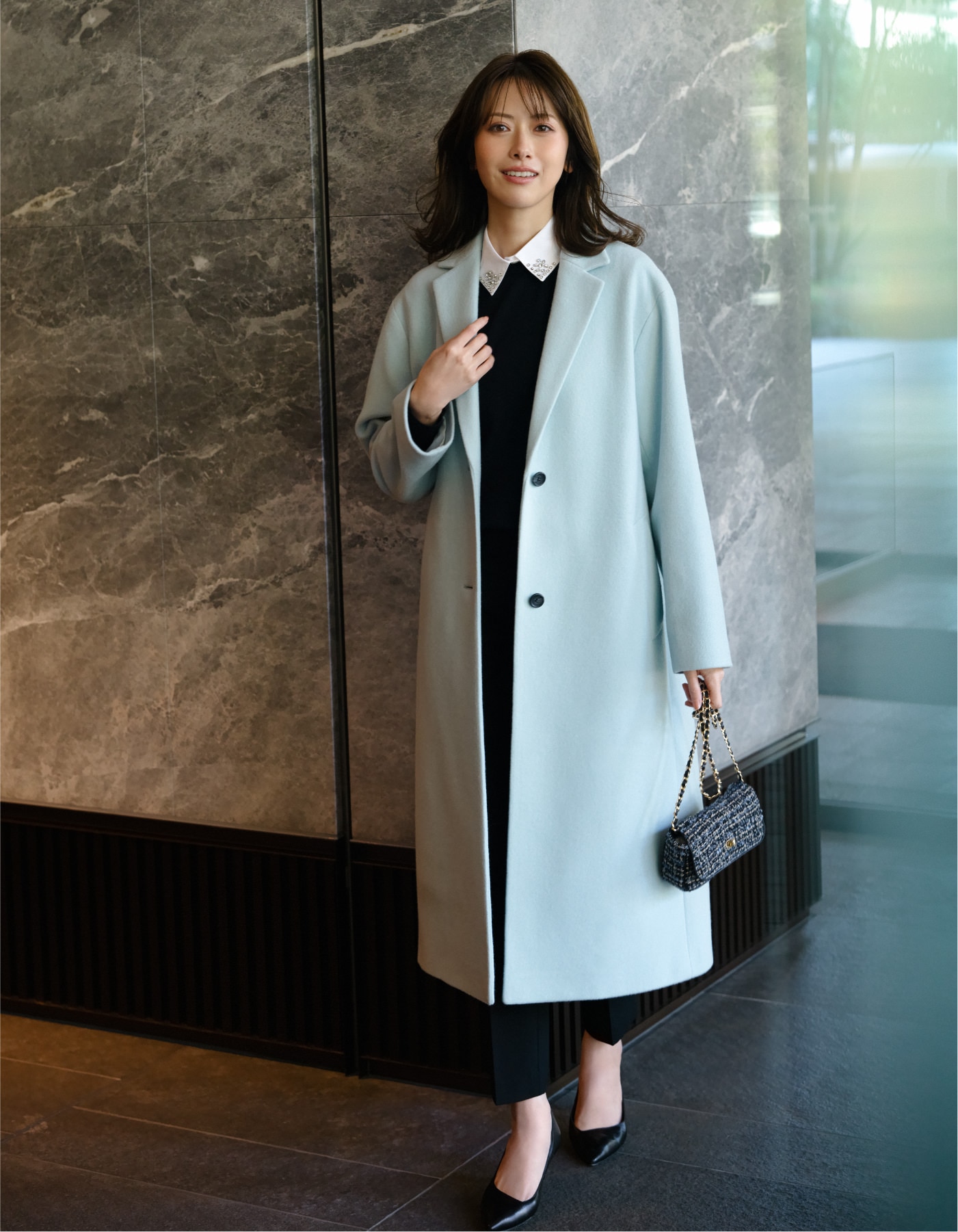 パステルカラーのコートで春らしさも意識して。