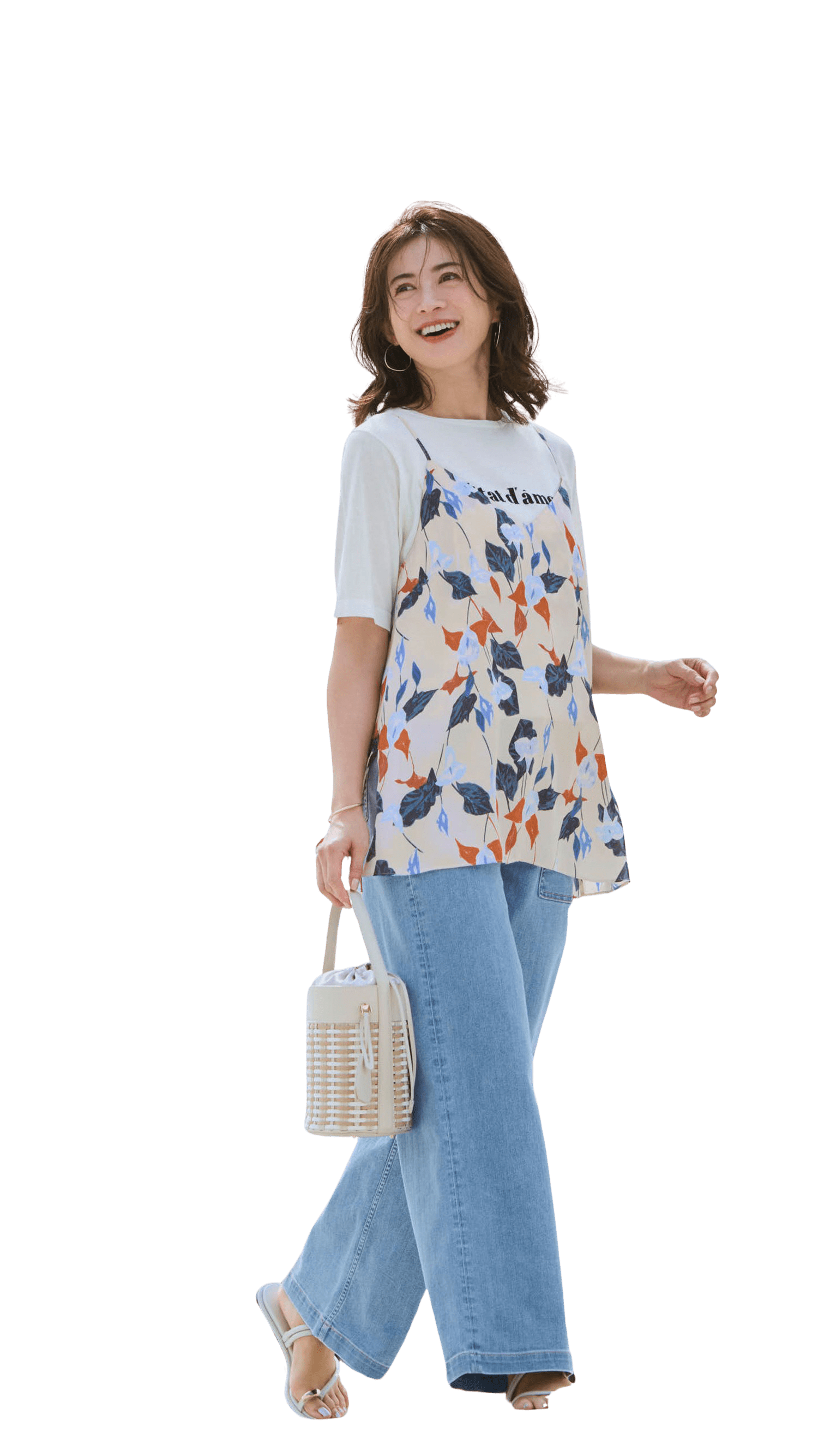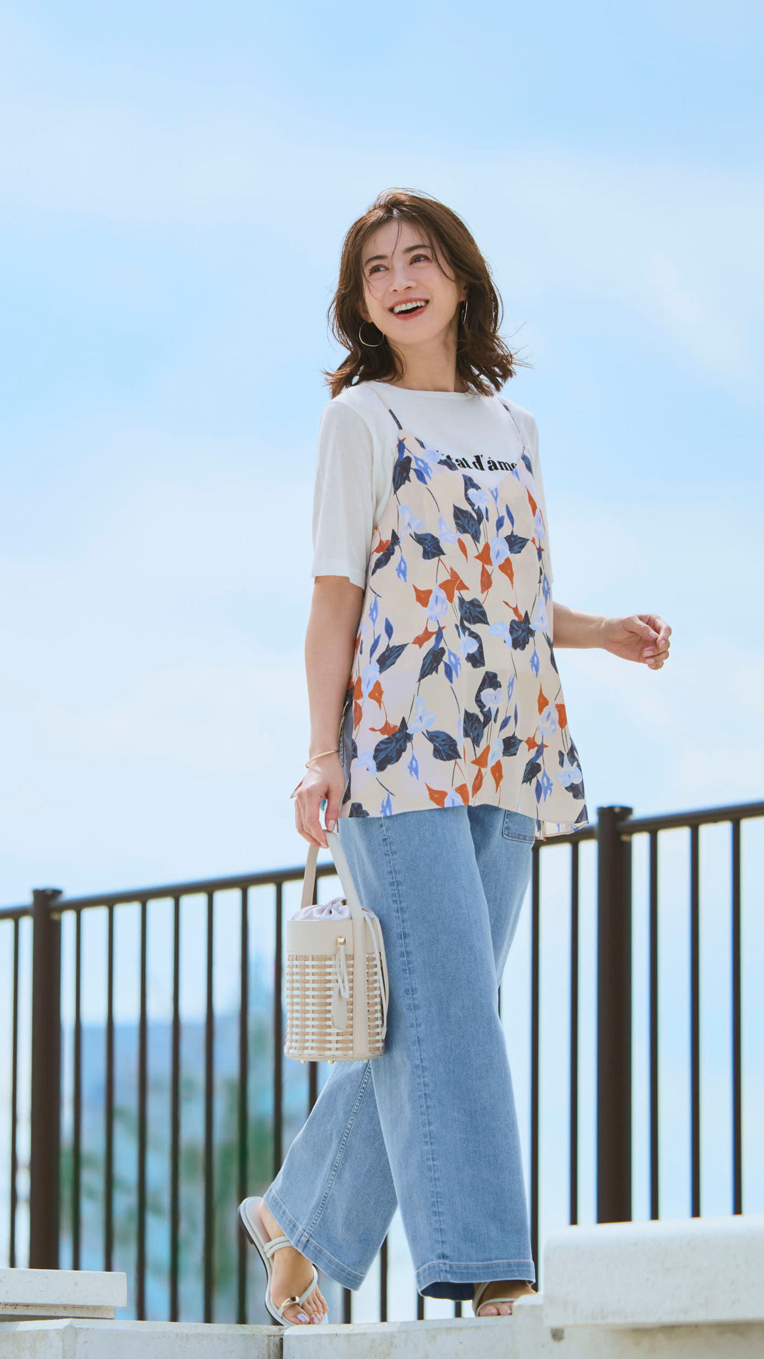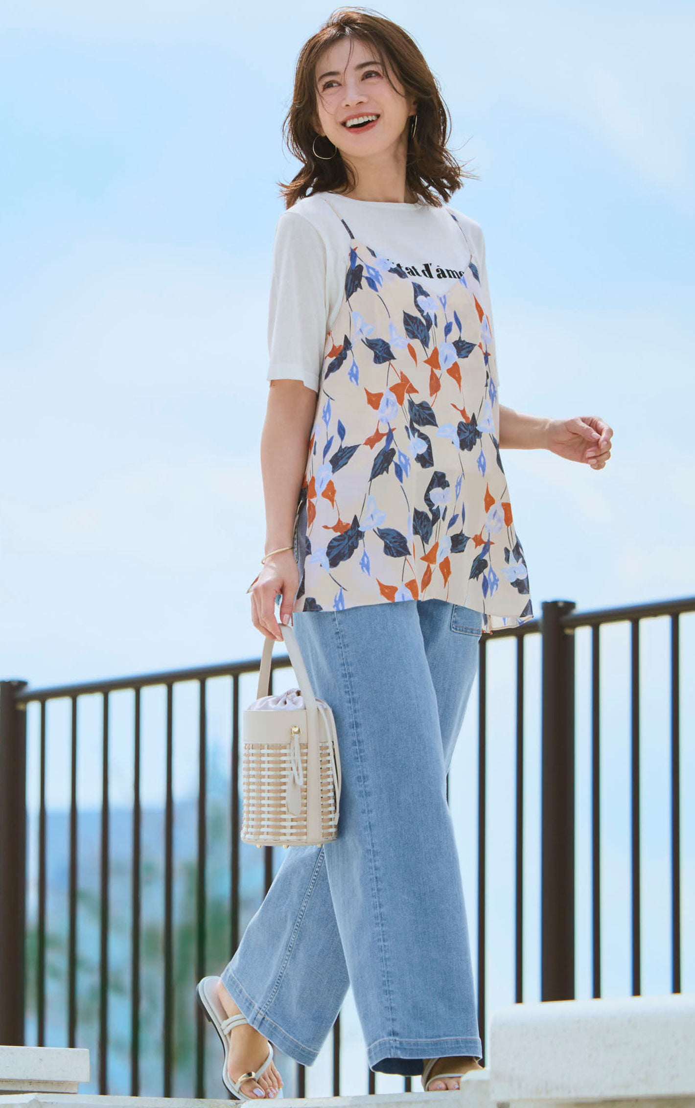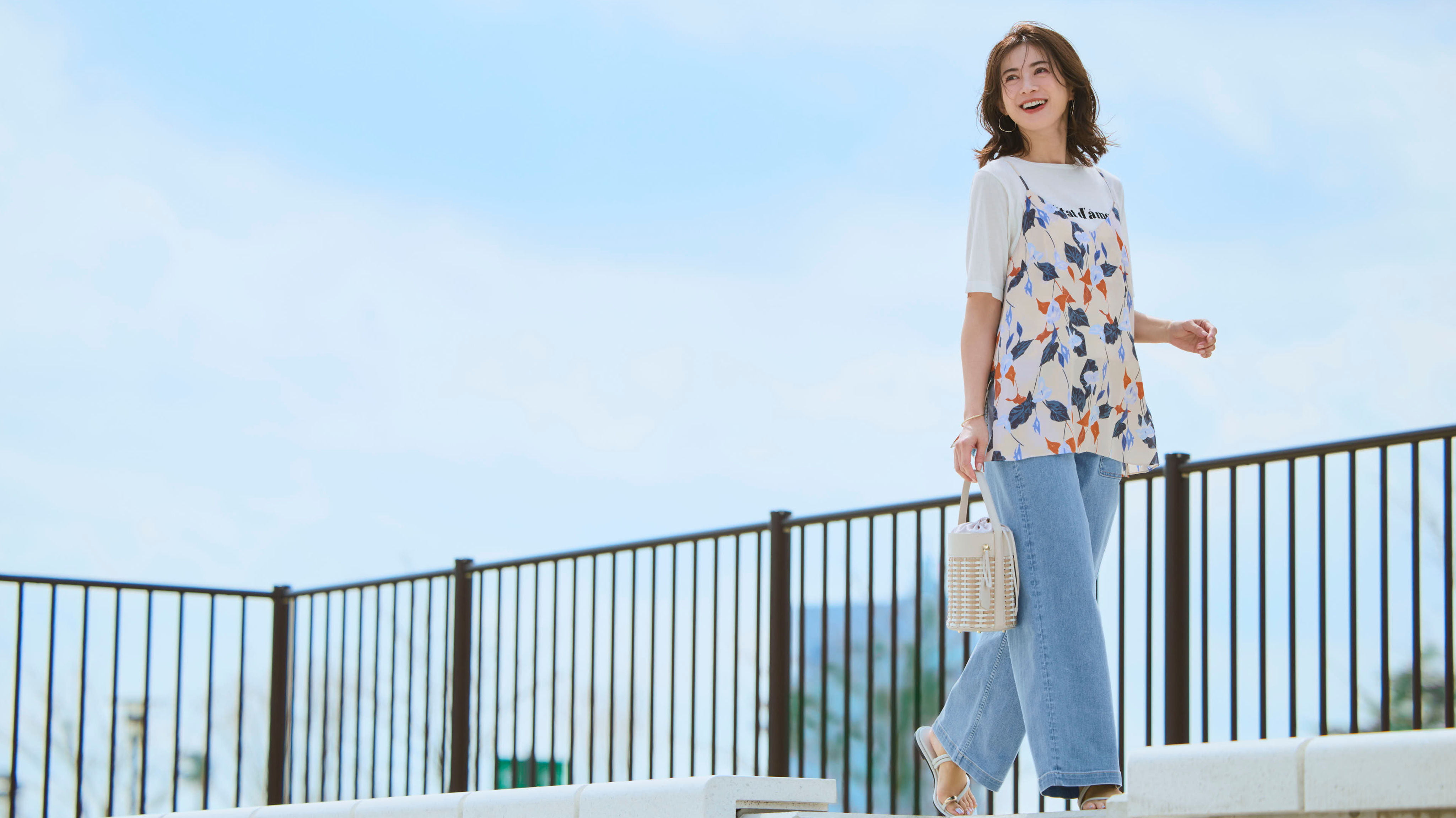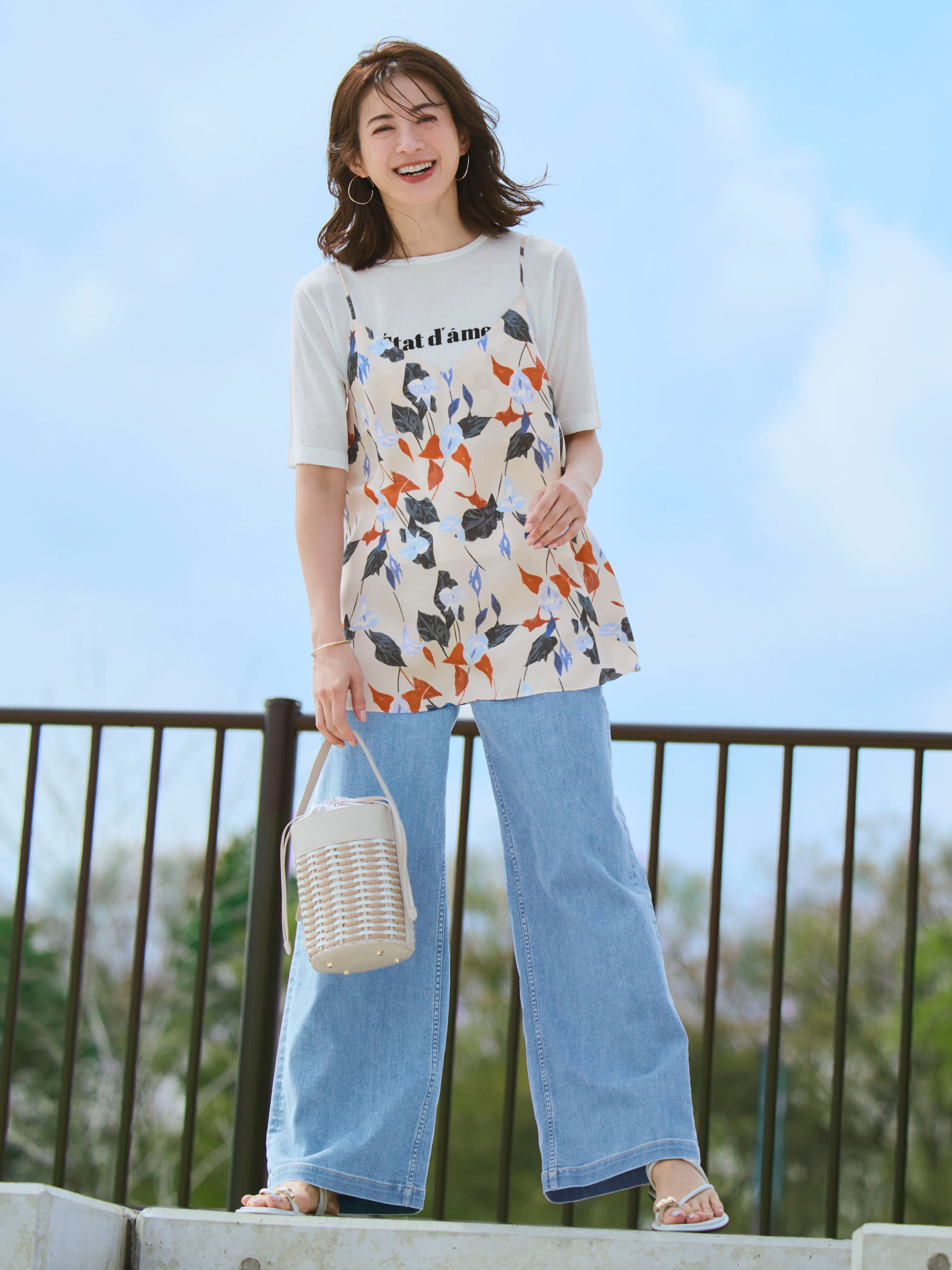 ロゴニットTに花柄キャミを重ねた高揚感あふれる着こなしを、淡いブルーのベイカーが軽快に引き締める。