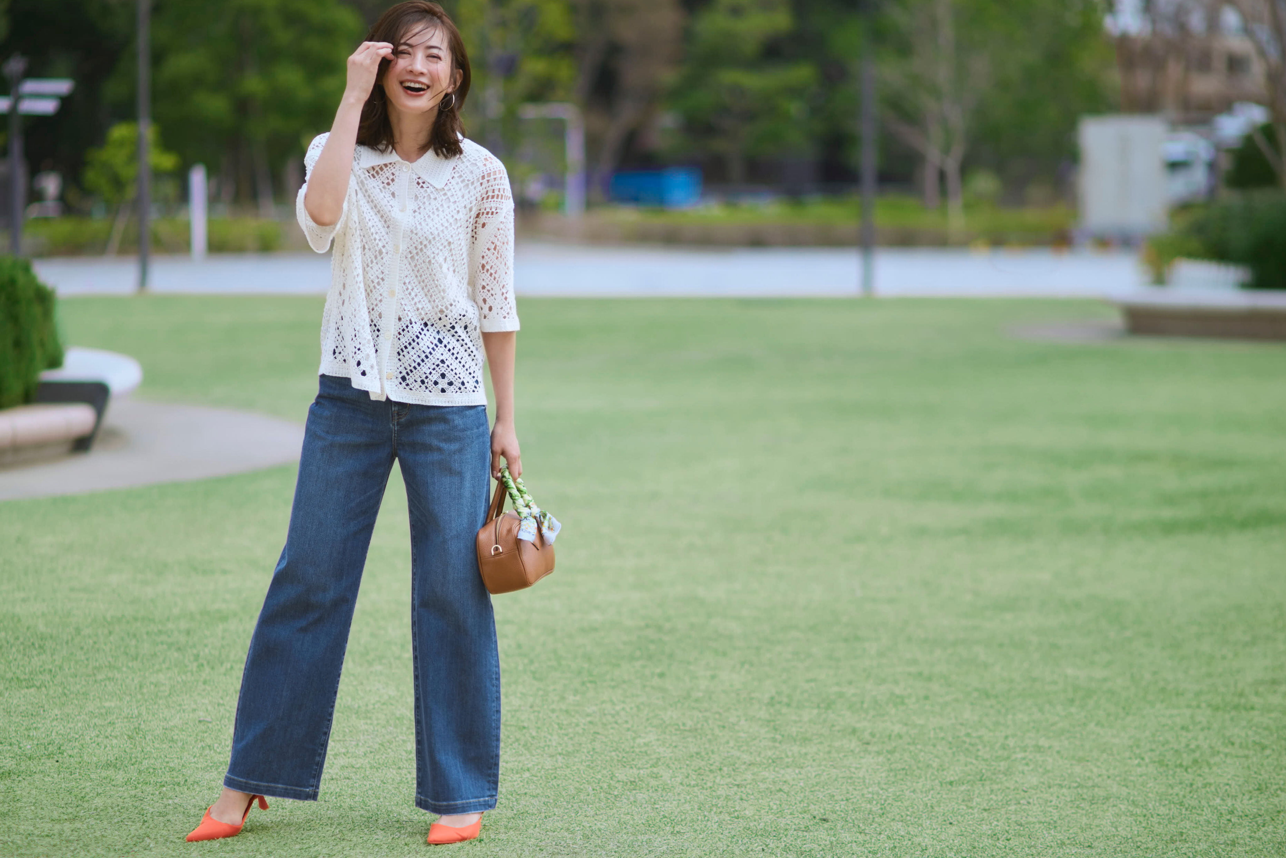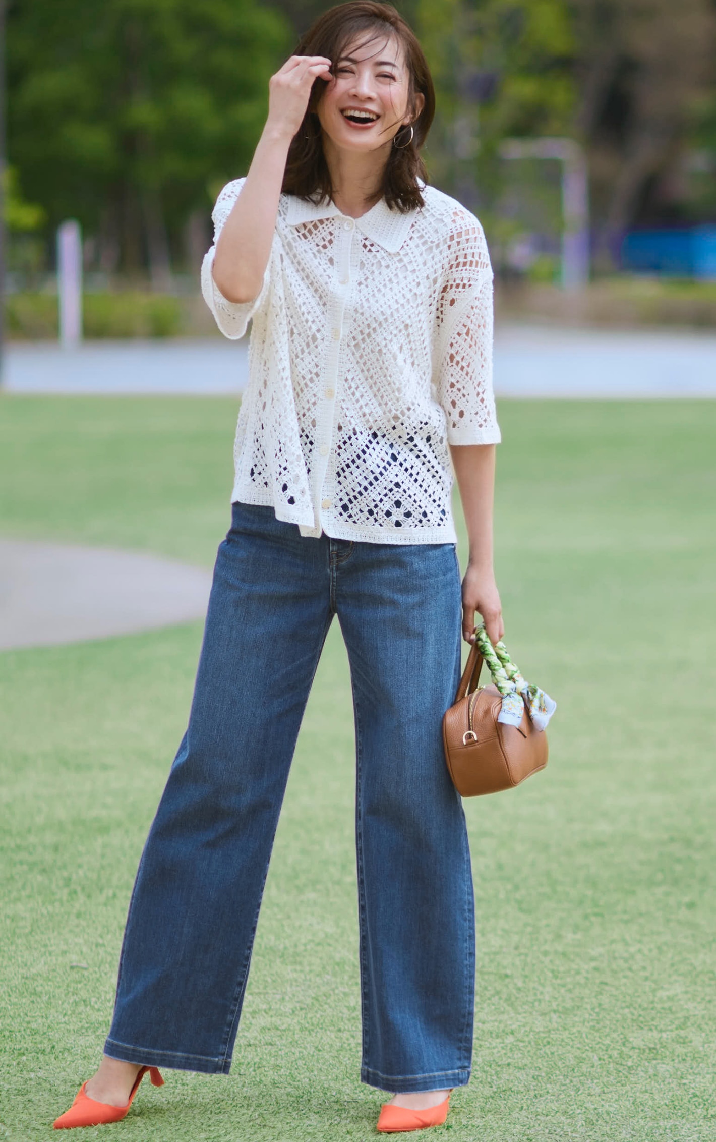鍵編みのヘルシーな抜け感が、涼しげな表情へ。