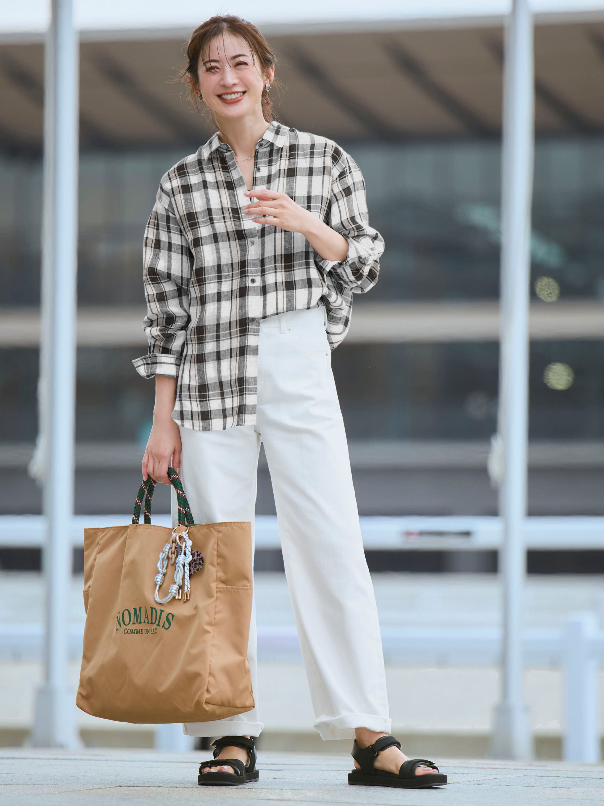 チェックブラウスが主役のコーデ。