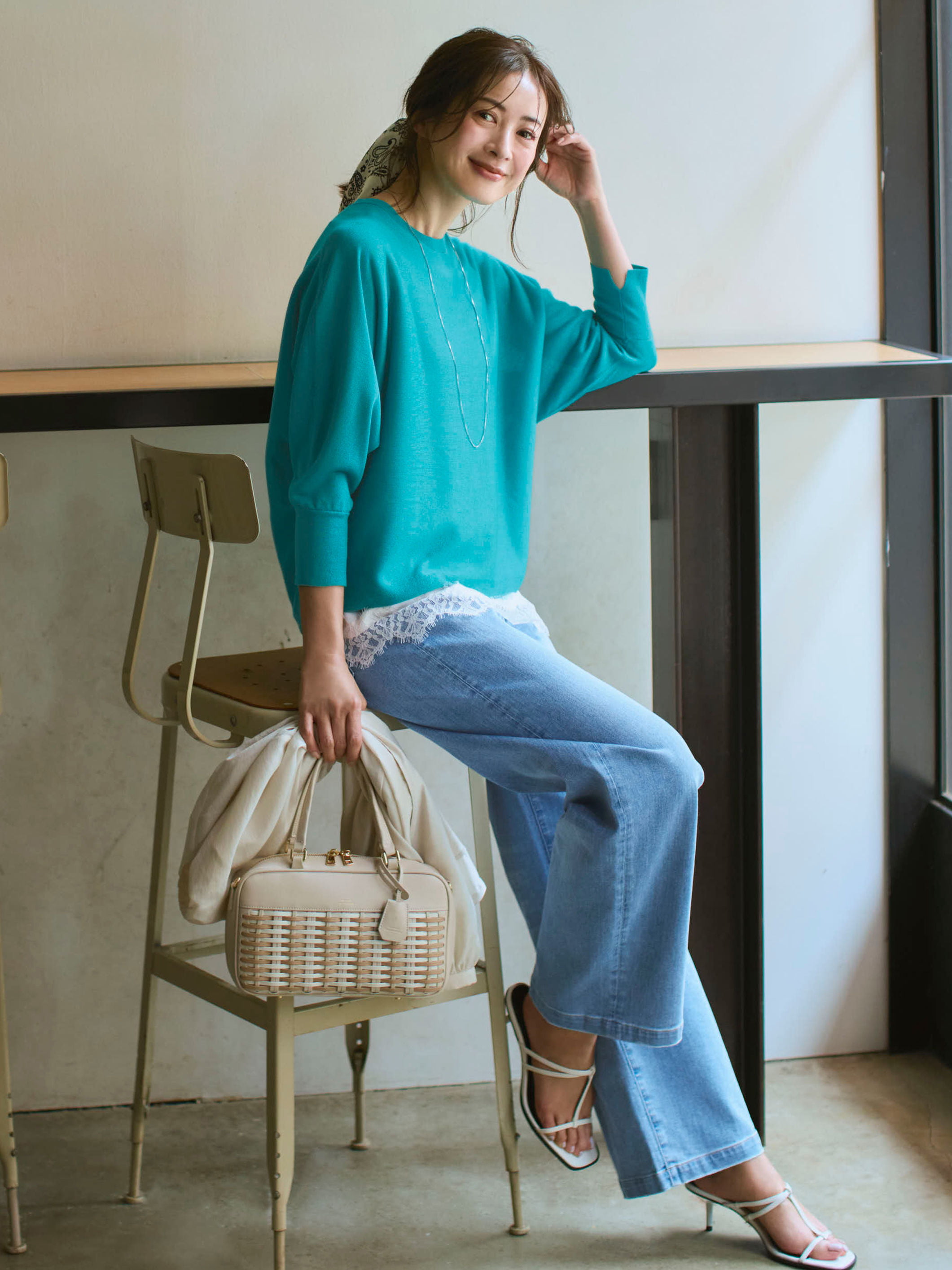 爽やかなエメラルドグリーンに、裾から覗く繊細なレースでフェミニンな奥行きをプラス。
