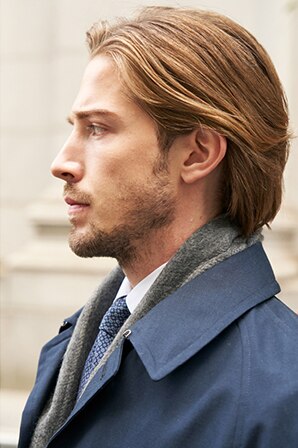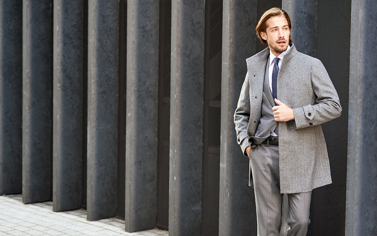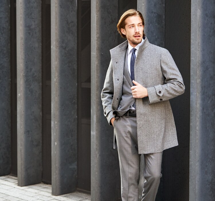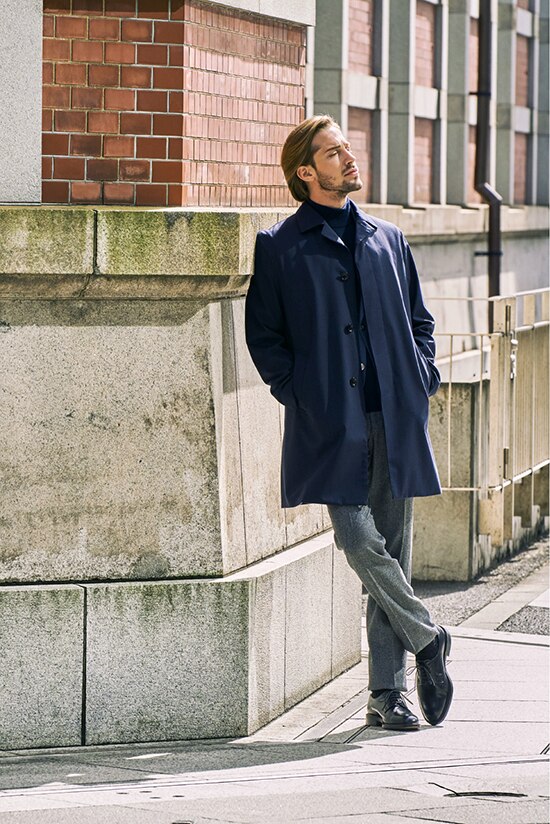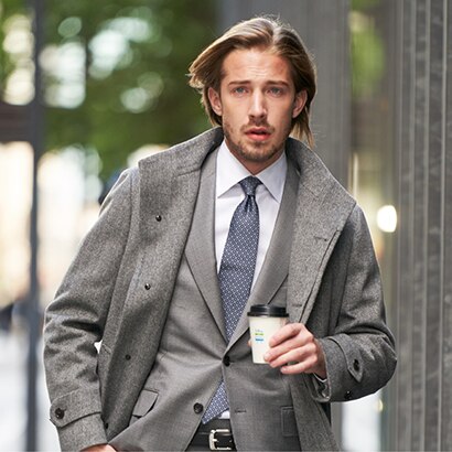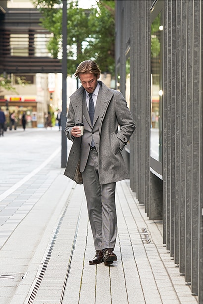 英国紳士を彷彿とさせるスタイリングは、美しい光沢が特徴の素材のチェスターコートと、微柄のセットアップとのコントラストが最高な組み合わせ。「少し早いが、商談に向かうとするか」と足取り軽く一日をスタートさせる。
